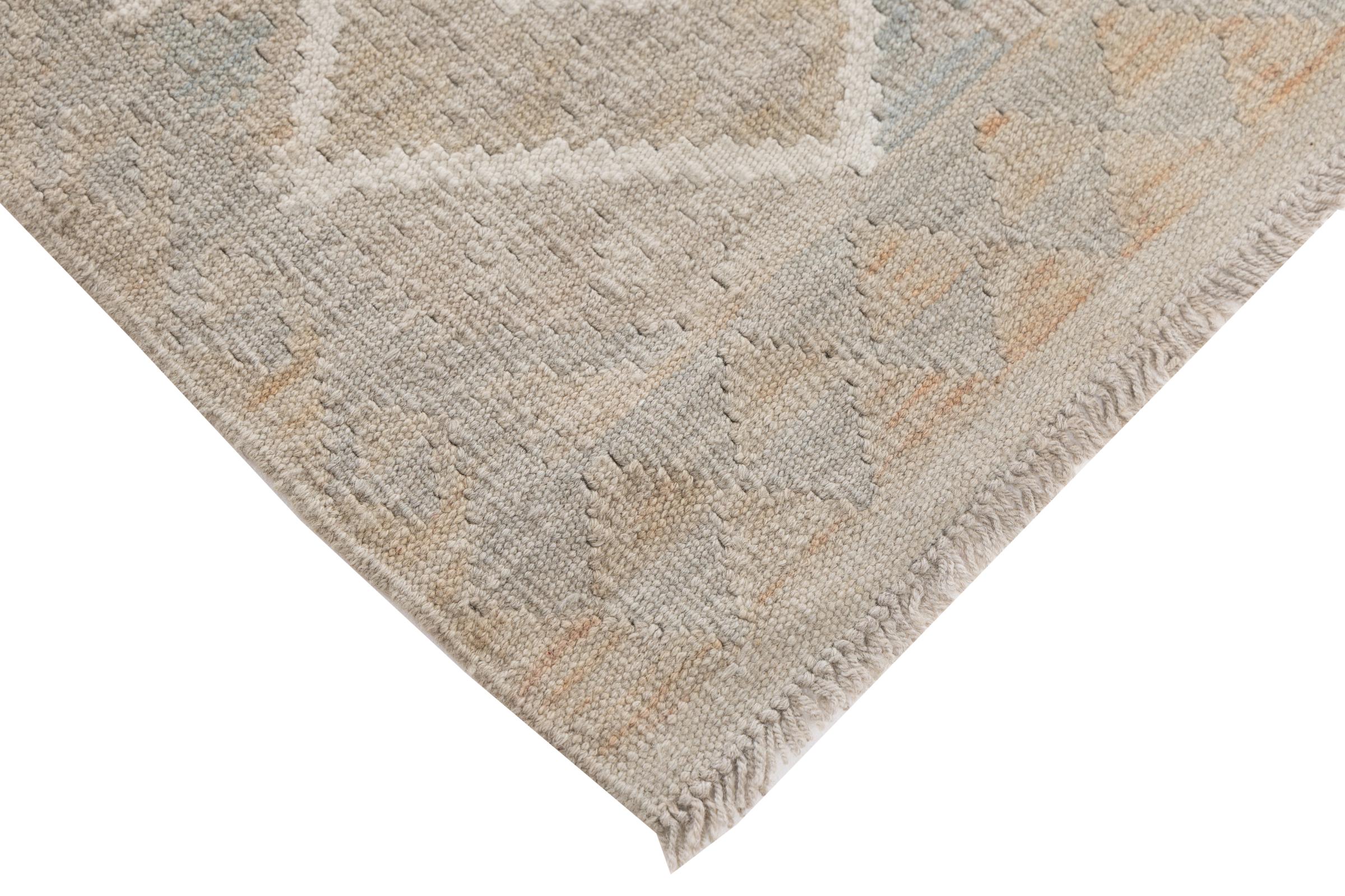 This rug was made as a flat weave by hand on a loom. Flatweave is the term used to describe rugs that have no pile. As the name promises, these rugs are woven and not knotted. This results in a flat rug with a structured surface. Flatweaves are not as soft and usually thinner than knotted rugs. At the same time they are much less complex to manufacture and can usually be laid out from both sides (front and back). Their patterns are usually geometric, which is determined by the fabric.