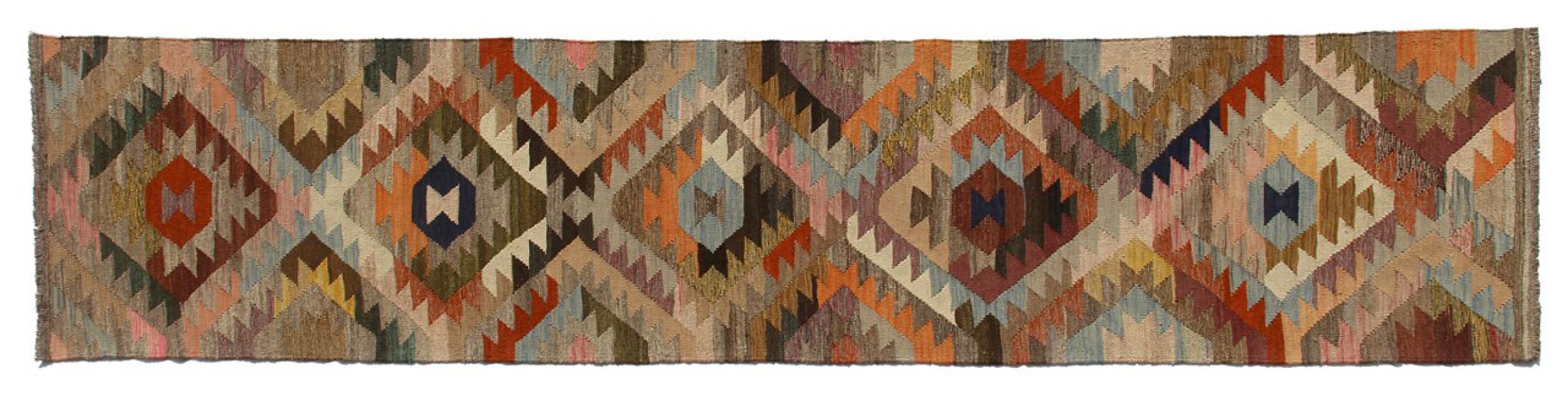 This handwoven Kilim Afghan is a wonderful and unique piece of art. Hard to believe that these modern colours and patterns have already been used centuries ago. This carpet has been woven by hand in old tradition in Afghanistan. It delivers a portion of contemporary history, which you won't find in this specific design a second time. It consists of high-grade natural wool and gives your home a personalised touch.