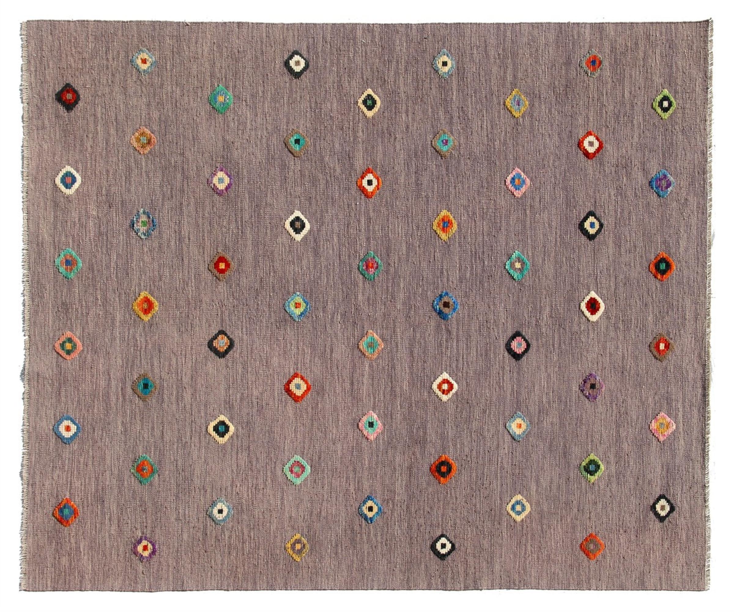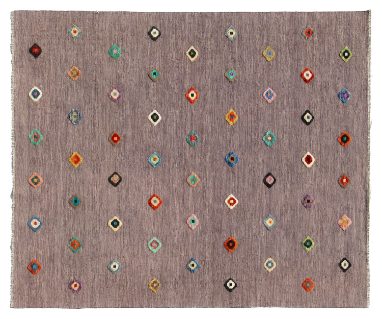 This rug was made as a flat weave by hand on a loom. Flatweave is the term used to describe rugs that have no pile. As the name promises, these rugs are woven and not knotted. This results in a flat rug with a structured surface. Flatweaves are not as soft and usually thinner than knotted rugs. At the same time they are much less complex to manufacture and can usually be laid out from both sides (front and back). Their patterns are usually geometric, which is determined by the fabric.