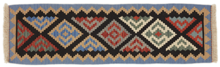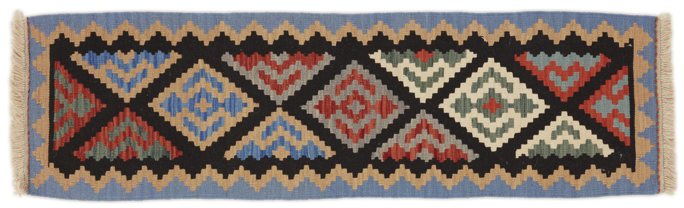 This rug was made as a flat weave by hand on a loom. Flatweave is the term used to describe rugs that have no pile. As the name promises, these rugs are woven and not knotted. This results in a flat rug with a structured surface. Flatweaves are not as soft and usually thinner than knotted rugs. At the same time they are much less complex to manufacture and can usually be laid out from both sides (front and back). Their patterns are usually geometric, which is determined by the fabric.