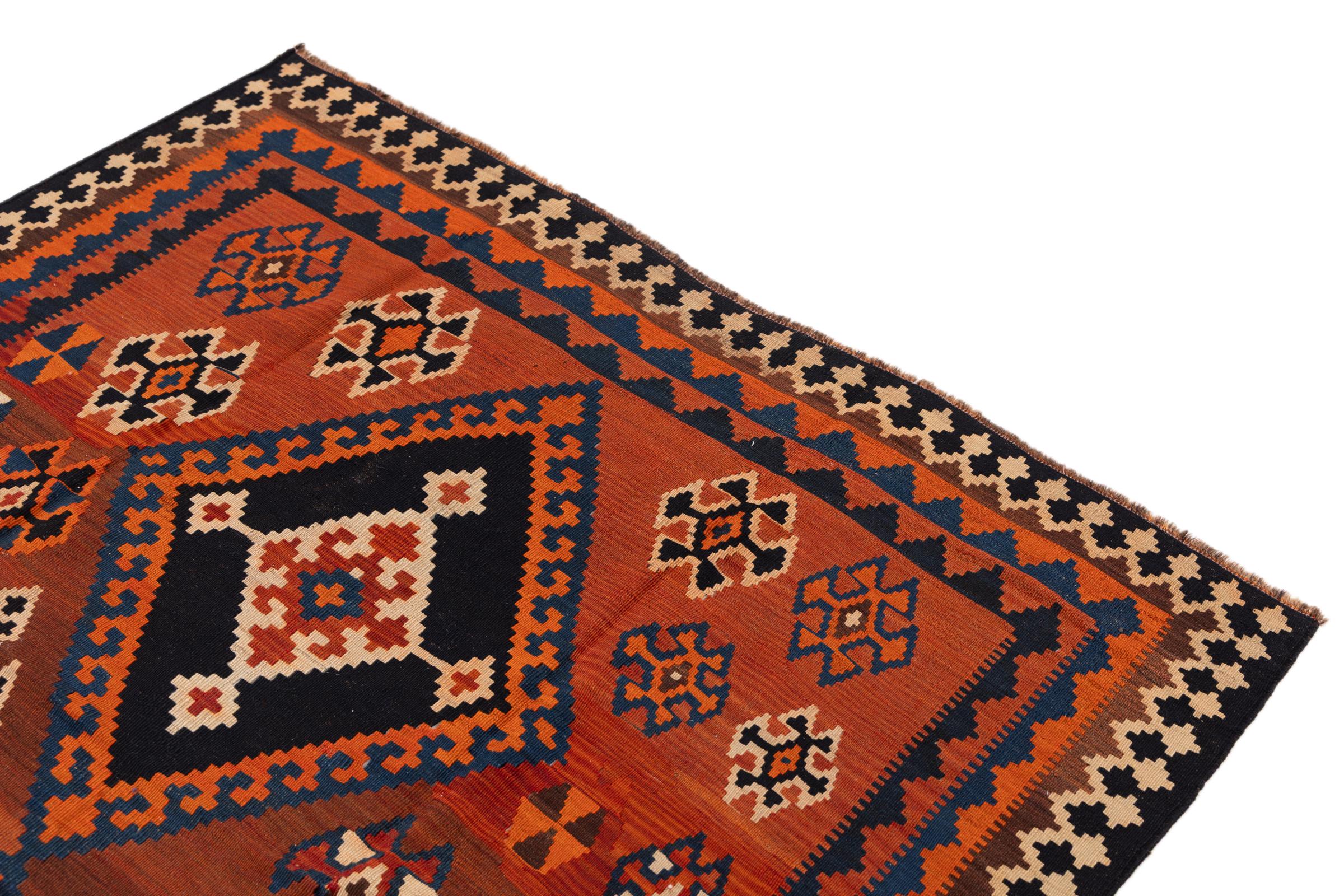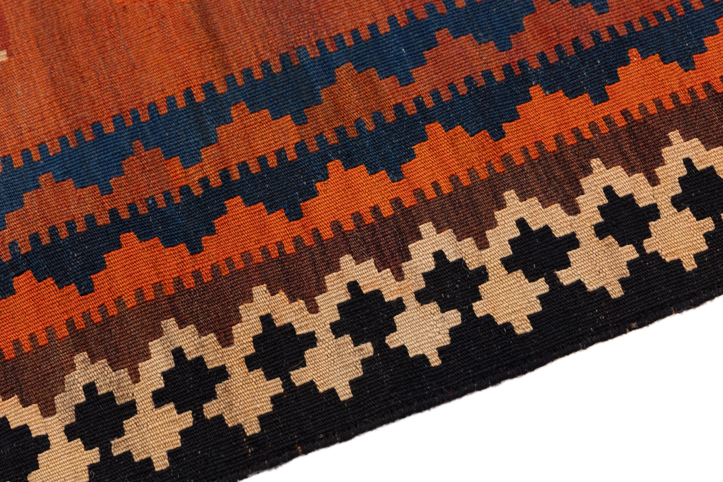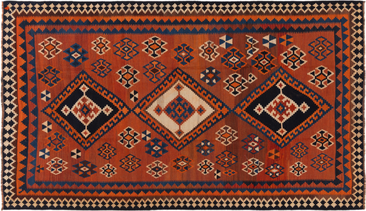 This handwoven Kilim Fars combines Persian patterns with the old tradition of flat fabrics. It represents a beautiful composition of contemporary Persian elements and a modern style. Due to the carpet's geometric patterns and its warm colours, this type of rug is extremely popular in modern interior magazines. Additionally, this Kilim can be used in many different ways. Whether you would like to use it as a bed cover or as a carpet in front of your sofa – a Kilim Fars fulfils nearly all wishes.