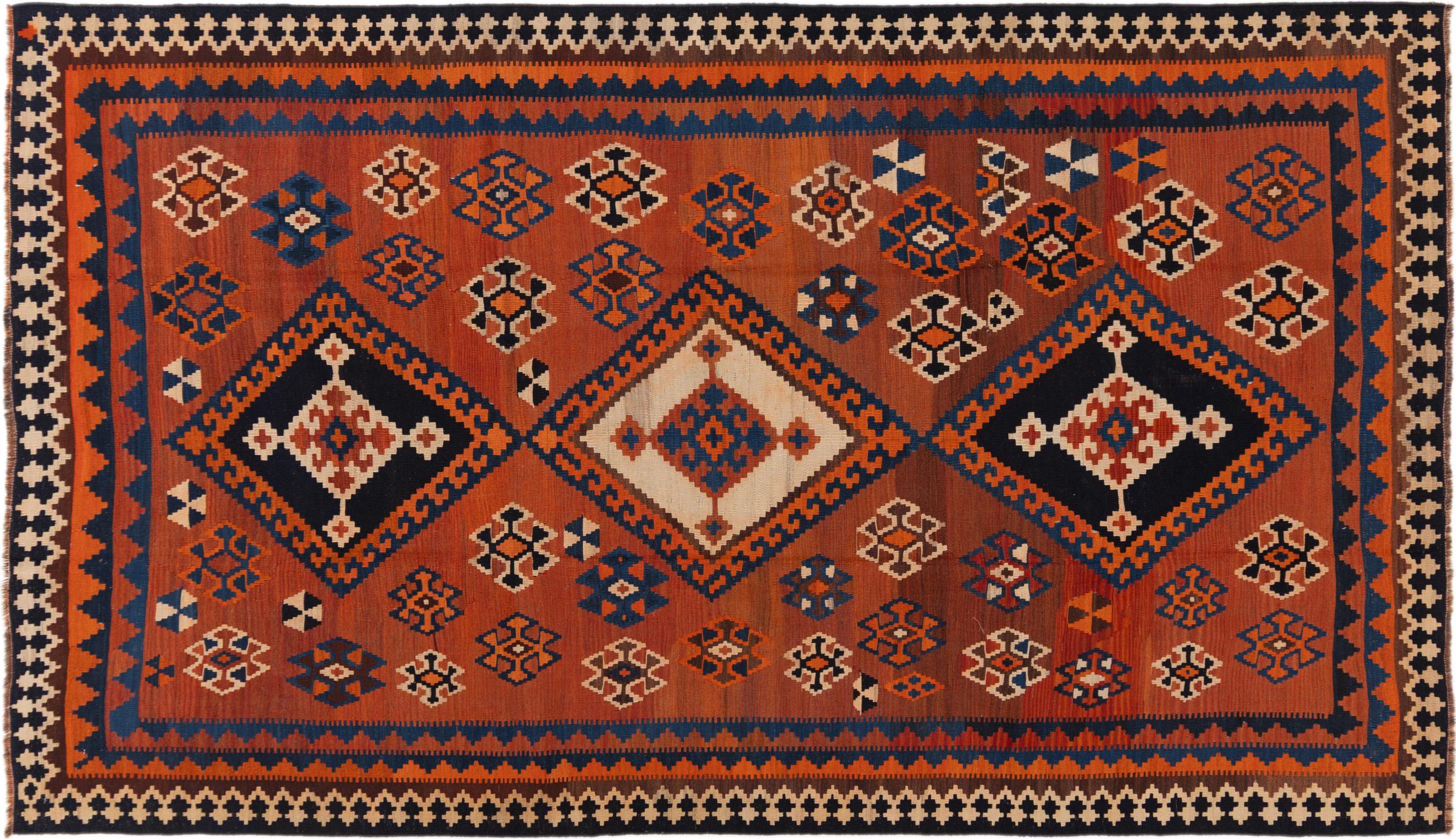 This rug was made as a flat weave by hand on a loom. Flatweave is the term used to describe rugs that have no pile. As the name promises, these rugs are woven and not knotted. This results in a flat rug with a structured surface. Flatweaves are not as soft and usually thinner than knotted rugs. At the same time they are much less complex to manufacture and can usually be laid out from both sides (front and back). Their patterns are usually geometric, which is determined by the fabric.