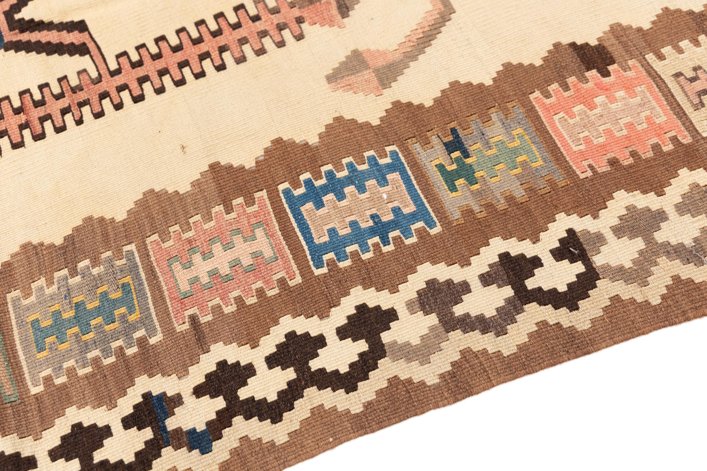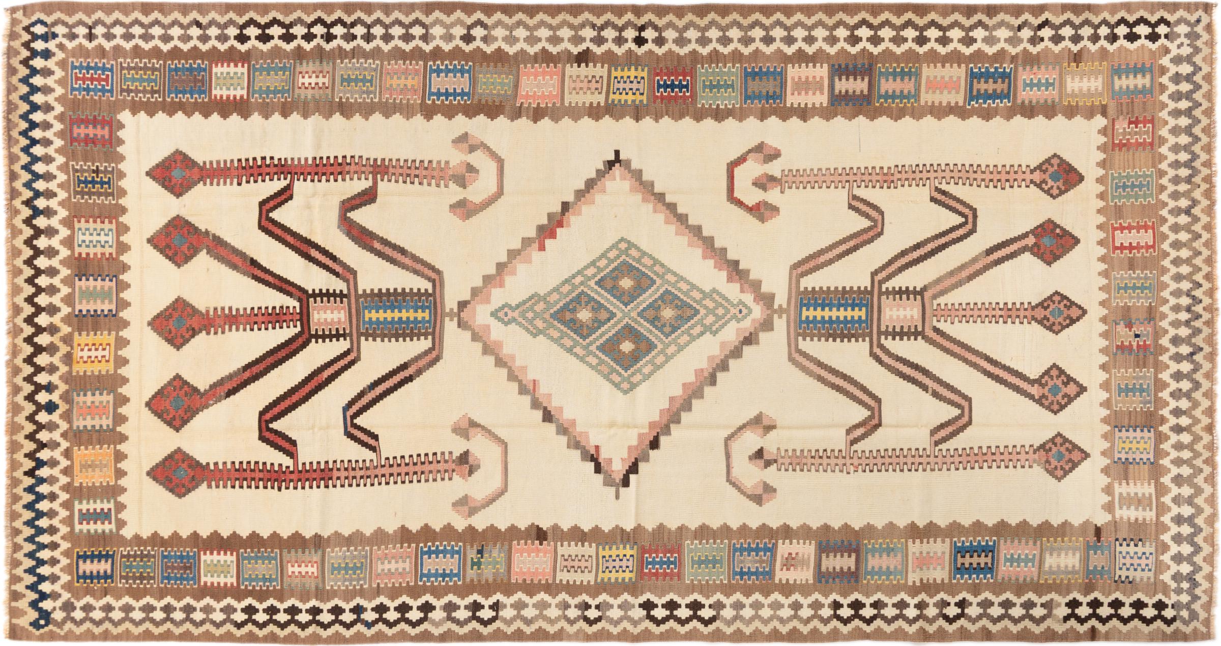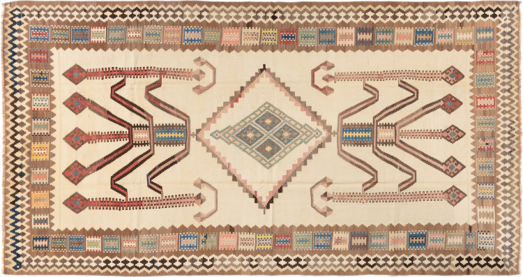 This handwoven Kilim Fars combines Persian patterns with the old tradition of flat fabrics. It represents a beautiful composition of contemporary Persian elements and a modern style. Due to the carpet's geometric patterns and its warm colours, this type of rug is extremely popular in modern interior magazines. Additionally, this Kilim can be used in many different ways. Whether you would like to use it as a bed cover or as a carpet in front of your sofa – a Kilim Fars fulfils nearly all wishes.