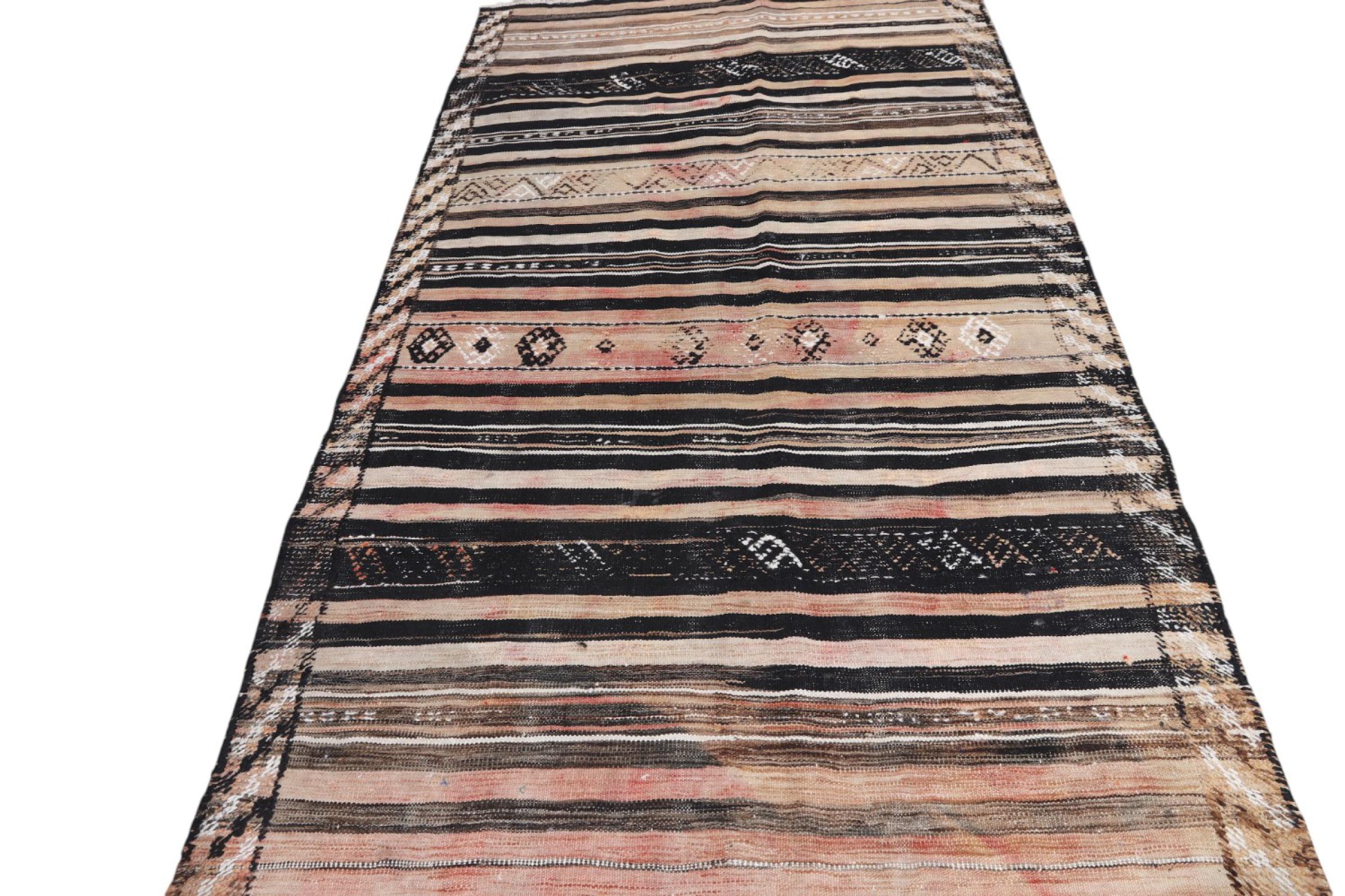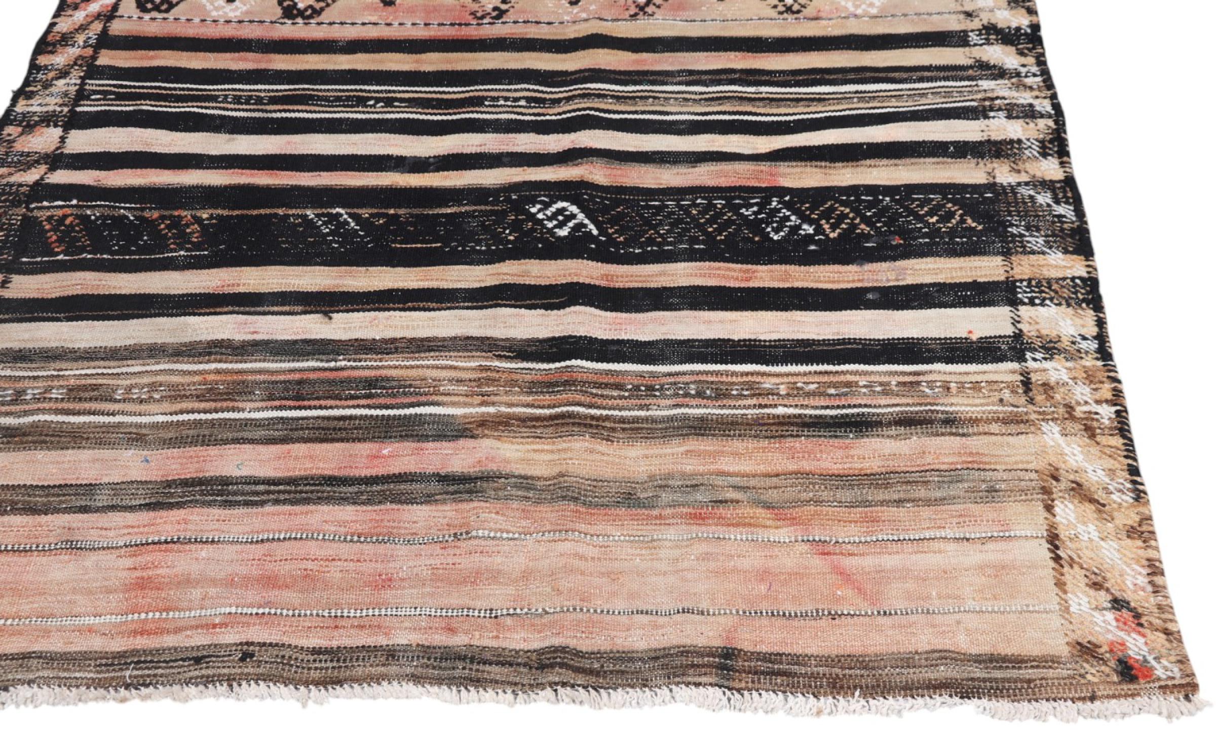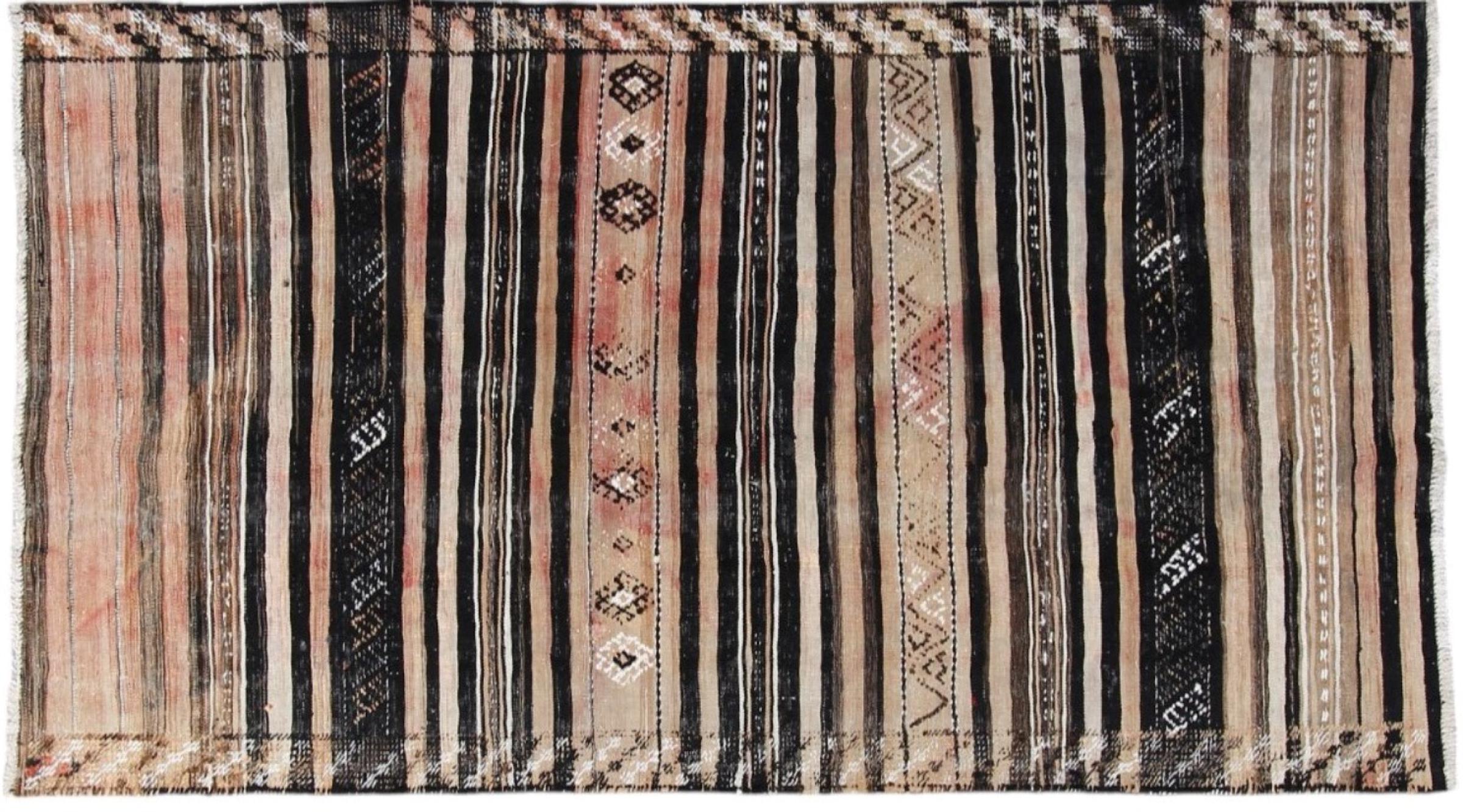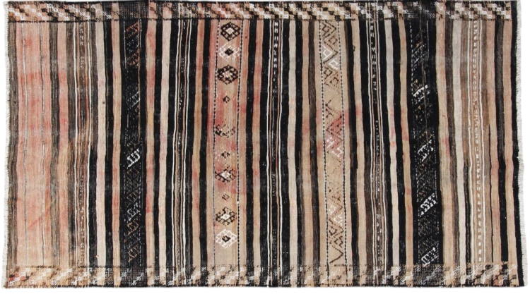 This rug was made as a flat weave by hand on a loom. Flatweave is the term used to describe rugs that have no pile. As the name promises, these rugs are woven and not knotted. This results in a flat rug with a structured surface. Flatweaves are not as soft and usually thinner than knotted rugs. At the same time they are much less complex to manufacture and can usually be laid out from both sides (front and back). Their patterns are usually geometric, which is determined by the fabric.