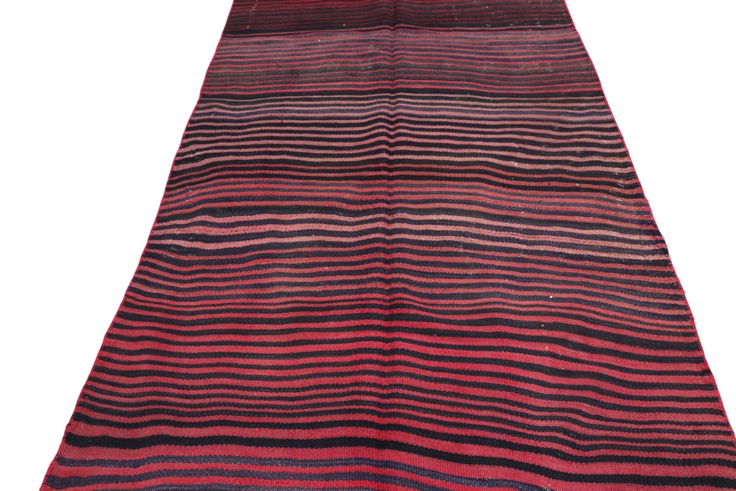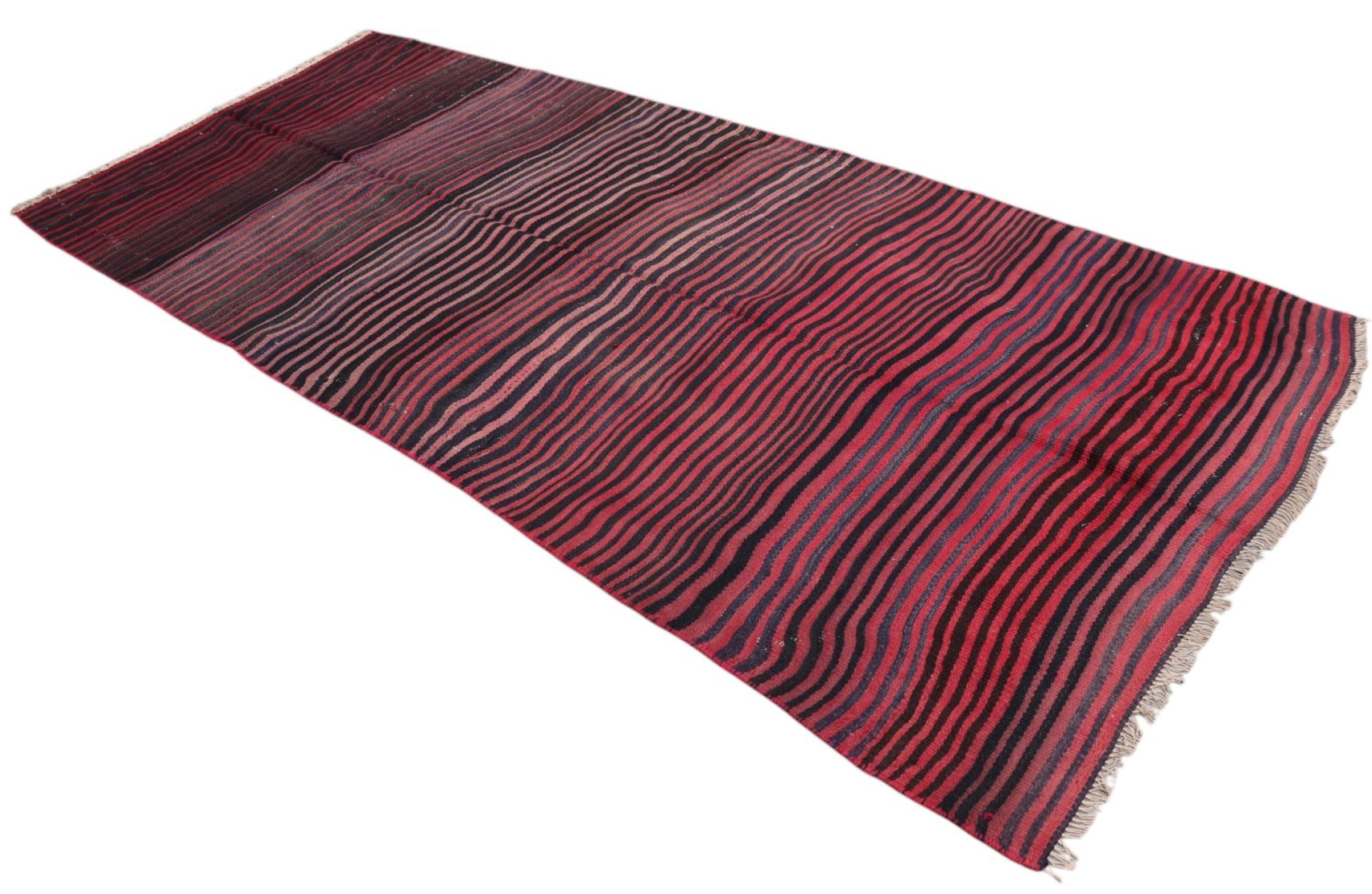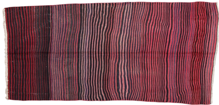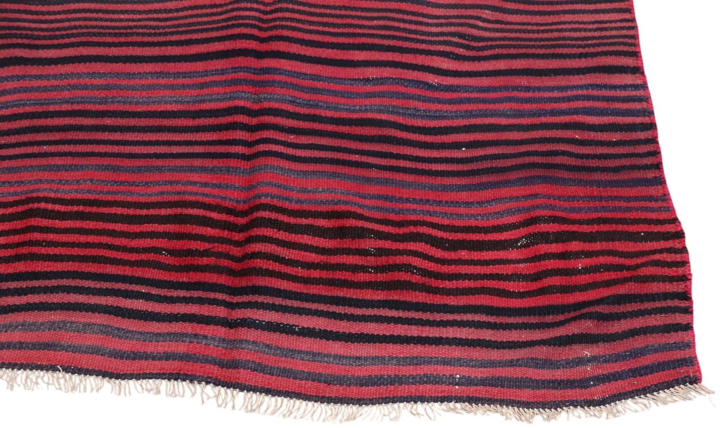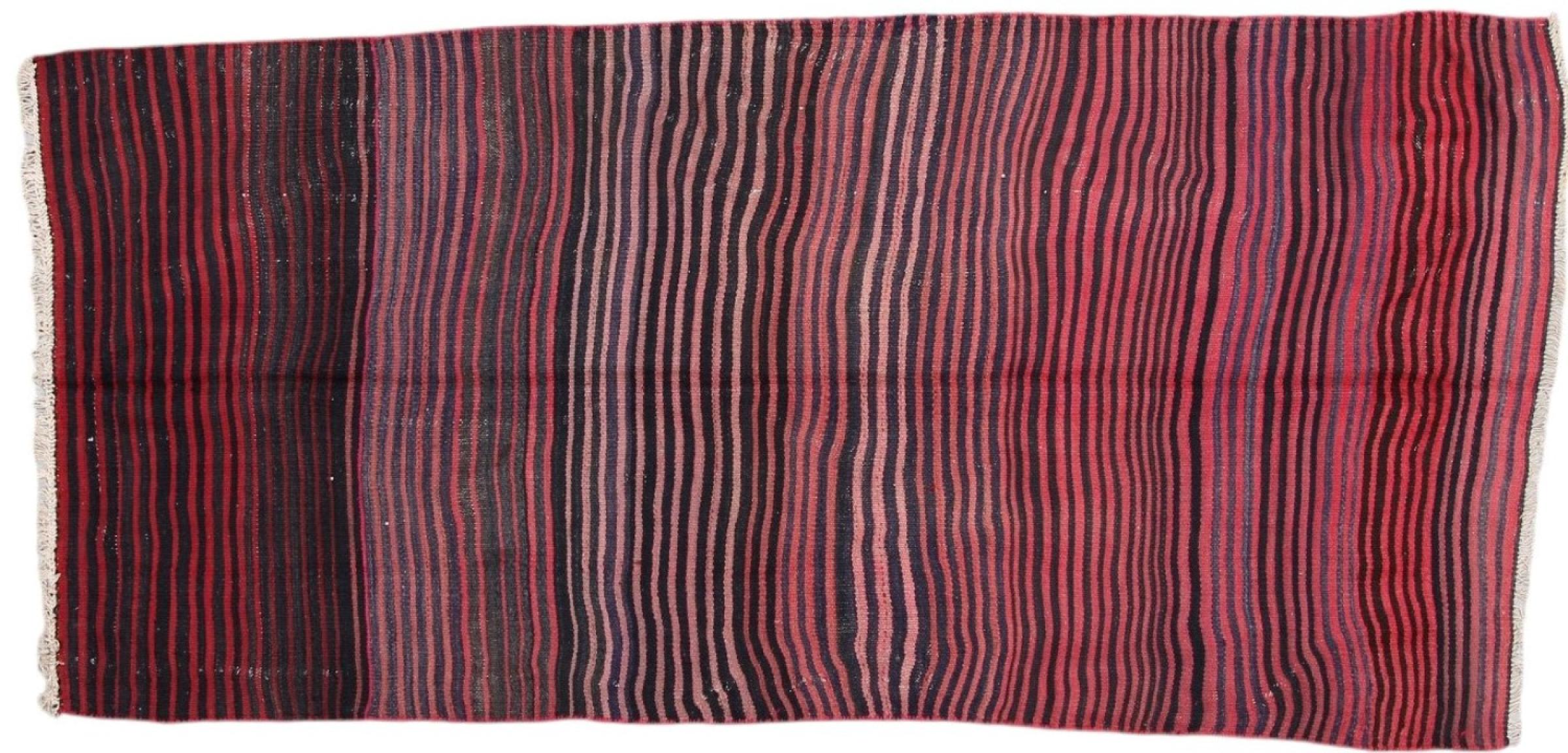 This rug was made as a flat weave by hand on a loom. Flatweave is the term used to describe rugs that have no pile. As the name promises, these rugs are woven and not knotted. This results in a flat rug with a structured surface. Flatweaves are not as soft and usually thinner than knotted rugs. At the same time they are much less complex to manufacture and can usually be laid out from both sides (front and back). Their patterns are usually geometric, which is determined by the fabric.