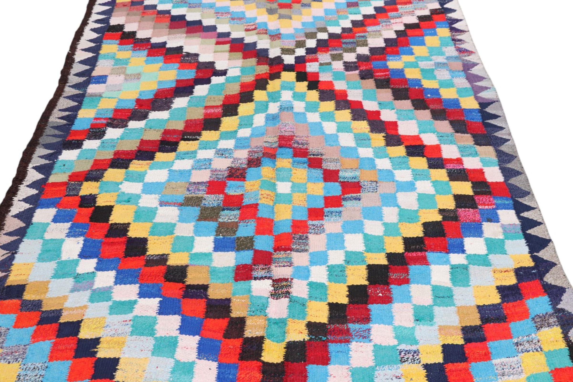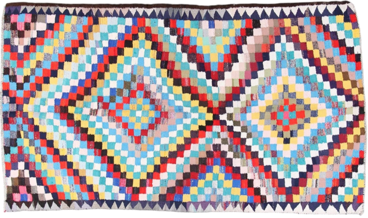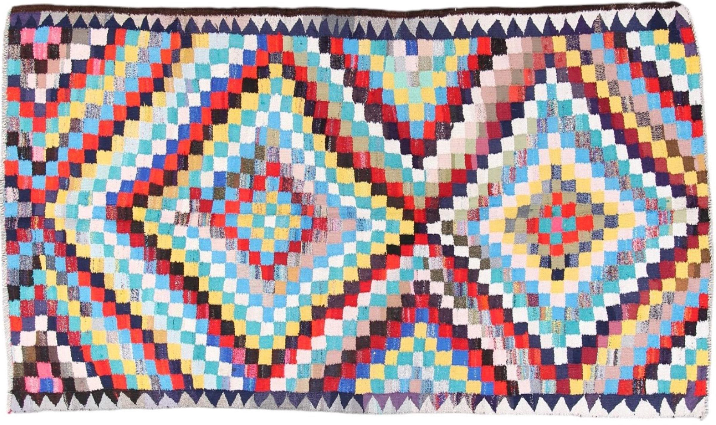 This rug was made as a flat weave by hand on a loom. Flatweave is the term used to describe rugs that have no pile. As the name promises, these rugs are woven and not knotted. This results in a flat rug with a structured surface. Flatweaves are not as soft and usually thinner than knotted rugs. At the same time they are much less complex to manufacture and can usually be laid out from both sides (front and back). Their patterns are usually geometric, which is determined by the fabric.