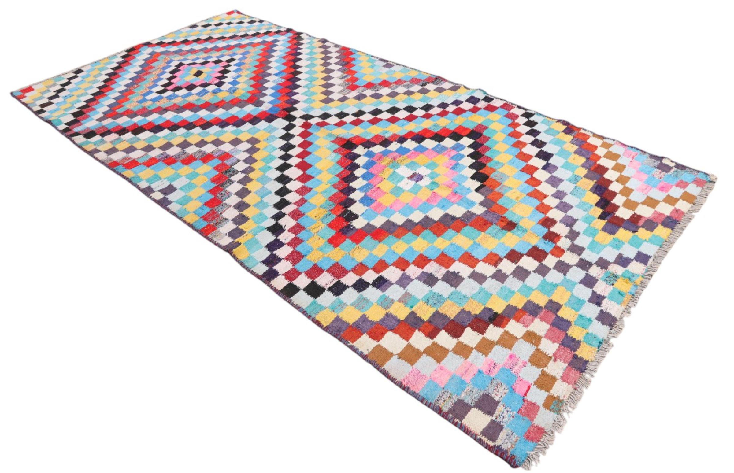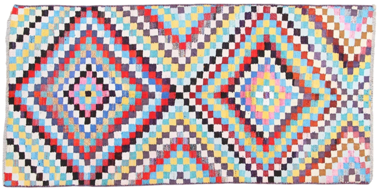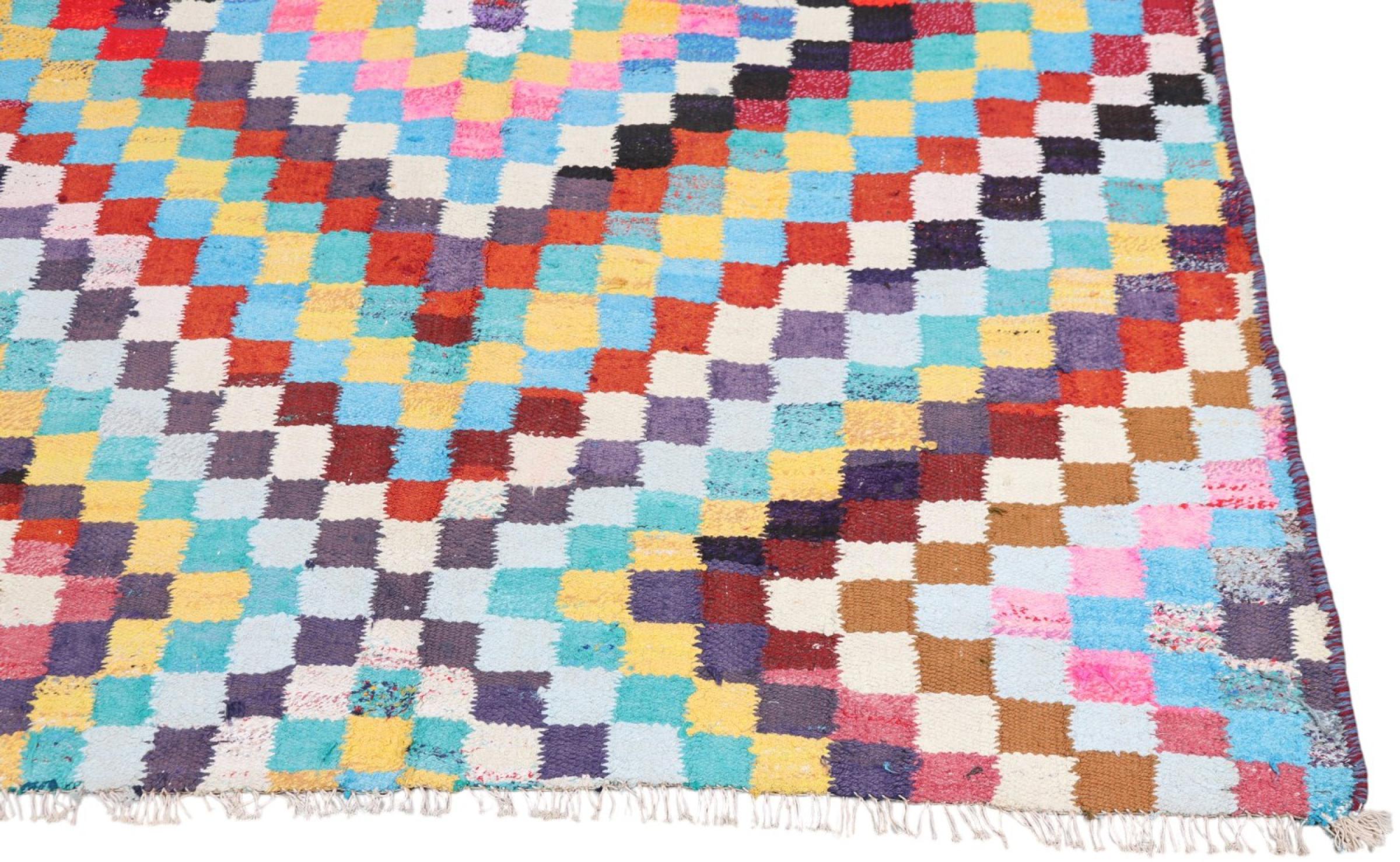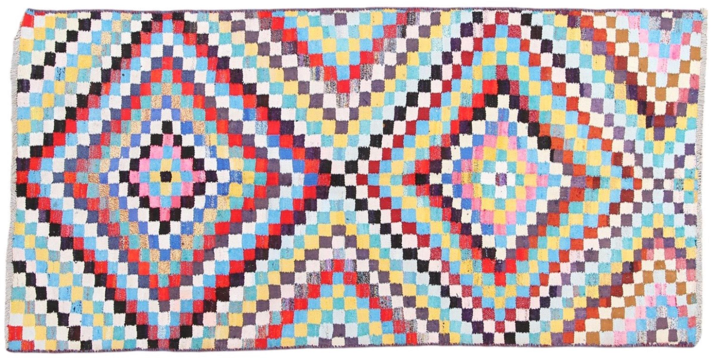 This rug was made as a flat weave by hand on a loom. Flatweave is the term used to describe rugs that have no pile. As the name promises, these rugs are woven and not knotted. This results in a flat rug with a structured surface. Flatweaves are not as soft and usually thinner than knotted rugs. At the same time they are much less complex to manufacture and can usually be laid out from both sides (front and back). Their patterns are usually geometric, which is determined by the fabric.