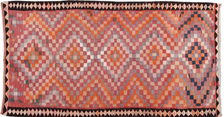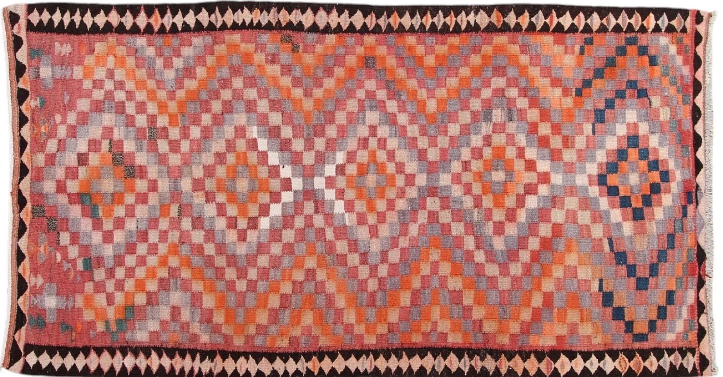 This rug was made as a flat weave by hand on a loom. Flatweave is the term used to describe rugs that have no pile. As the name promises, these rugs are woven and not knotted. This results in a flat rug with a structured surface. Flatweaves are not as soft and usually thinner than knotted rugs. At the same time they are much less complex to manufacture and can usually be laid out from both sides (front and back). Their patterns are usually geometric, which is determined by the fabric.