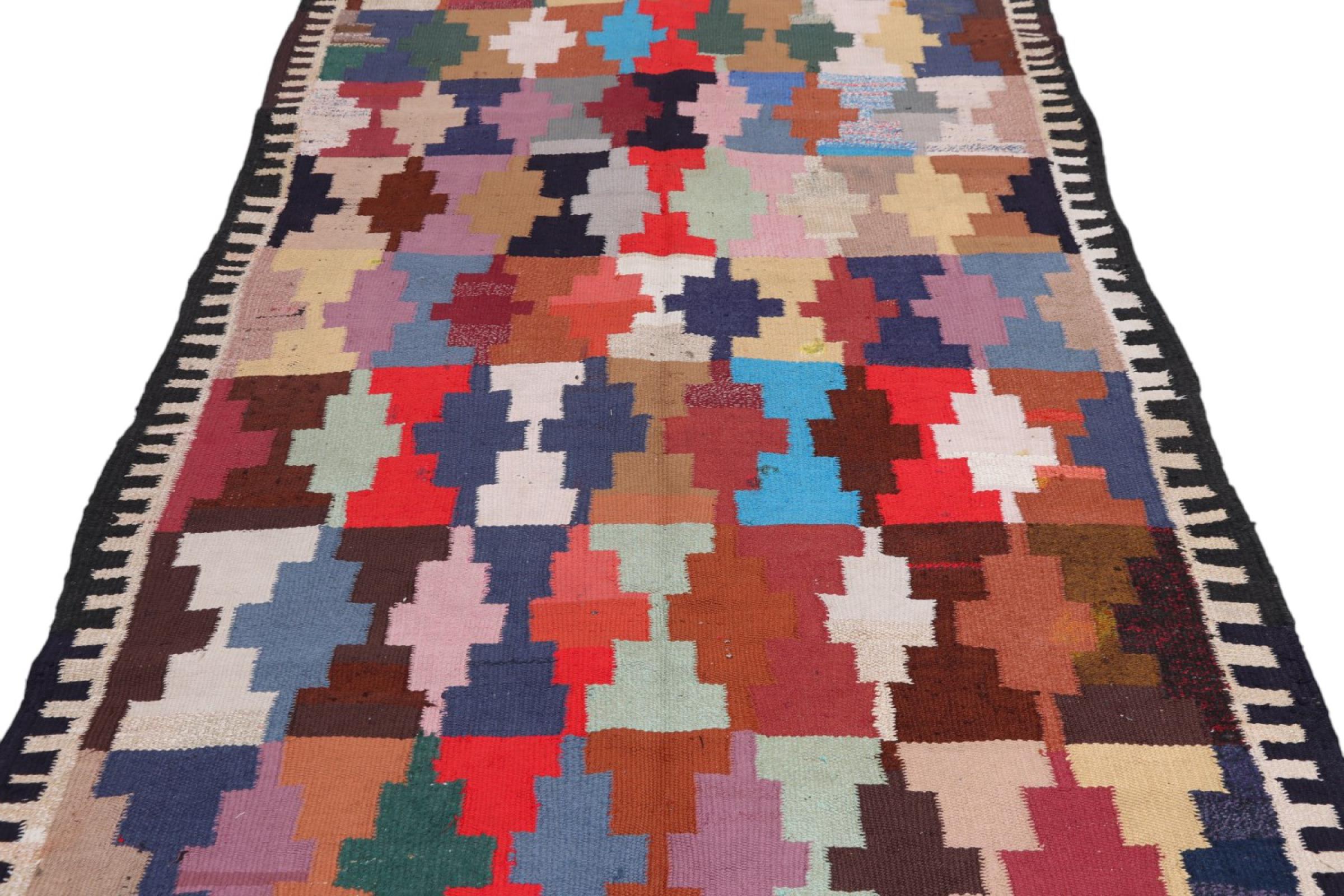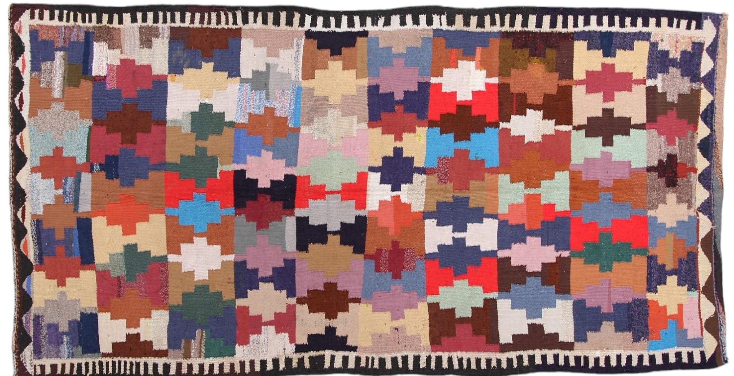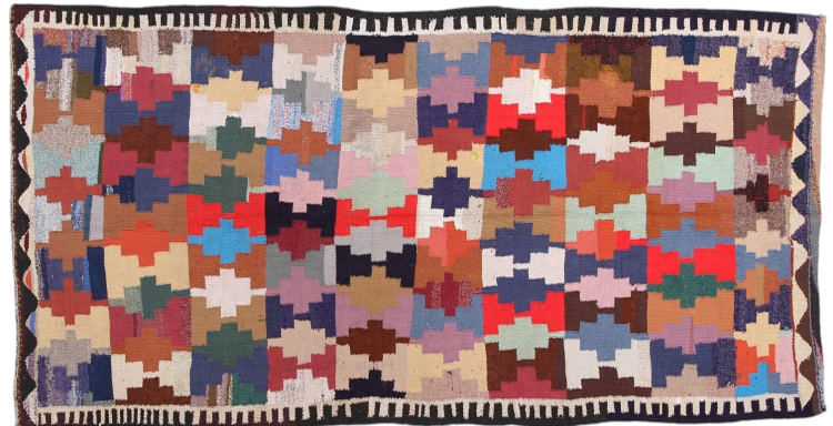 This rug was made as a flat weave by hand on a loom. Flatweave is the term used to describe rugs that have no pile. As the name promises, these rugs are woven and not knotted. This results in a flat rug with a structured surface. Flatweaves are not as soft and usually thinner than knotted rugs. At the same time they are much less complex to manufacture and can usually be laid out from both sides (front and back). Their patterns are usually geometric, which is determined by the fabric.