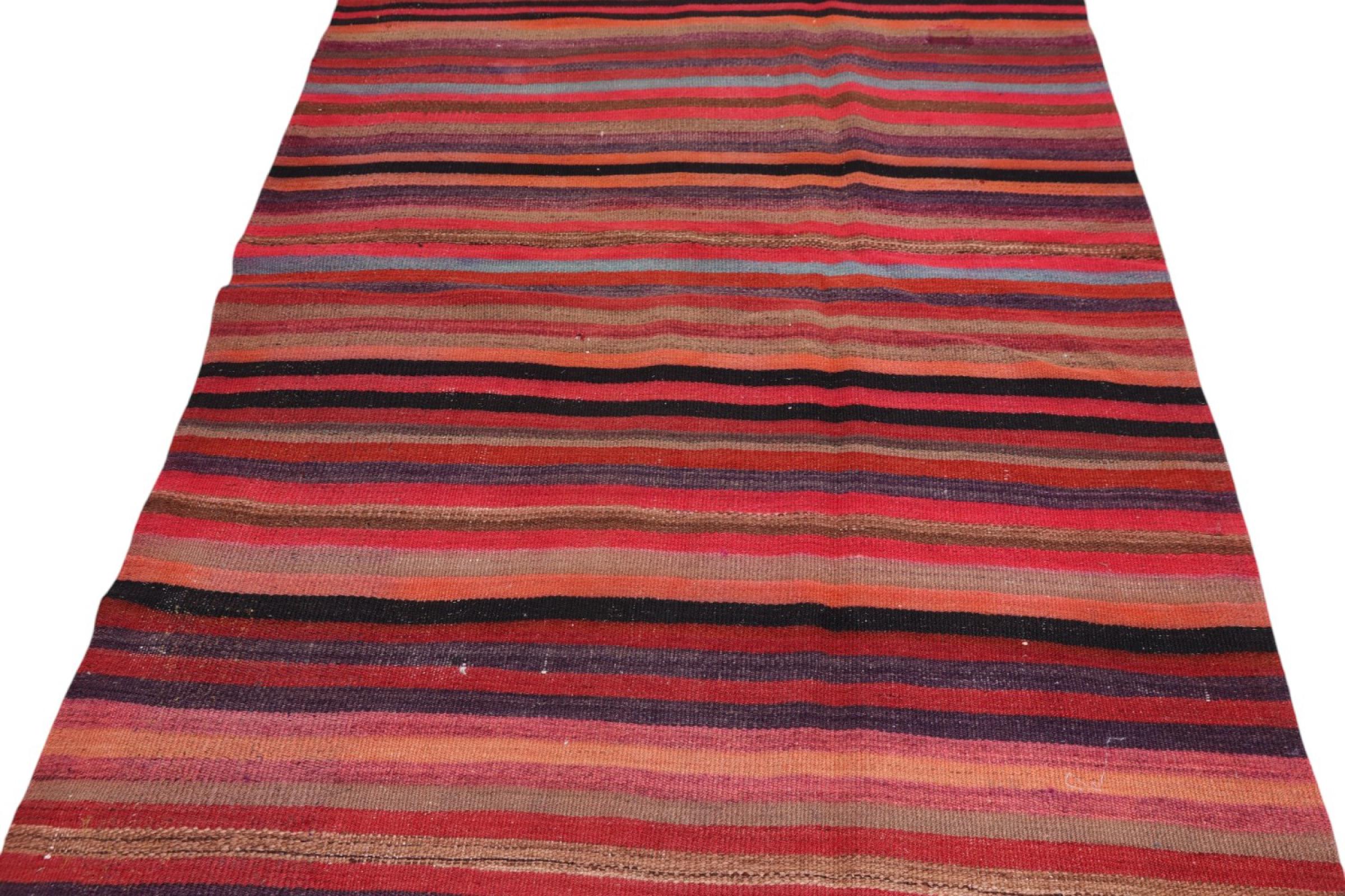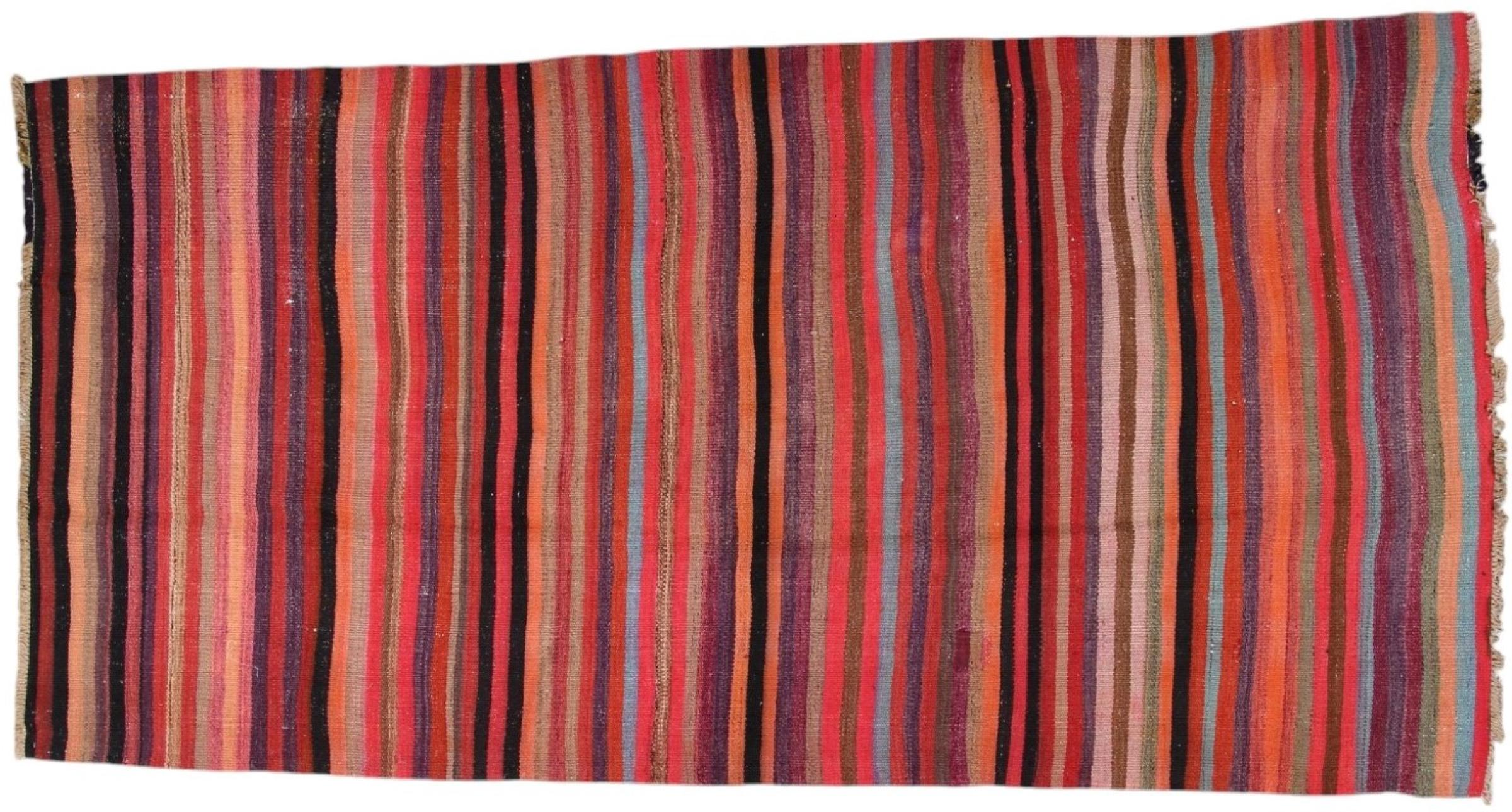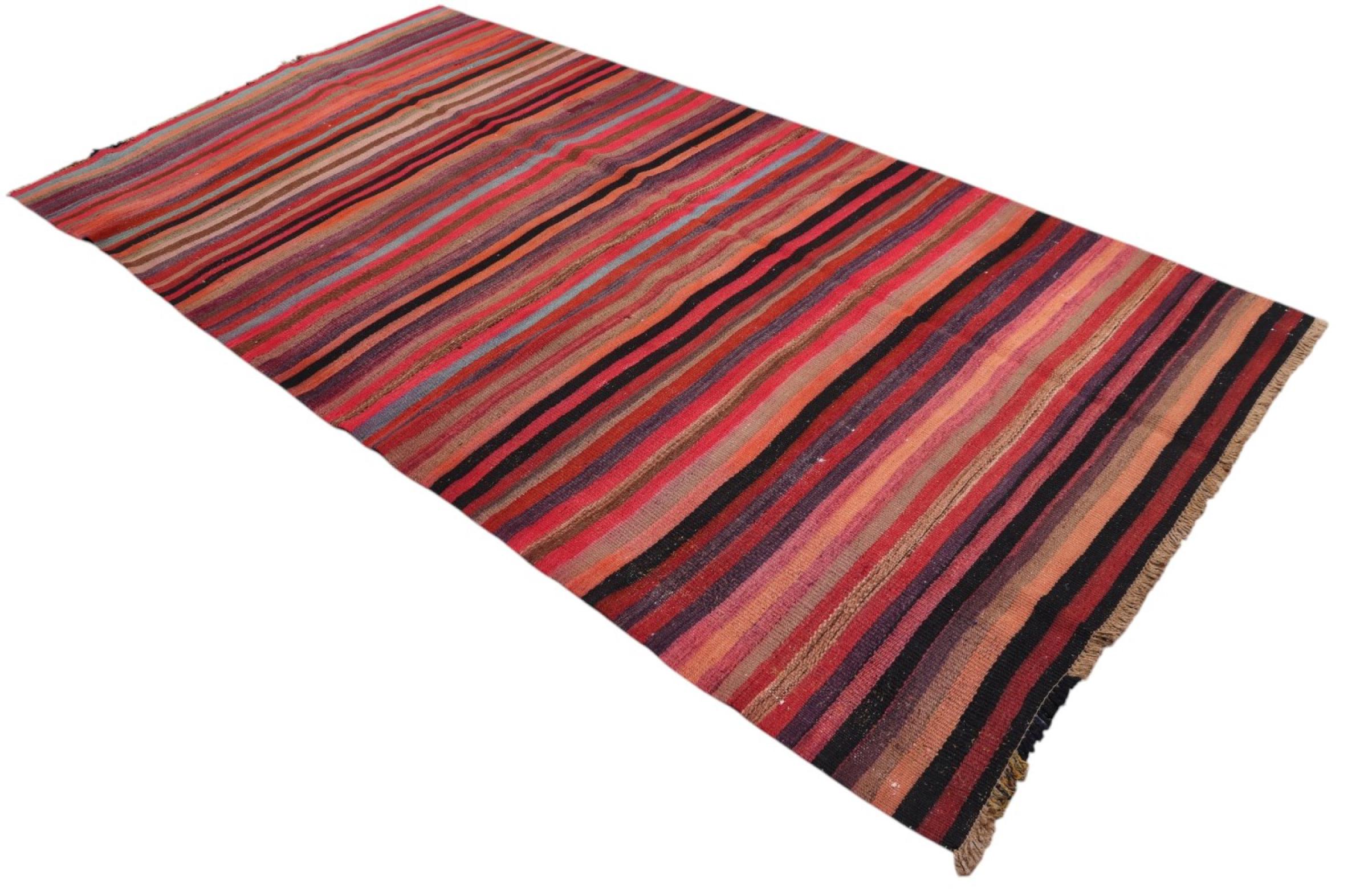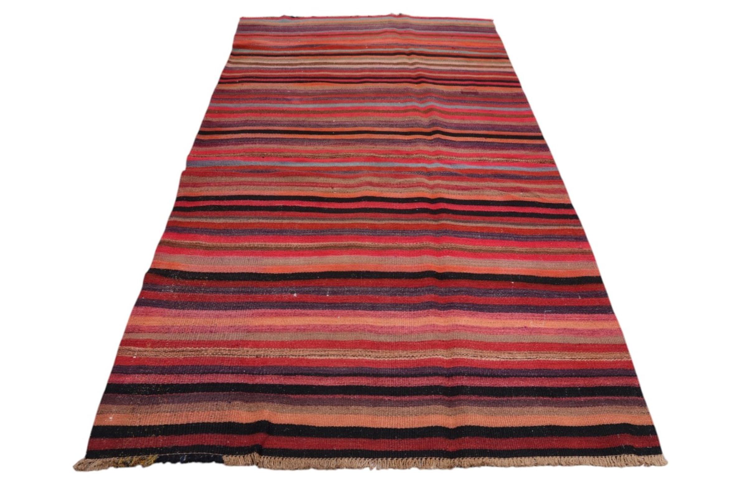 This rug was made as a flat weave by hand on a loom. Flatweave is the term used to describe rugs that have no pile. As the name promises, these rugs are woven and not knotted. This results in a flat rug with a structured surface. Flatweaves are not as soft and usually thinner than knotted rugs. At the same time they are much less complex to manufacture and can usually be laid out from both sides (front and back). Their patterns are usually geometric, which is determined by the fabric.