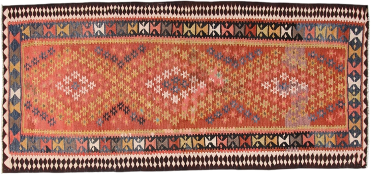 This handwoven Kilim Fars combines Persian patterns with the old tradition of flat fabrics. It represents a beautiful composition of contemporary Persian elements and a modern style. Due to the carpet's geometric patterns and its warm colours, this type of rug is extremely popular in modern interior magazines. Additionally, this Kilim can be used in many different ways. Whether you would like to use it as a bed cover or as a carpet in front of your sofa – a Kilim Fars fulfils nearly all wishes.