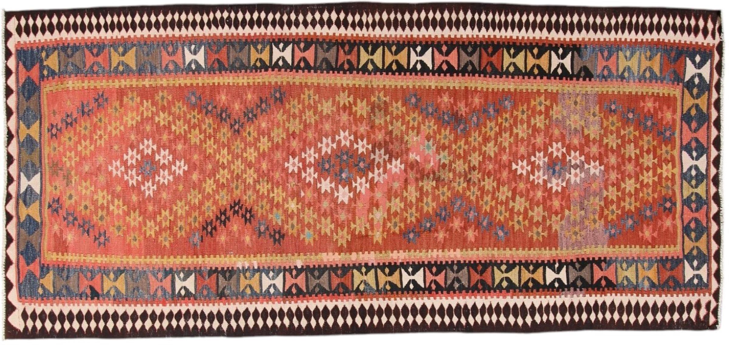 This rug was made as a flat weave by hand on a loom. Flatweave is the term used to describe rugs that have no pile. As the name promises, these rugs are woven and not knotted. This results in a flat rug with a structured surface. Flatweaves are not as soft and usually thinner than knotted rugs. At the same time they are much less complex to manufacture and can usually be laid out from both sides (front and back). Their patterns are usually geometric, which is determined by the fabric.