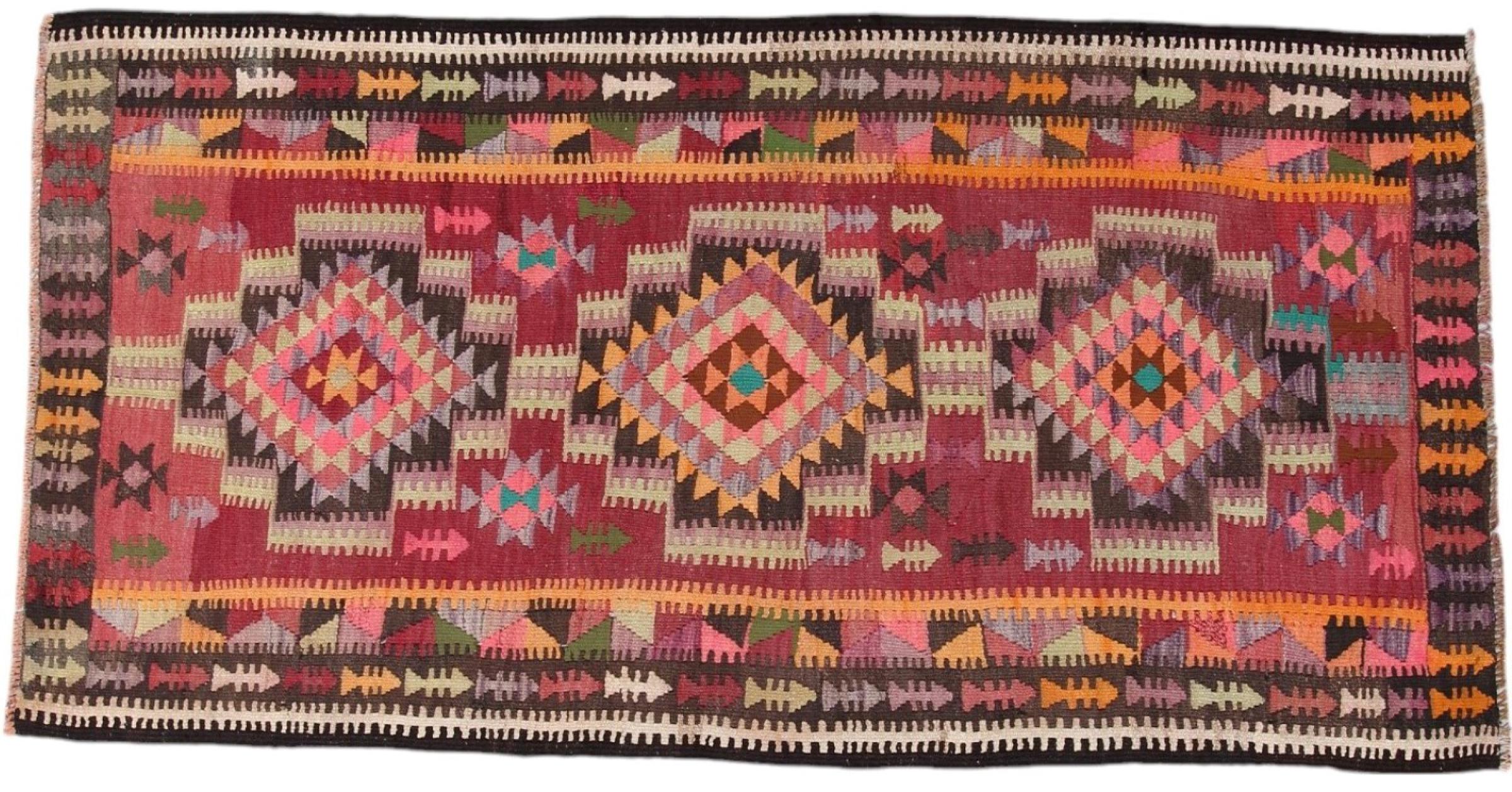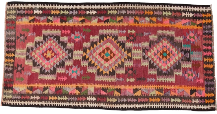 This rug was made as a flat weave by hand on a loom. Flatweave is the term used to describe rugs that have no pile. As the name promises, these rugs are woven and not knotted. This results in a flat rug with a structured surface. Flatweaves are not as soft and usually thinner than knotted rugs. At the same time they are much less complex to manufacture and can usually be laid out from both sides (front and back). Their patterns are usually geometric, which is determined by the fabric.
