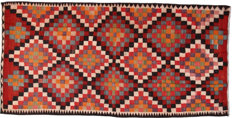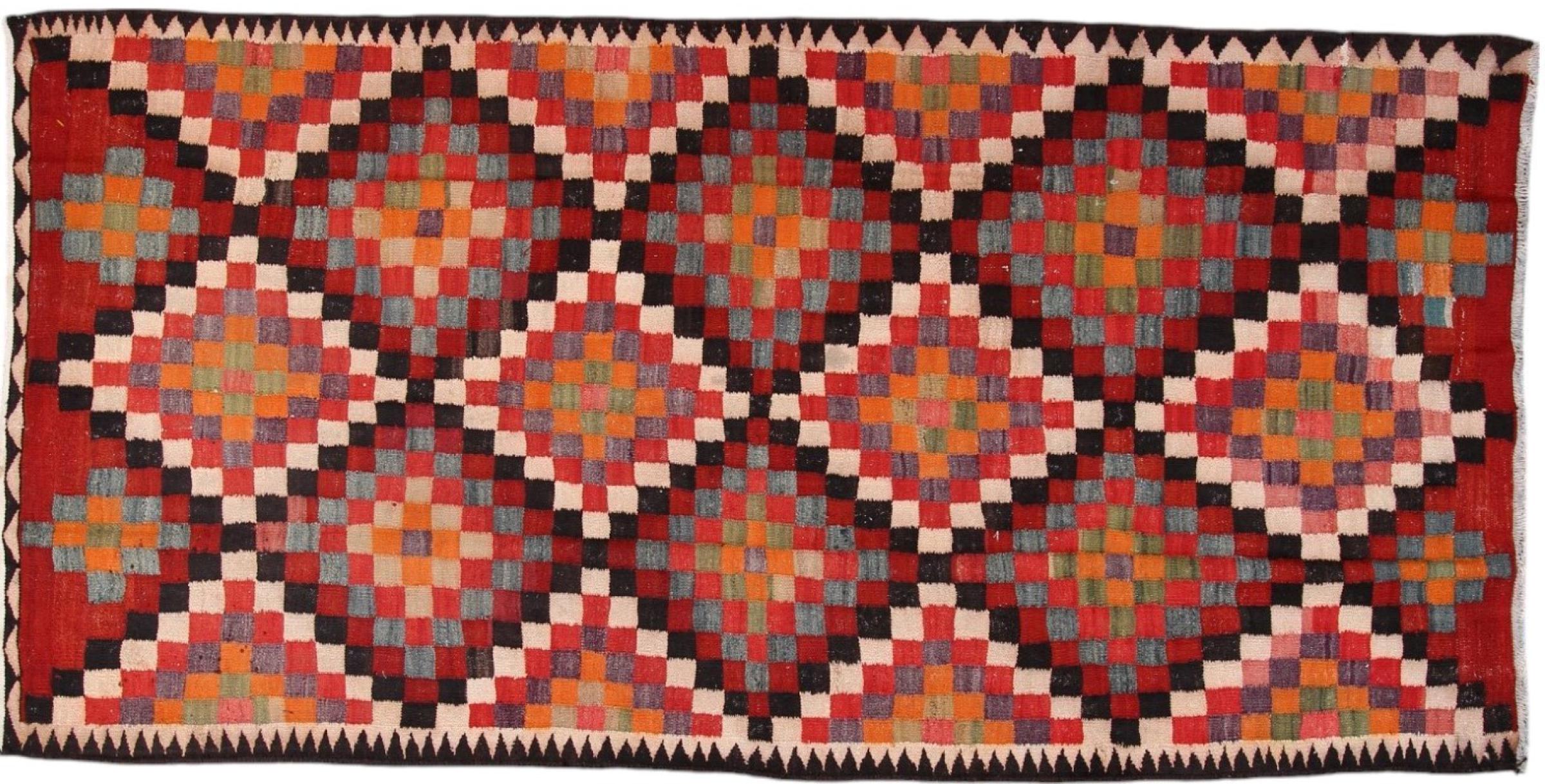 This rug was made as a flat weave by hand on a loom. Flatweave is the term used to describe rugs that have no pile. As the name promises, these rugs are woven and not knotted. This results in a flat rug with a structured surface. Flatweaves are not as soft and usually thinner than knotted rugs. At the same time they are much less complex to manufacture and can usually be laid out from both sides (front and back). Their patterns are usually geometric, which is determined by the fabric.