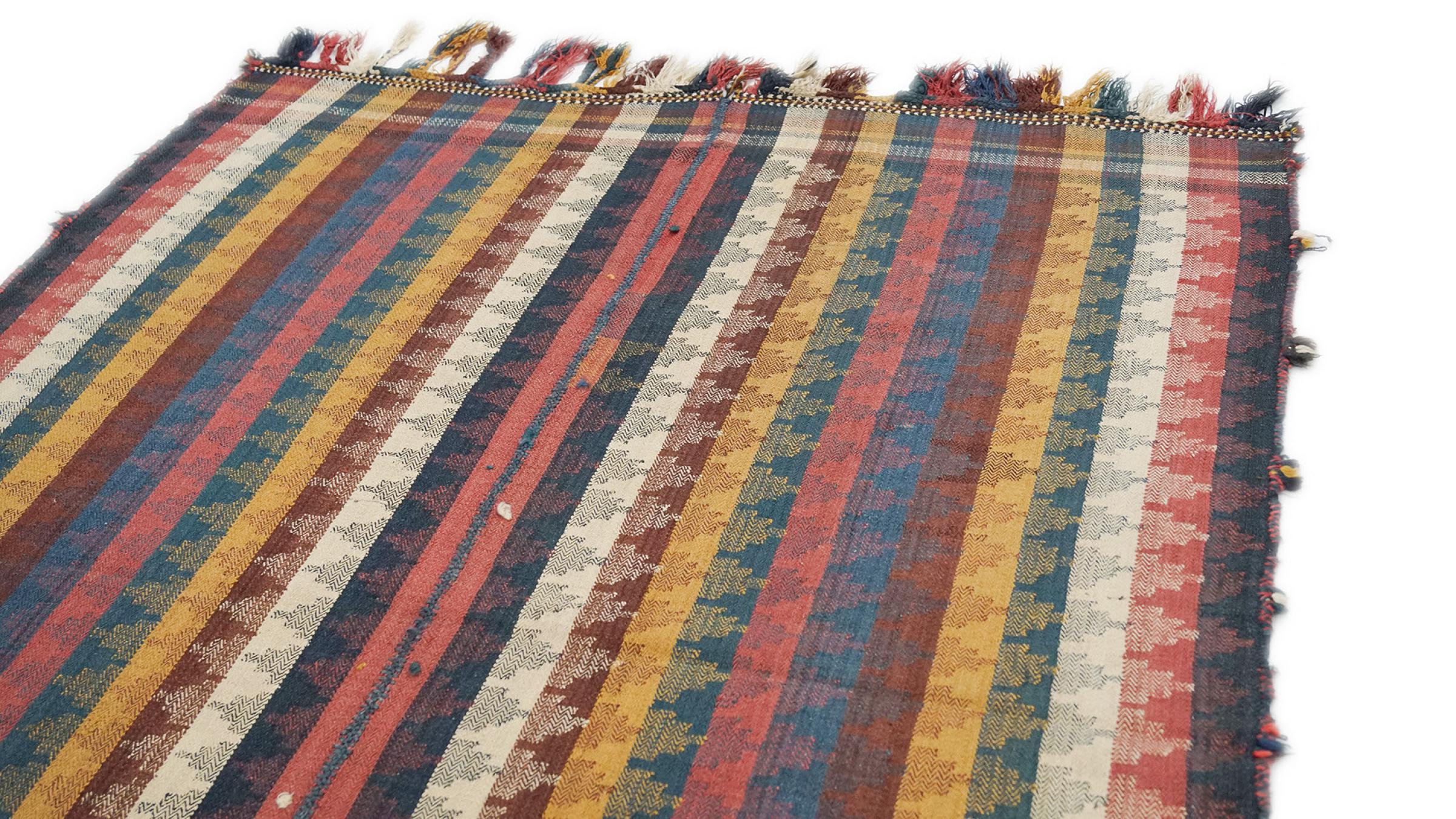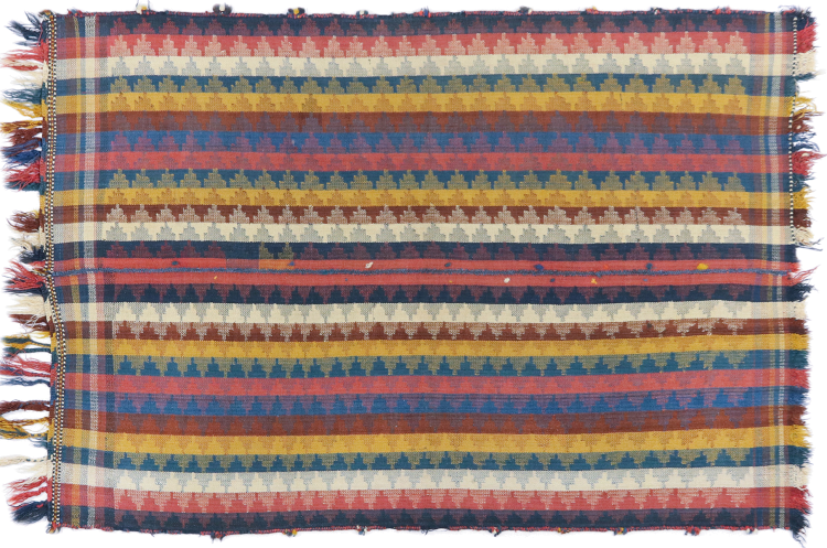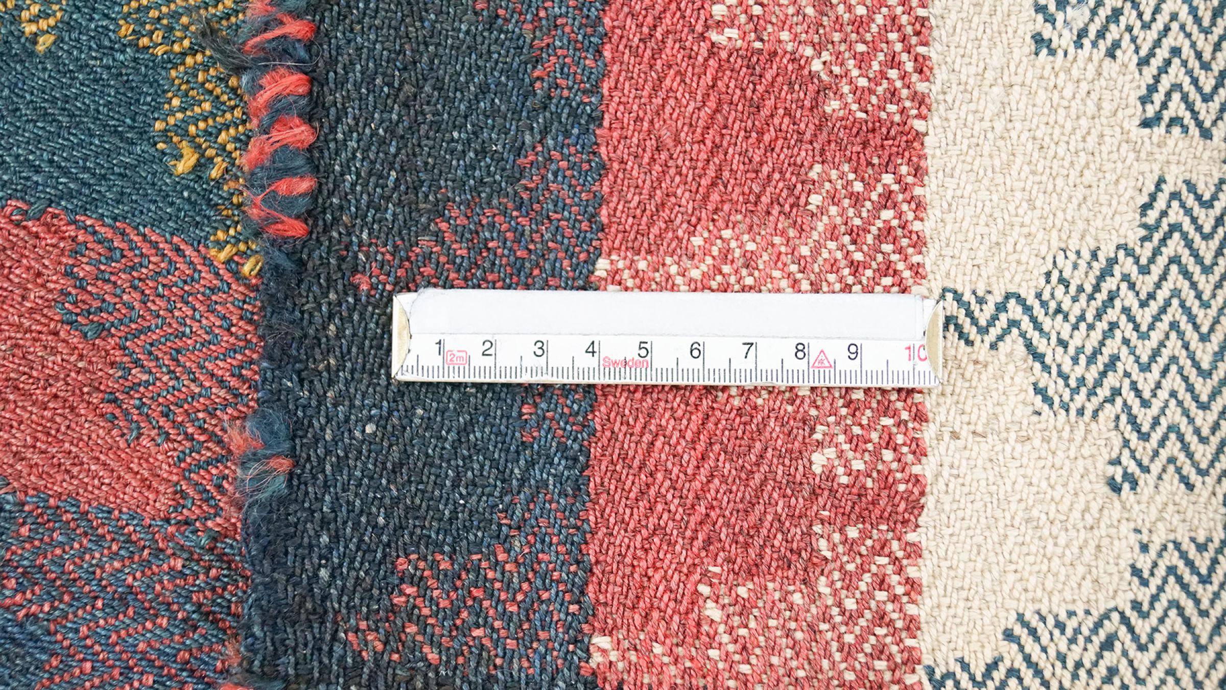 This rug was made as a flat weave by hand on a loom. Flatweave is the term used to describe rugs that have no pile. As the name promises, these rugs are woven and not knotted. This results in a flat rug with a structured surface. Flatweaves are not as soft and usually thinner than knotted rugs. At the same time they are much less complex to manufacture and can usually be laid out from both sides (front and back). Their patterns are usually geometric, which is determined by the fabric.