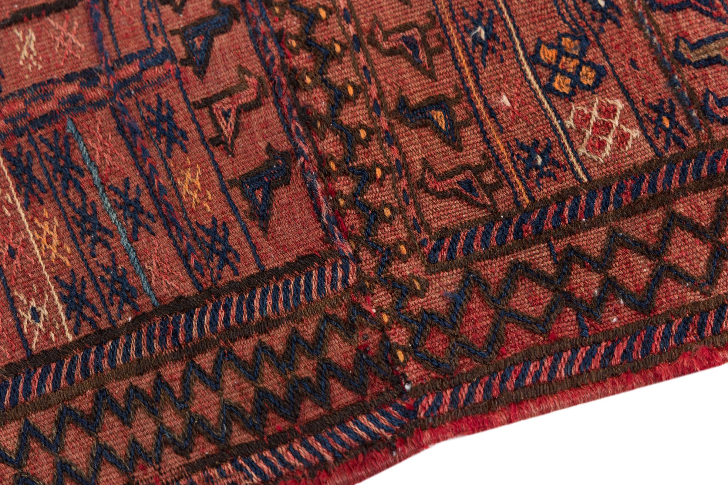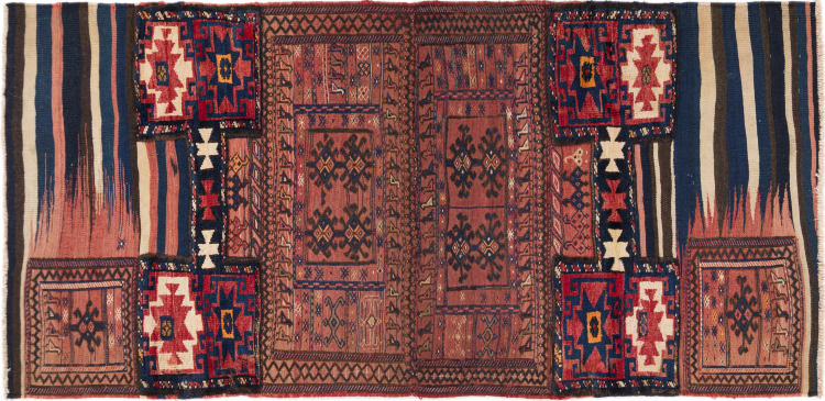 This rug was made as a flat weave by hand on a loom. Flatweave is the term used to describe rugs that have no pile. As the name promises, these rugs are woven and not knotted. This results in a flat rug with a structured surface. Flatweaves are not as soft and usually thinner than knotted rugs. At the same time they are much less complex to manufacture and can usually be laid out from both sides (front and back). Their patterns are usually geometric, which is determined by the fabric.