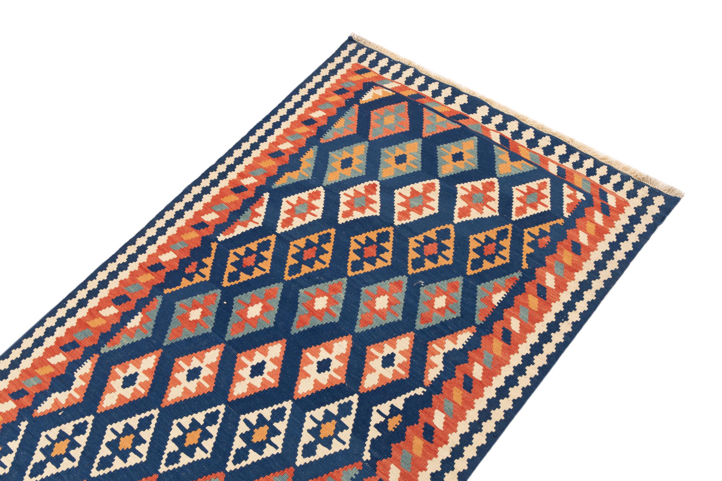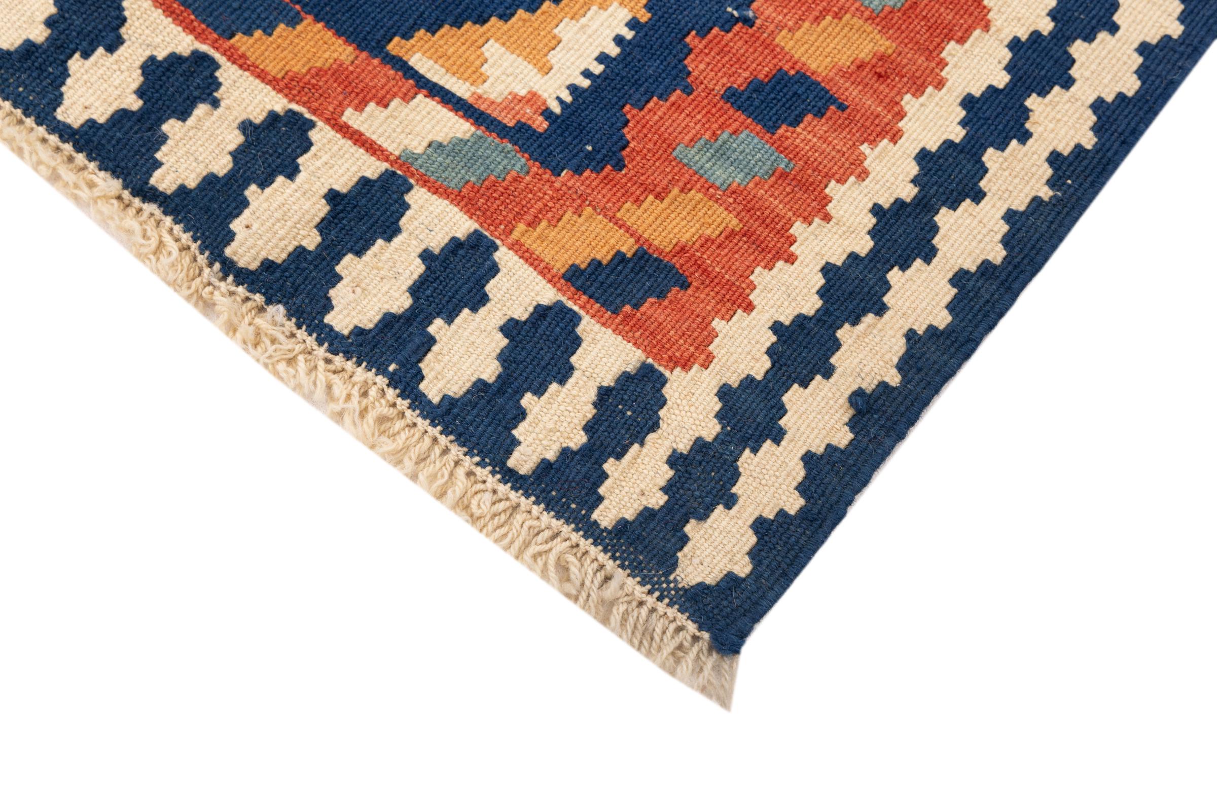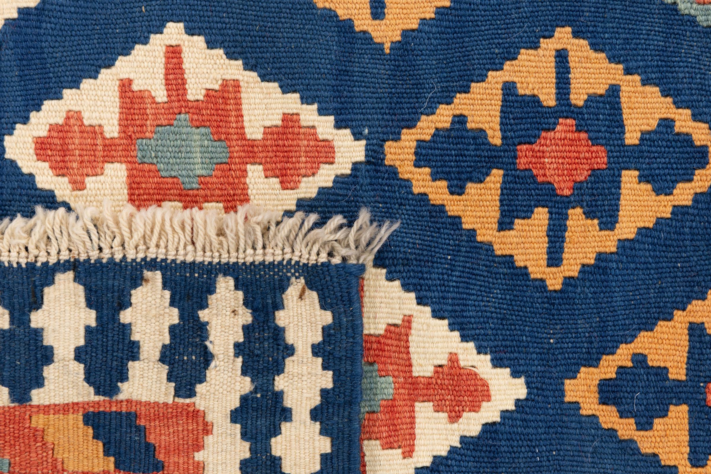 This rug was made as a flat weave by hand on a loom. Flatweave is the term used to describe rugs that have no pile. As the name promises, these rugs are woven and not knotted. This results in a flat rug with a structured surface. Flatweaves are not as soft and usually thinner than knotted rugs. At the same time they are much less complex to manufacture and can usually be laid out from both sides (front and back). Their patterns are usually geometric, which is determined by the fabric.