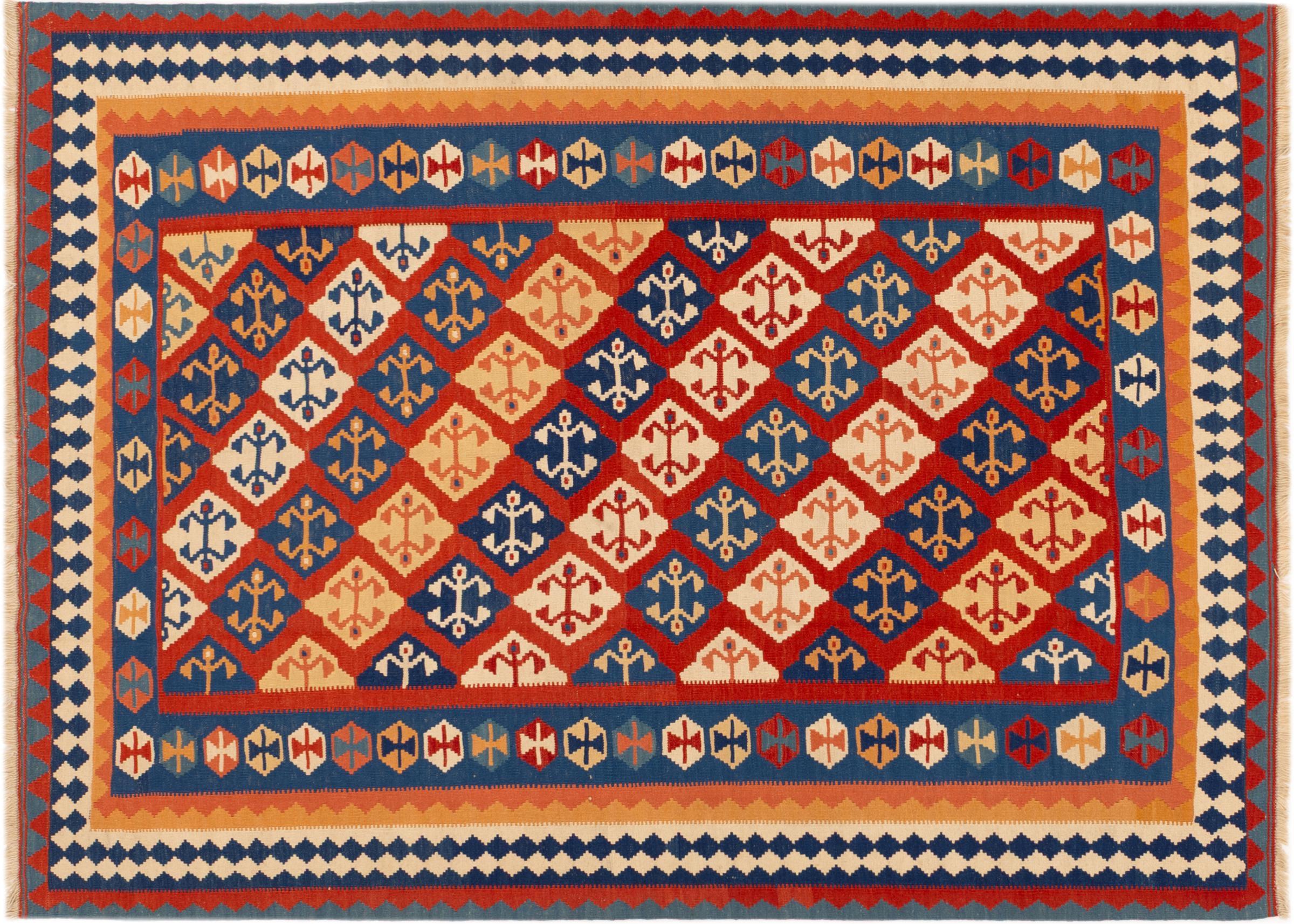 This rug was made as a flat weave by hand on a loom. Flatweave is the term used to describe rugs that have no pile. As the name promises, these rugs are woven and not knotted. This results in a flat rug with a structured surface. Flatweaves are not as soft and usually thinner than knotted rugs. At the same time they are much less complex to manufacture and can usually be laid out from both sides (front and back). Their patterns are usually geometric, which is determined by the fabric.