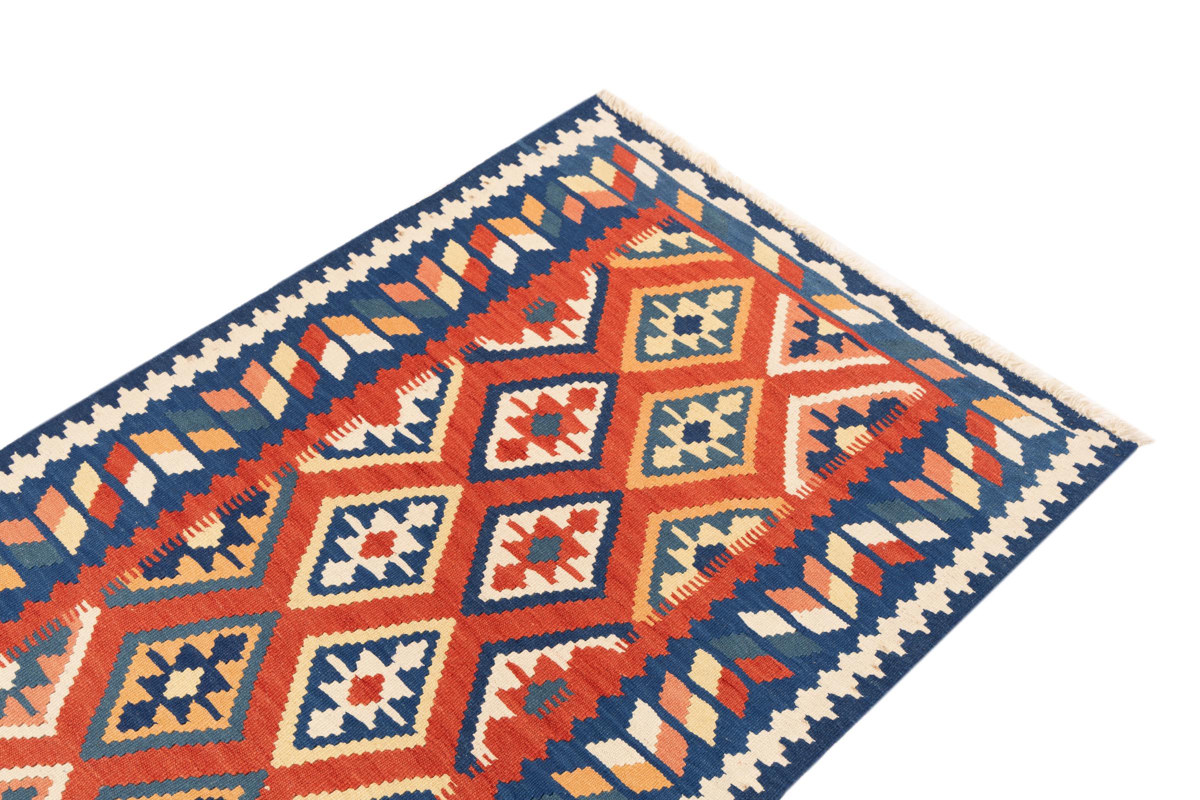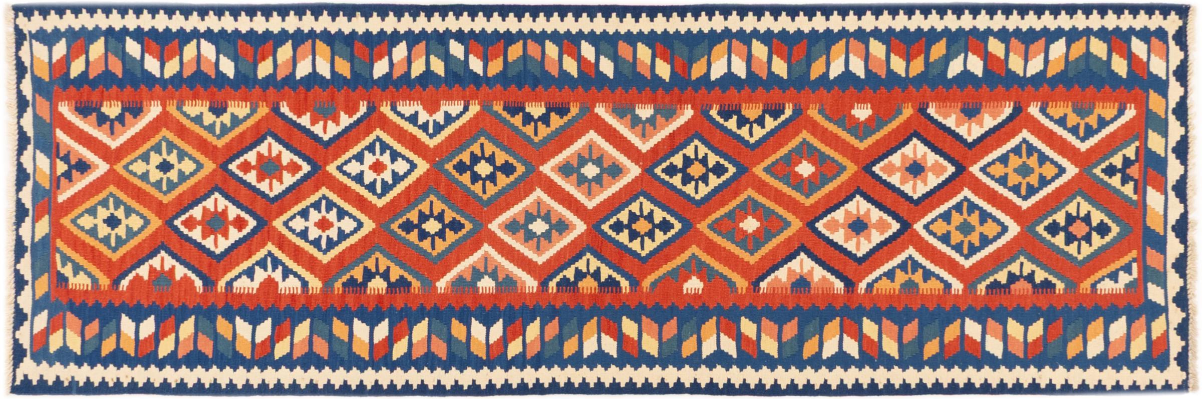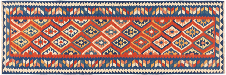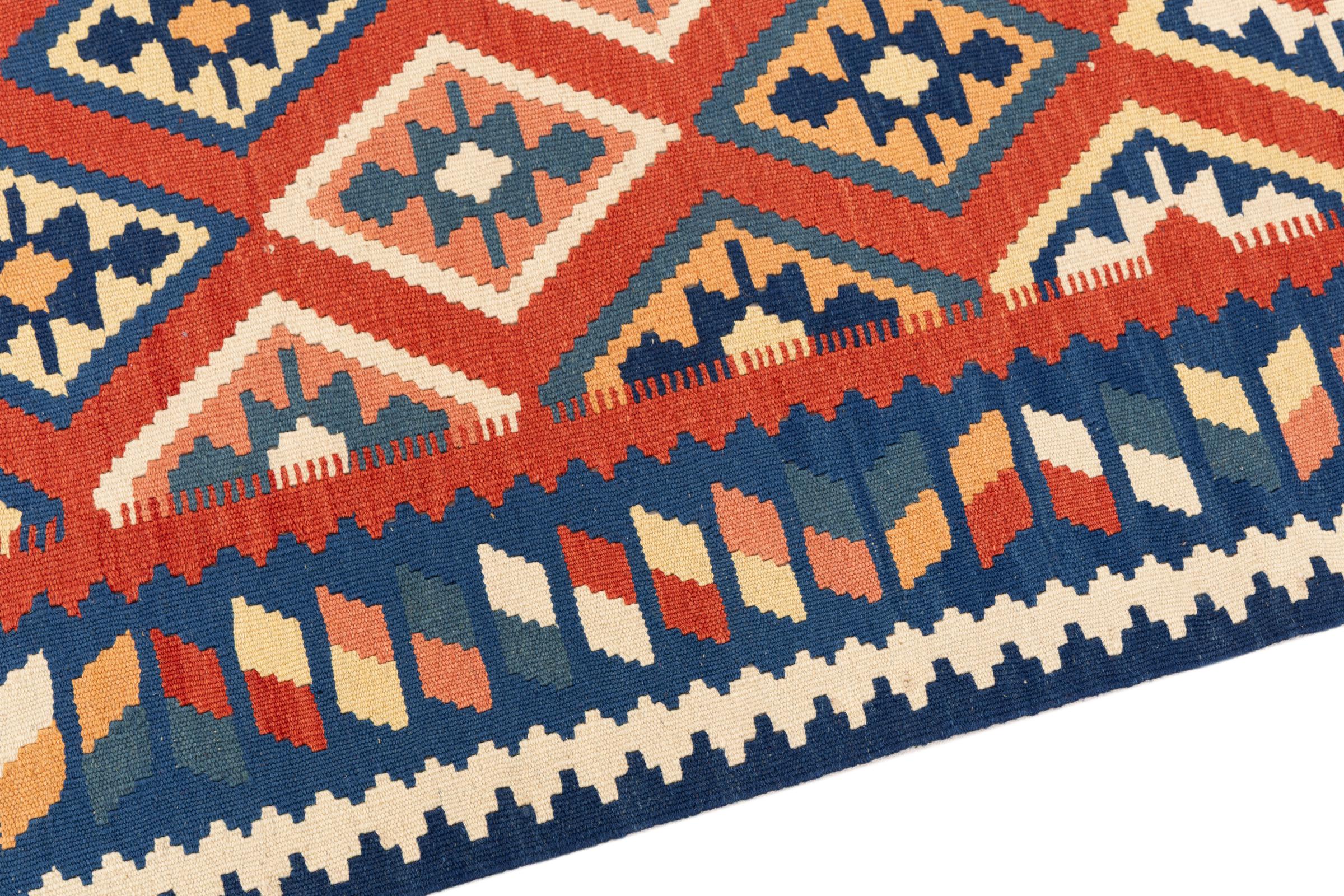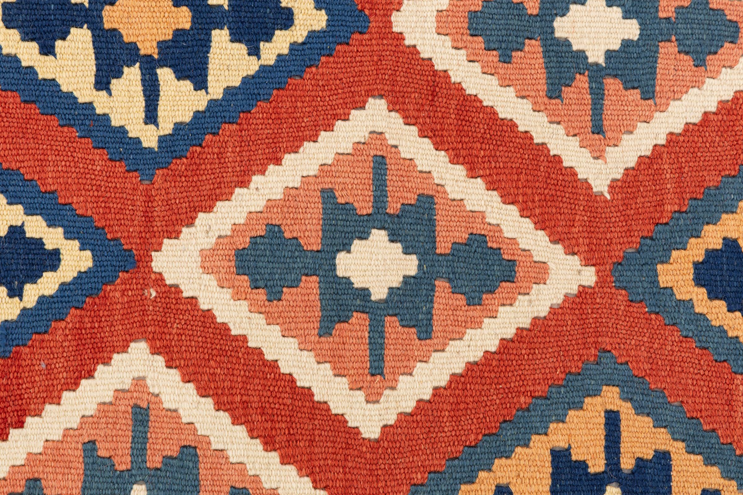 This rug was made as a flat weave by hand on a loom. Flatweave is the term used to describe rugs that have no pile. As the name promises, these rugs are woven and not knotted. This results in a flat rug with a structured surface. Flatweaves are not as soft and usually thinner than knotted rugs. At the same time they are much less complex to manufacture and can usually be laid out from both sides (front and back). Their patterns are usually geometric, which is determined by the fabric.