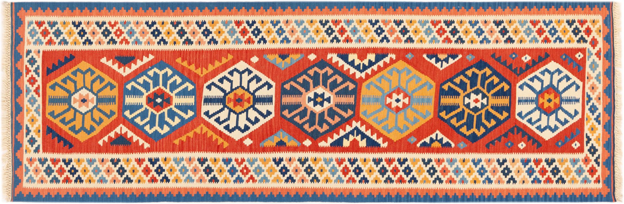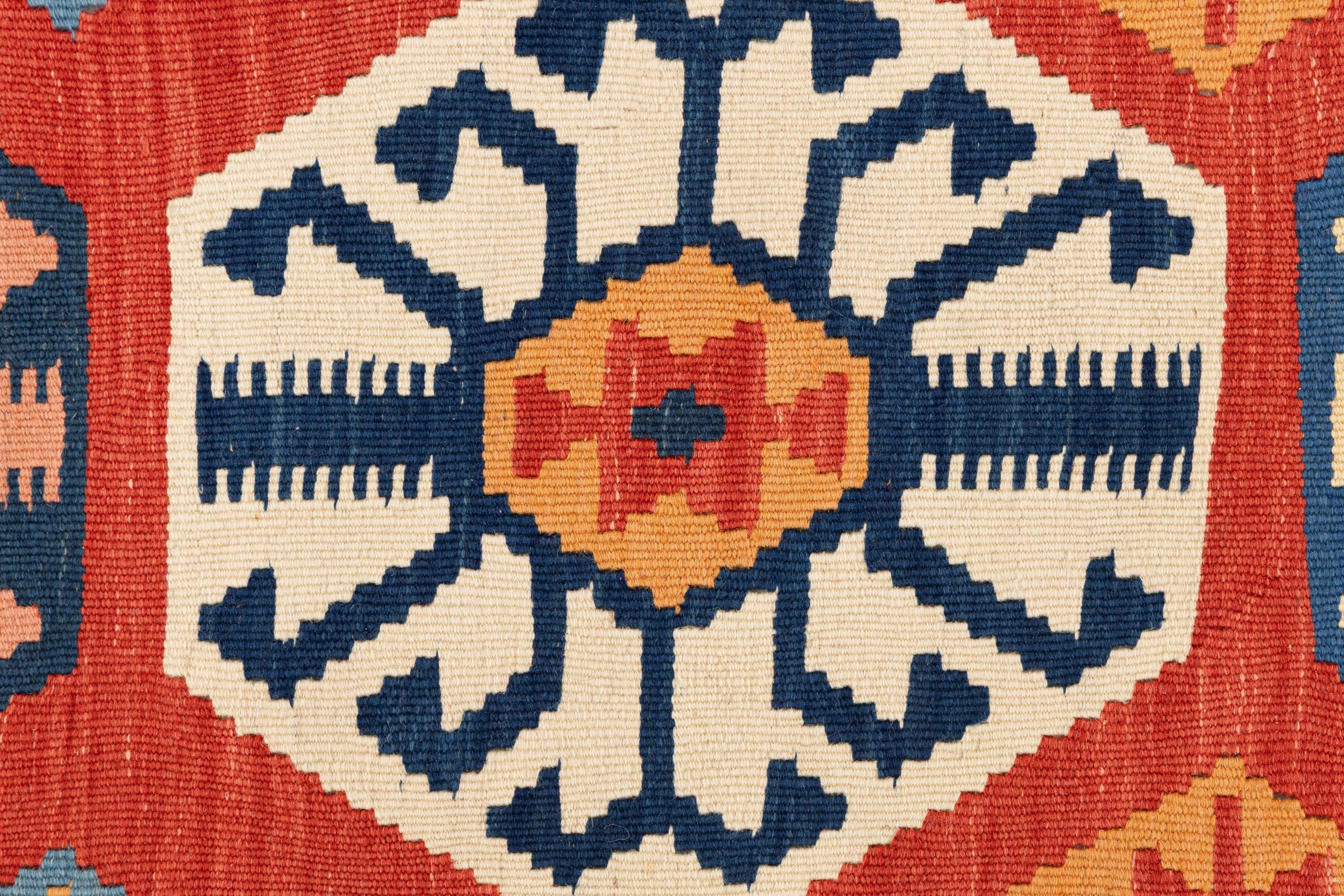 This rug was made as a flat weave by hand on a loom. Flatweave is the term used to describe rugs that have no pile. As the name promises, these rugs are woven and not knotted. This results in a flat rug with a structured surface. Flatweaves are not as soft and usually thinner than knotted rugs. At the same time they are much less complex to manufacture and can usually be laid out from both sides (front and back). Their patterns are usually geometric, which is determined by the fabric.