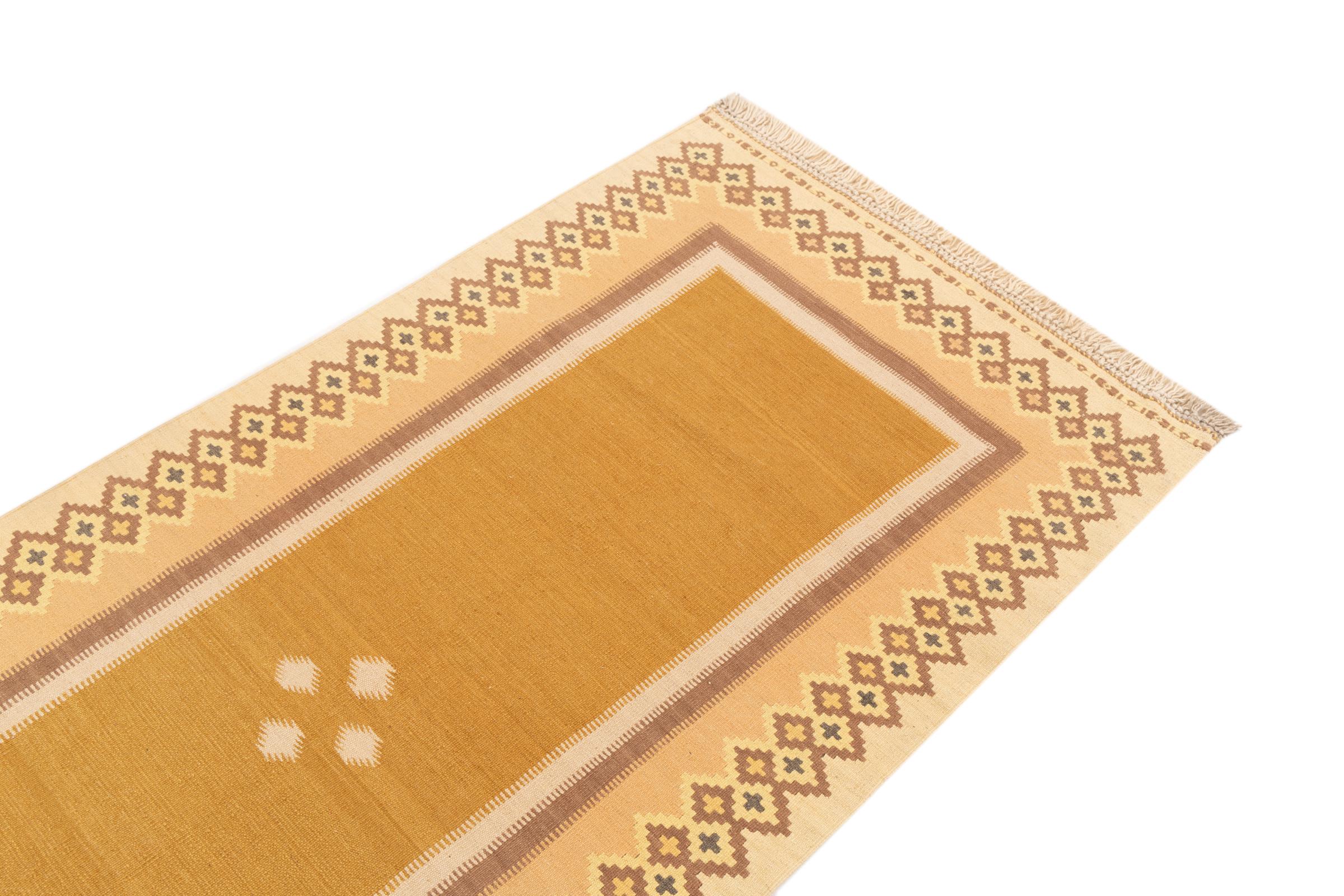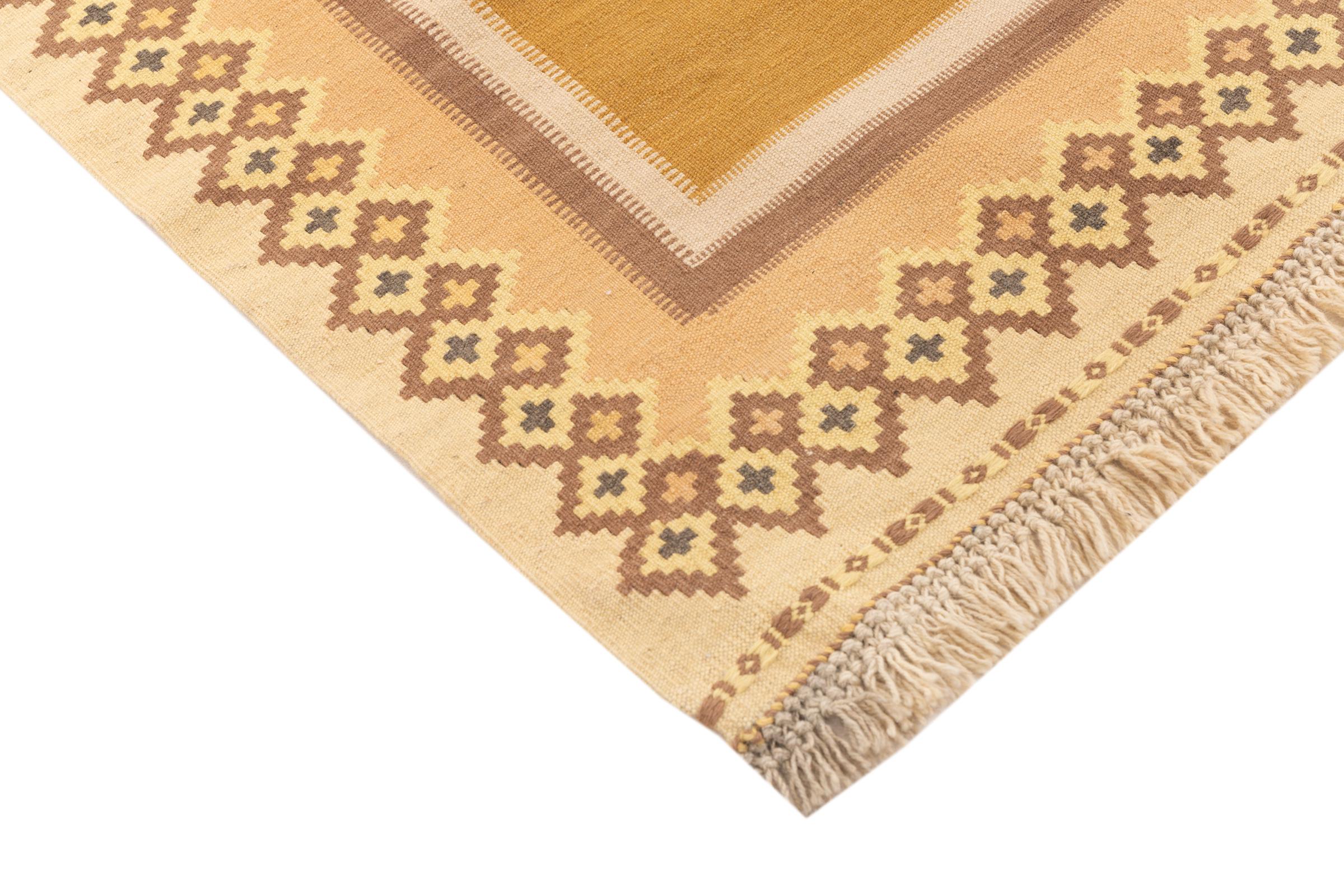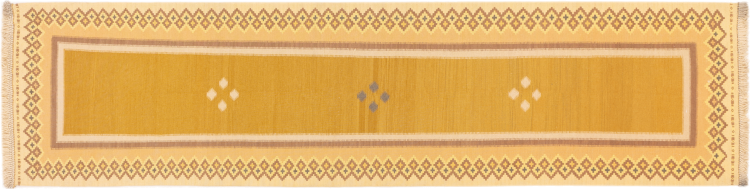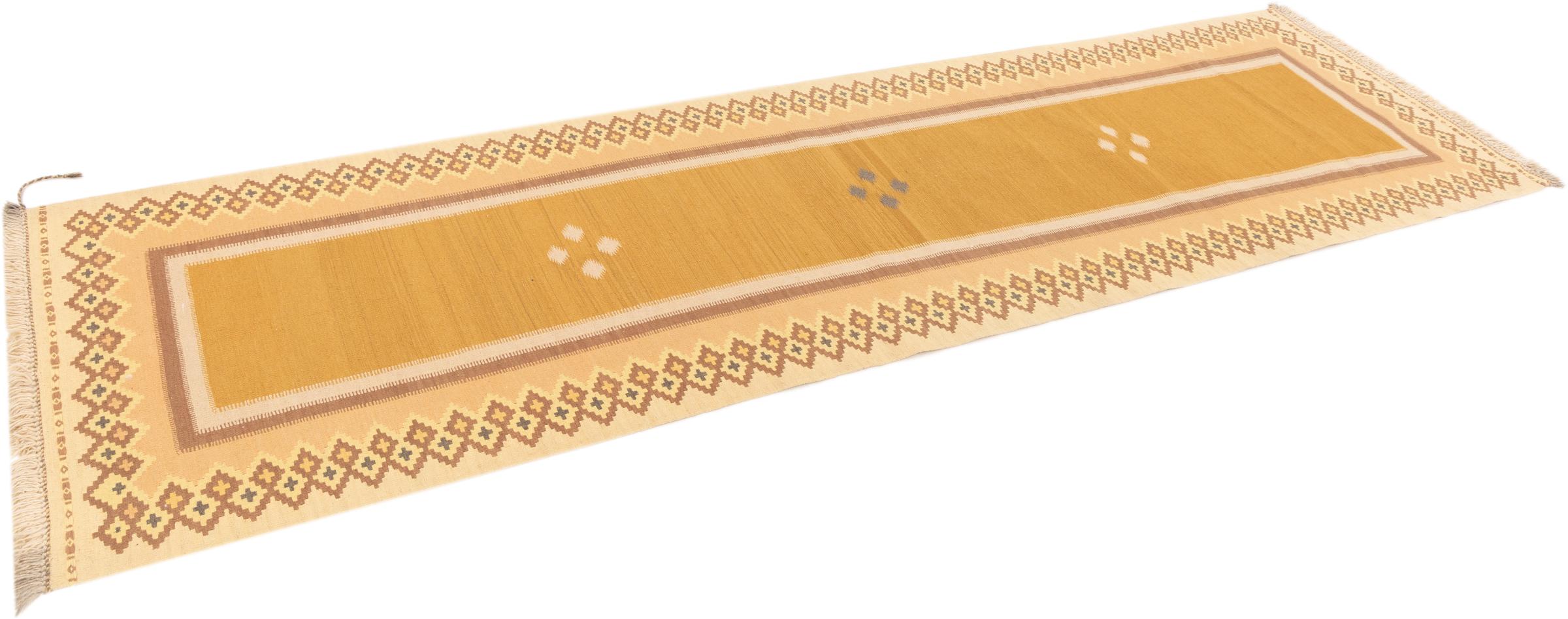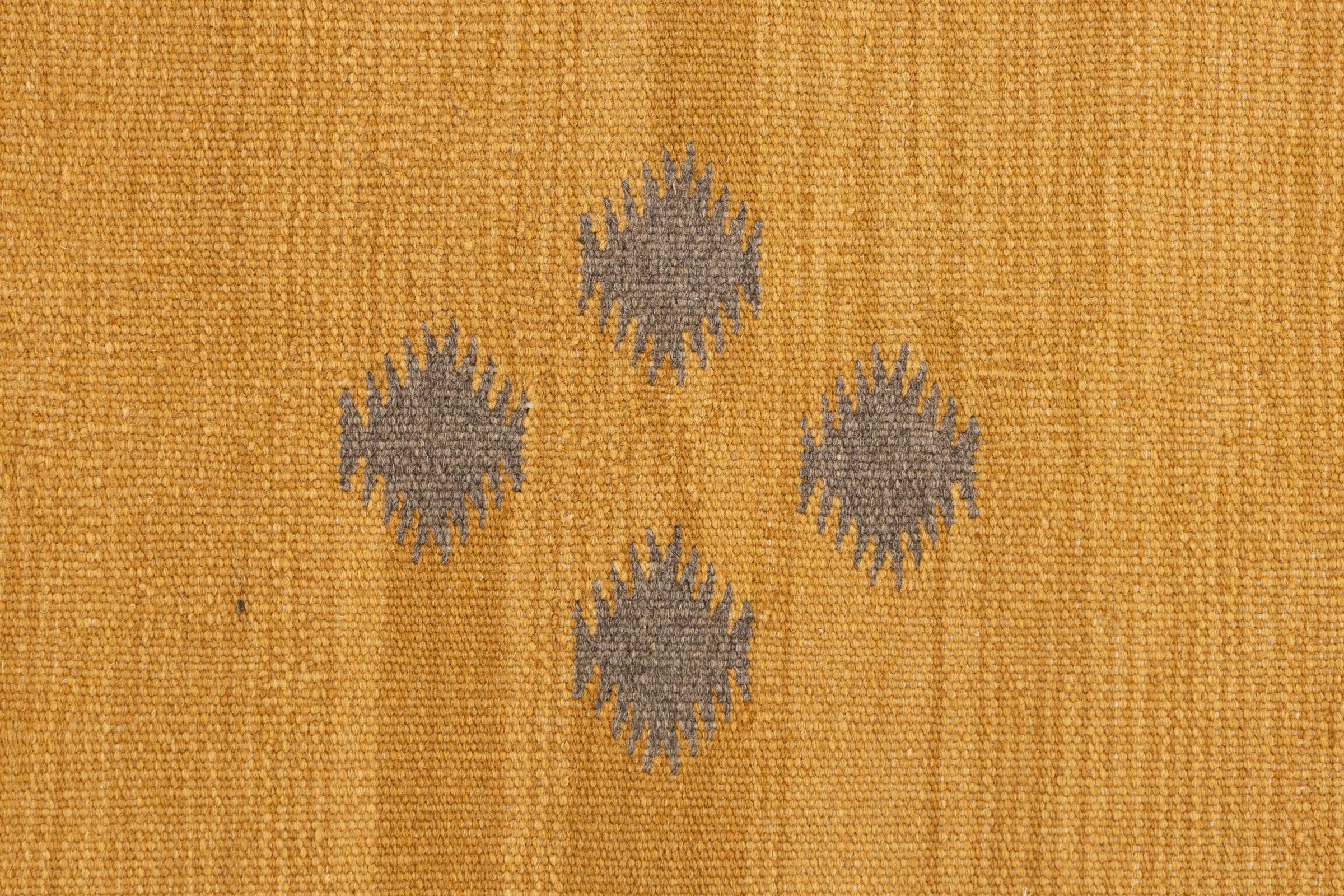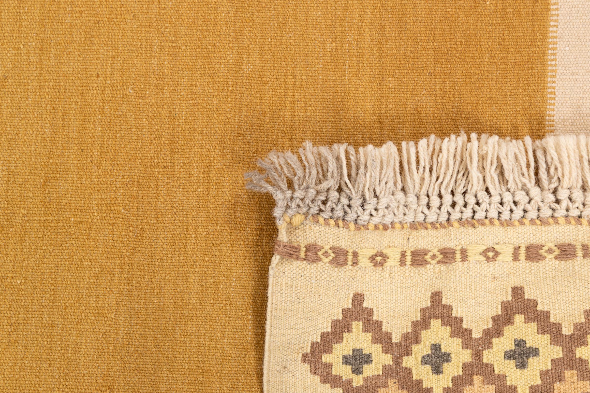 This rug was made as a flat weave by hand on a loom. Flatweave is the term used to describe rugs that have no pile. As the name promises, these rugs are woven and not knotted. This results in a flat rug with a structured surface. Flatweaves are not as soft and usually thinner than knotted rugs. At the same time they are much less complex to manufacture and can usually be laid out from both sides (front and back). Their patterns are usually geometric, which is determined by the fabric.