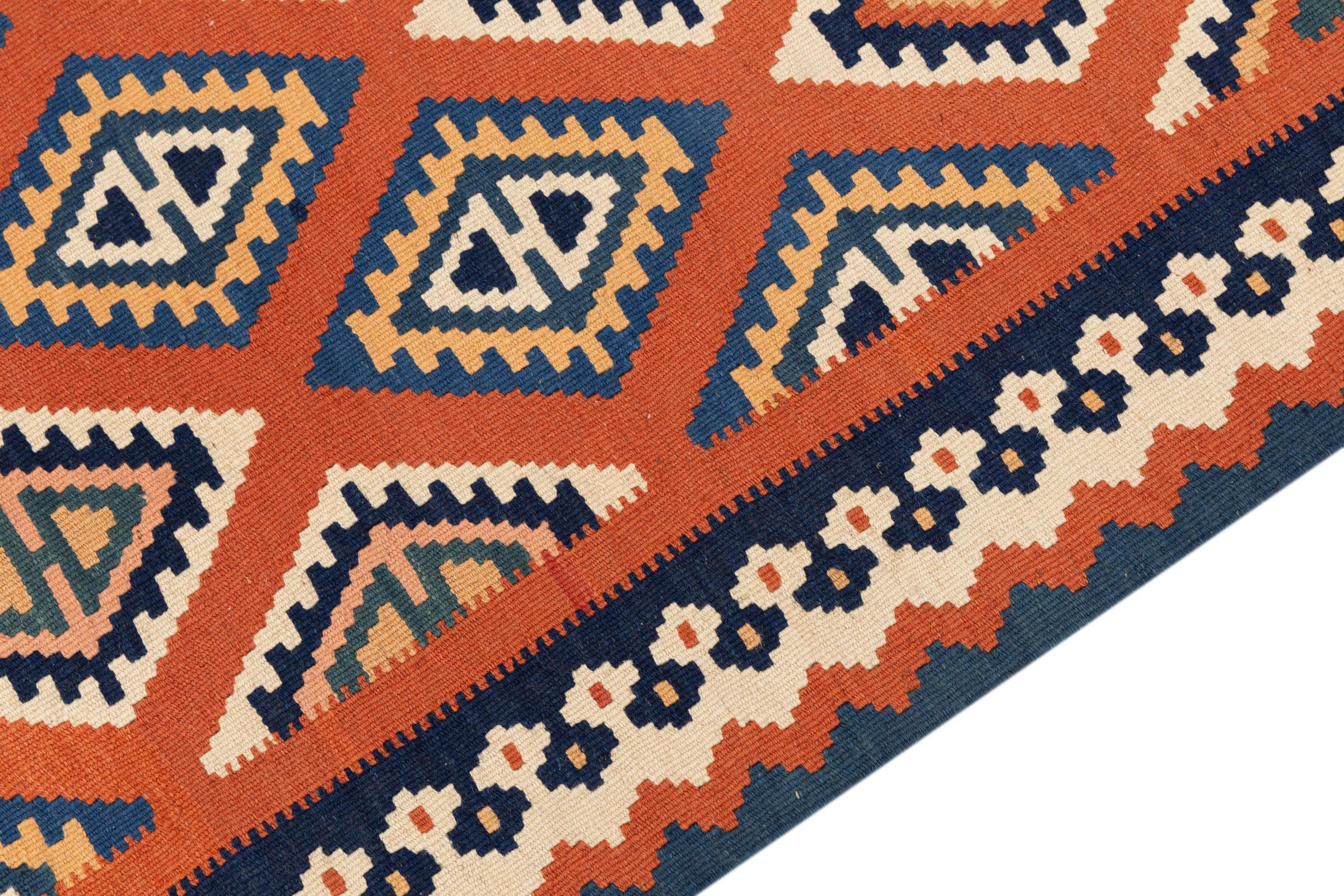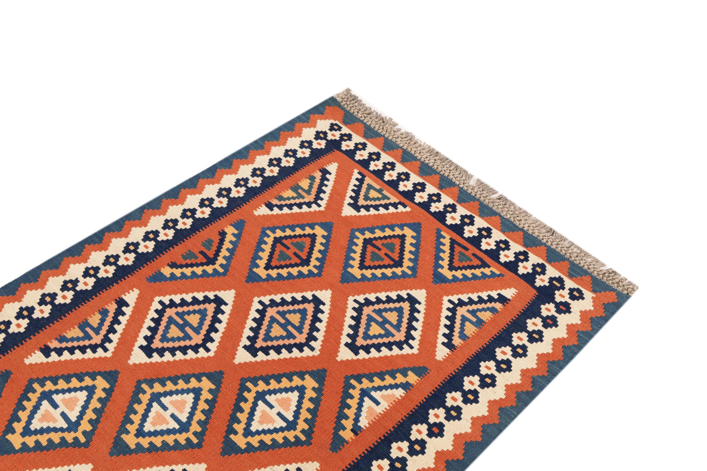 This rug was made as a flat weave by hand on a loom. Flatweave is the term used to describe rugs that have no pile. As the name promises, these rugs are woven and not knotted. This results in a flat rug with a structured surface. Flatweaves are not as soft and usually thinner than knotted rugs. At the same time they are much less complex to manufacture and can usually be laid out from both sides (front and back). Their patterns are usually geometric, which is determined by the fabric.