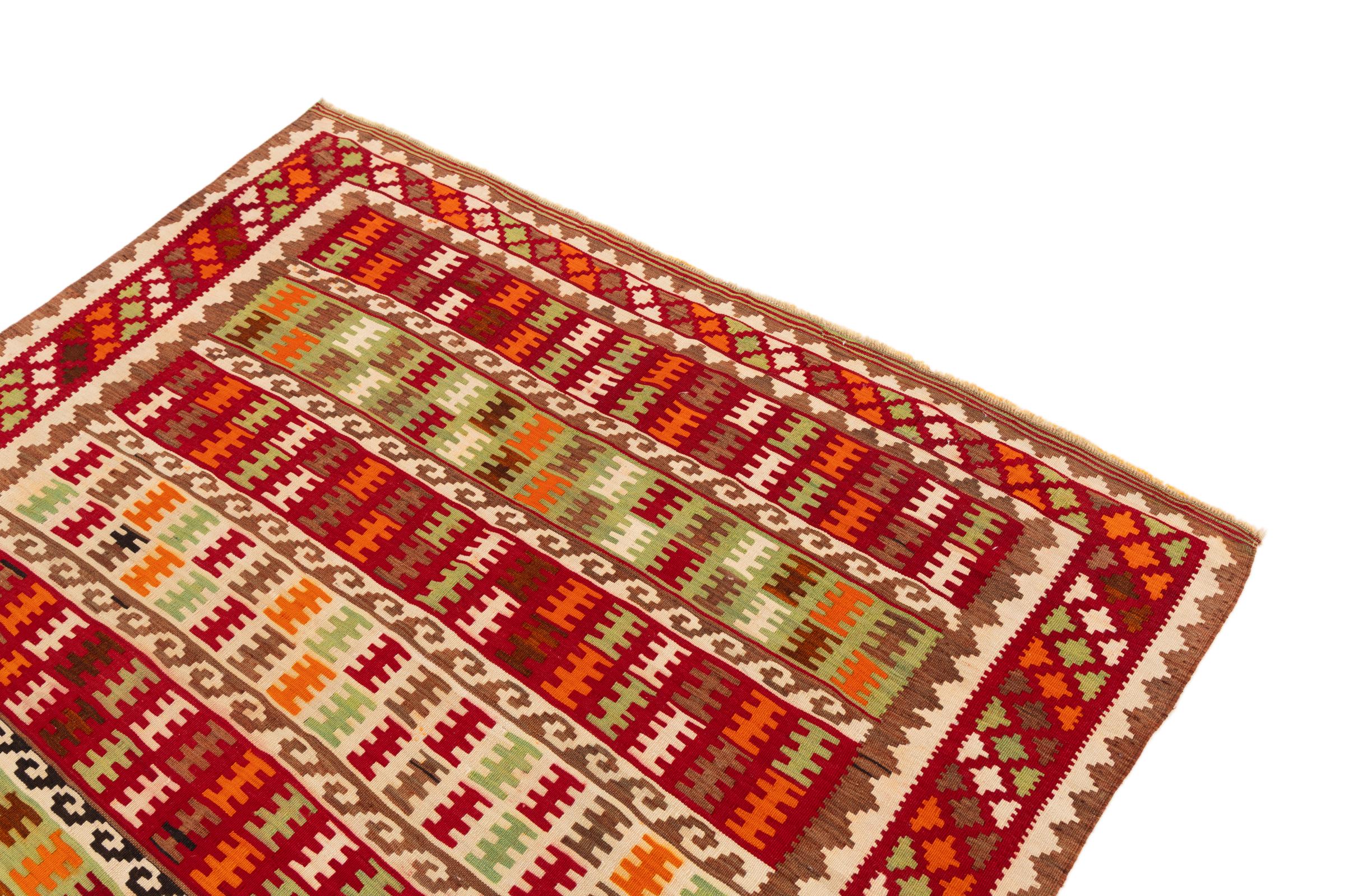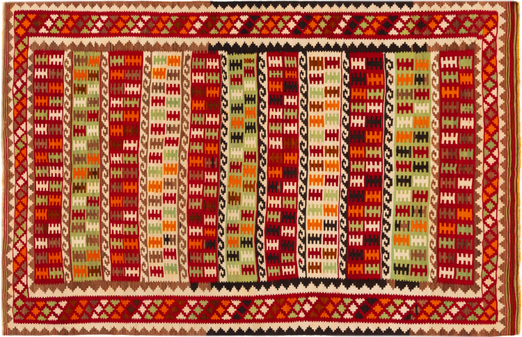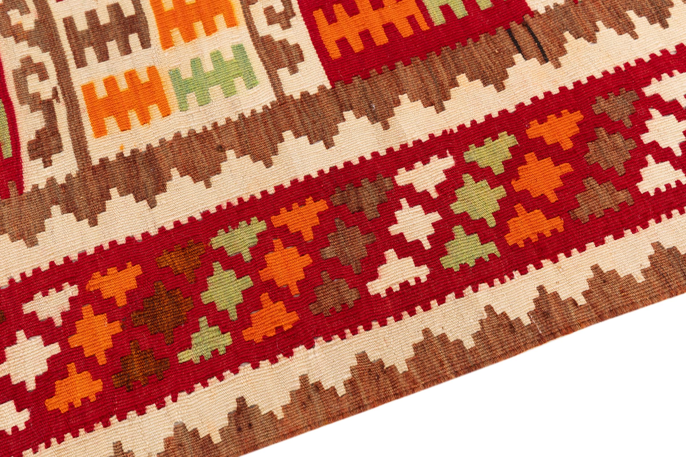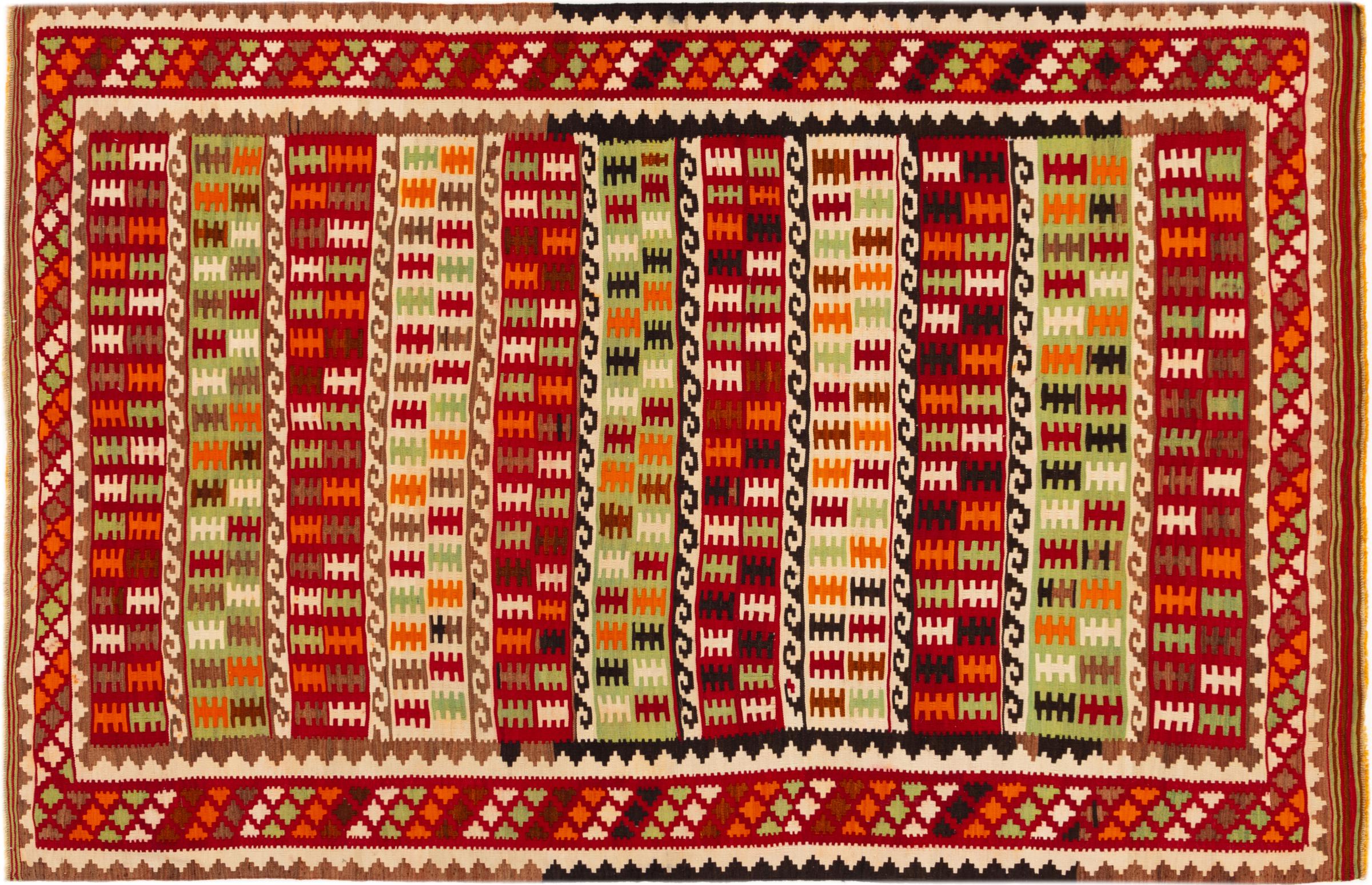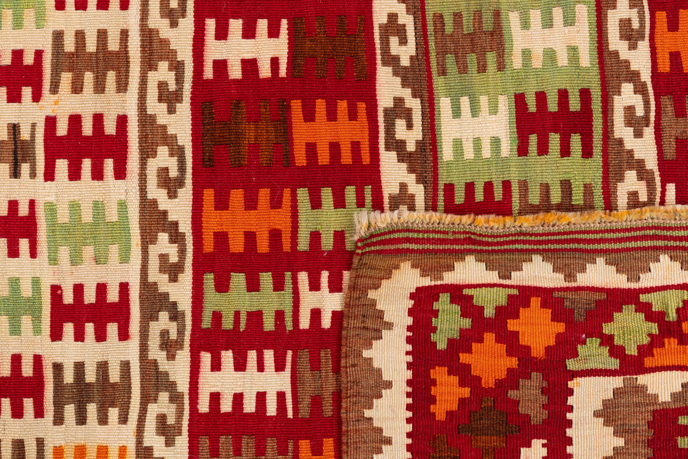 This rug was made as a flat weave by hand on a loom. Flatweave is the term used to describe rugs that have no pile. As the name promises, these rugs are woven and not knotted. This results in a flat rug with a structured surface. Flatweaves are not as soft and usually thinner than knotted rugs. At the same time they are much less complex to manufacture and can usually be laid out from both sides (front and back). Their patterns are usually geometric, which is determined by the fabric.