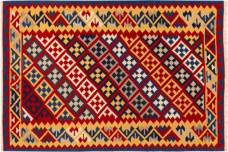 This rug was made as a flat weave by hand on a loom. Flatweave is the term used to describe rugs that have no pile. As the name promises, these rugs are woven and not knotted. This results in a flat rug with a structured surface. Flatweaves are not as soft and usually thinner than knotted rugs. At the same time they are much less complex to manufacture and can usually be laid out from both sides (front and back). Their patterns are usually geometric, which is determined by the fabric.