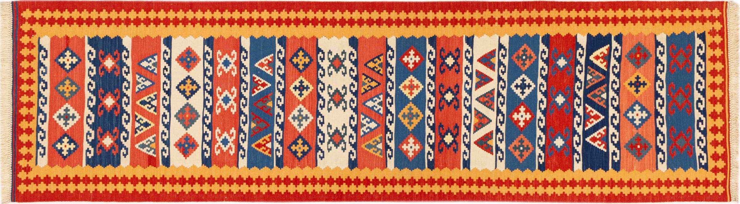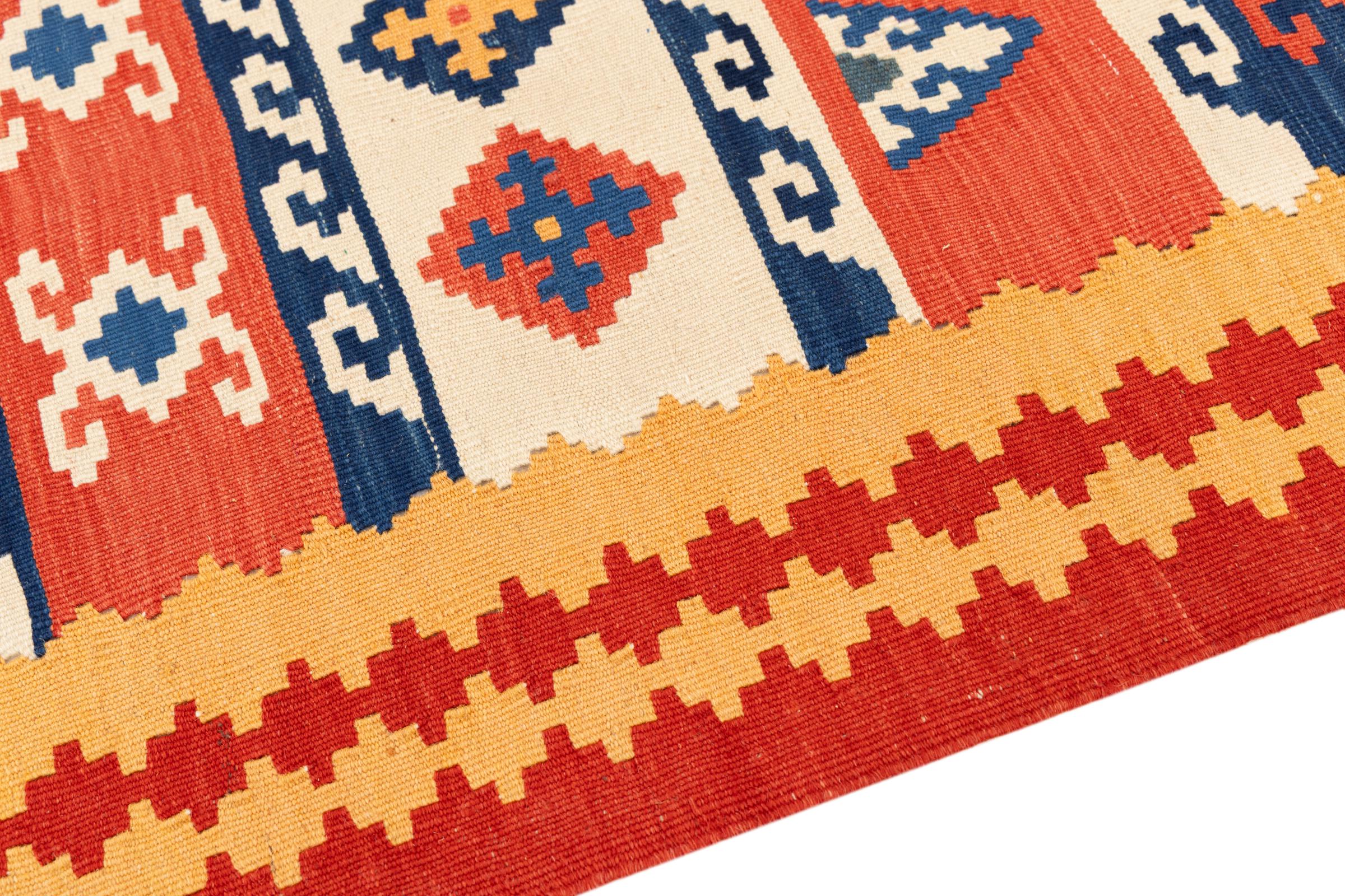 This rug was made as a flat weave by hand on a loom. Flatweave is the term used to describe rugs that have no pile. As the name promises, these rugs are woven and not knotted. This results in a flat rug with a structured surface. Flatweaves are not as soft and usually thinner than knotted rugs. At the same time they are much less complex to manufacture and can usually be laid out from both sides (front and back). Their patterns are usually geometric, which is determined by the fabric.