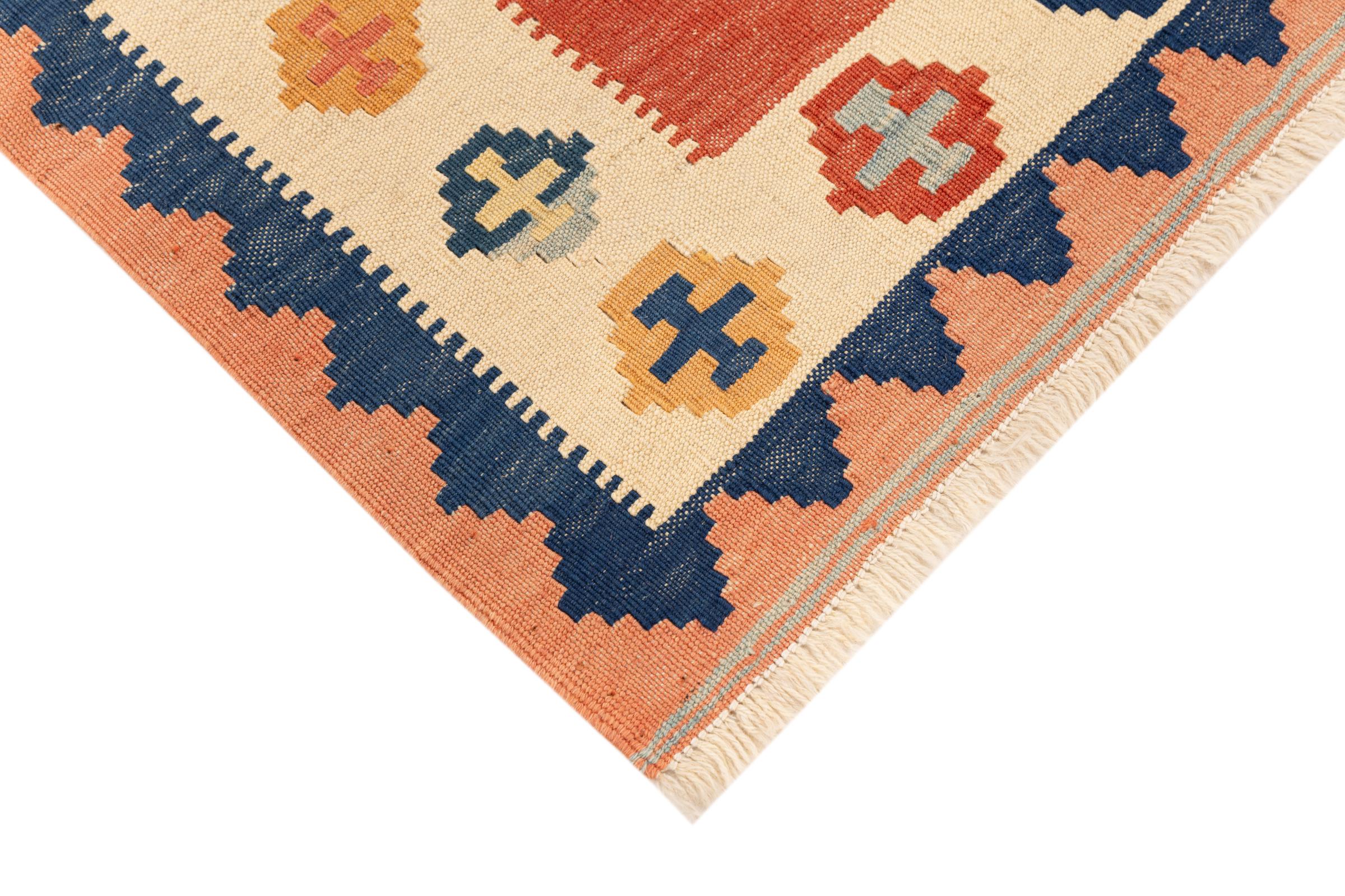 This rug was made as a flat weave by hand on a loom. Flatweave is the term used to describe rugs that have no pile. As the name promises, these rugs are woven and not knotted. This results in a flat rug with a structured surface. Flatweaves are not as soft and usually thinner than knotted rugs. At the same time they are much less complex to manufacture and can usually be laid out from both sides (front and back). Their patterns are usually geometric, which is determined by the fabric.
