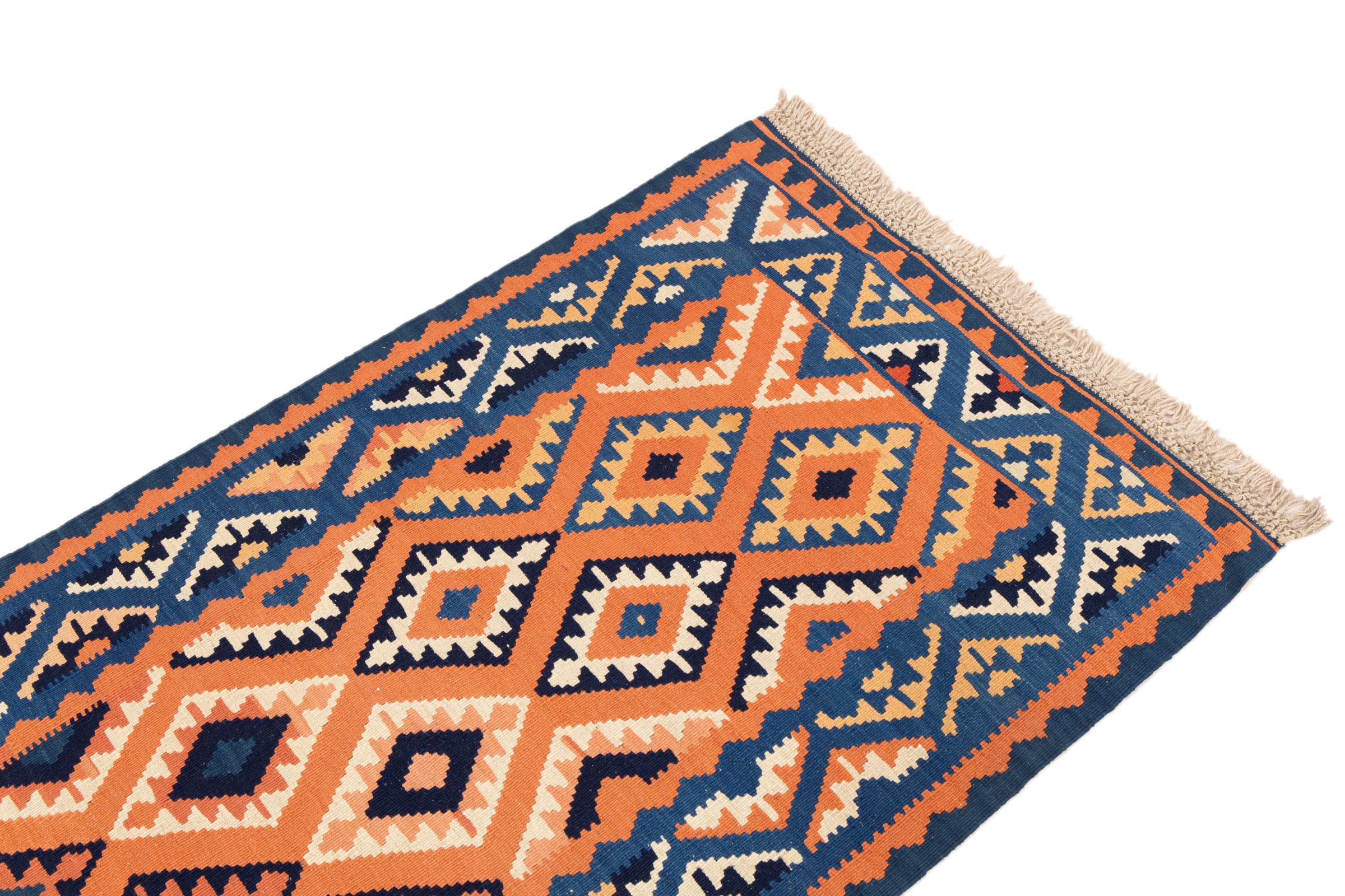 This rug was made as a flat weave by hand on a loom. Flatweave is the term used to describe rugs that have no pile. As the name promises, these rugs are woven and not knotted. This results in a flat rug with a structured surface. Flatweaves are not as soft and usually thinner than knotted rugs. At the same time they are much less complex to manufacture and can usually be laid out from both sides (front and back). Their patterns are usually geometric, which is determined by the fabric.