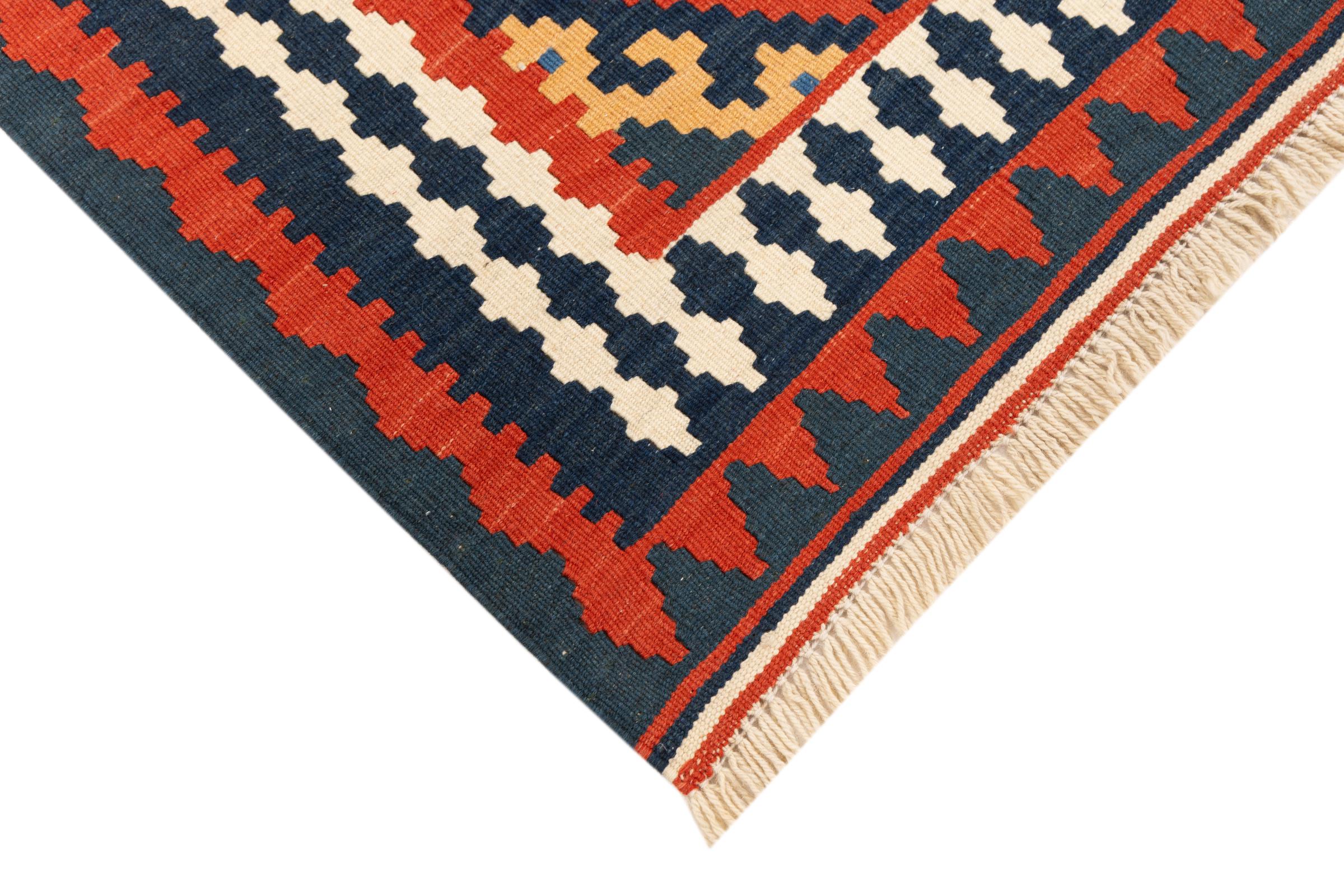 This rug was made as a flat weave by hand on a loom. Flatweave is the term used to describe rugs that have no pile. As the name promises, these rugs are woven and not knotted. This results in a flat rug with a structured surface. Flatweaves are not as soft and usually thinner than knotted rugs. At the same time they are much less complex to manufacture and can usually be laid out from both sides (front and back). Their patterns are usually geometric, which is determined by the fabric.