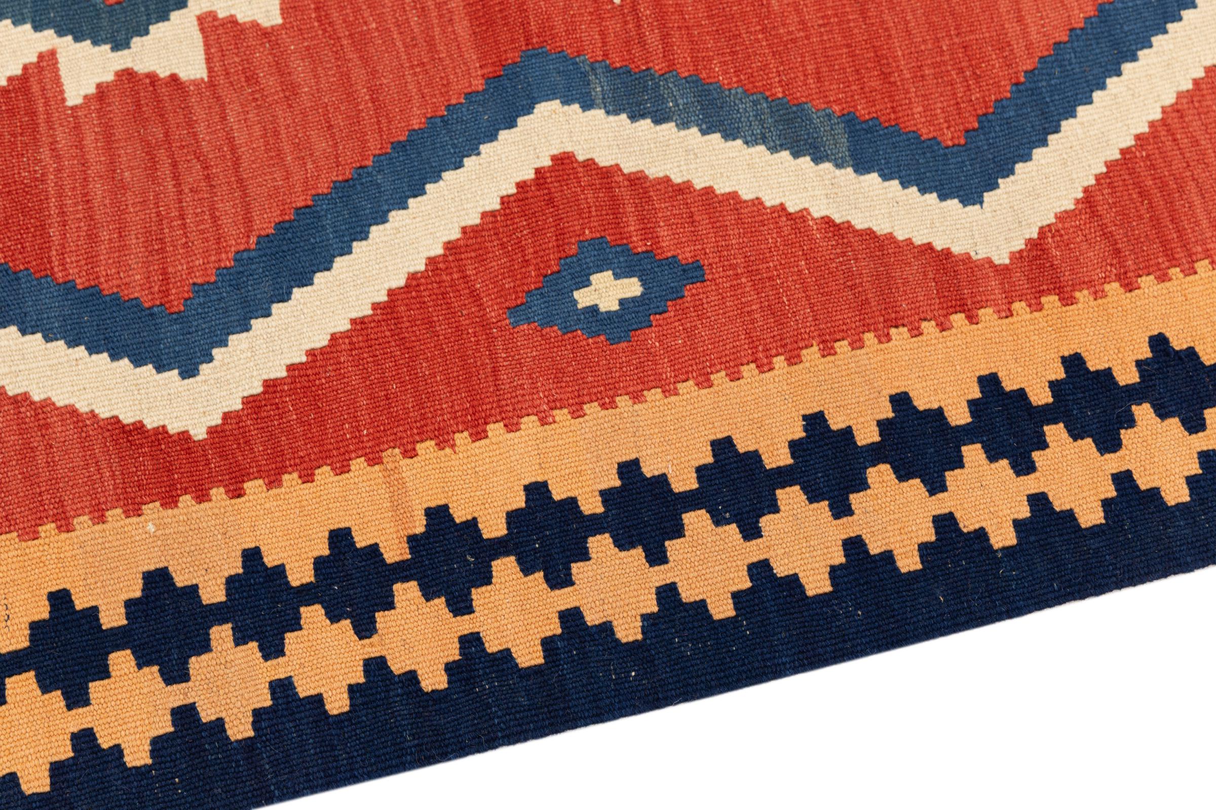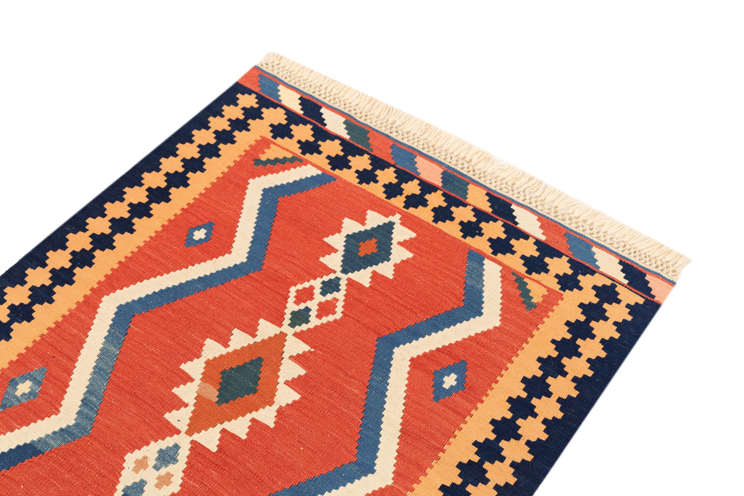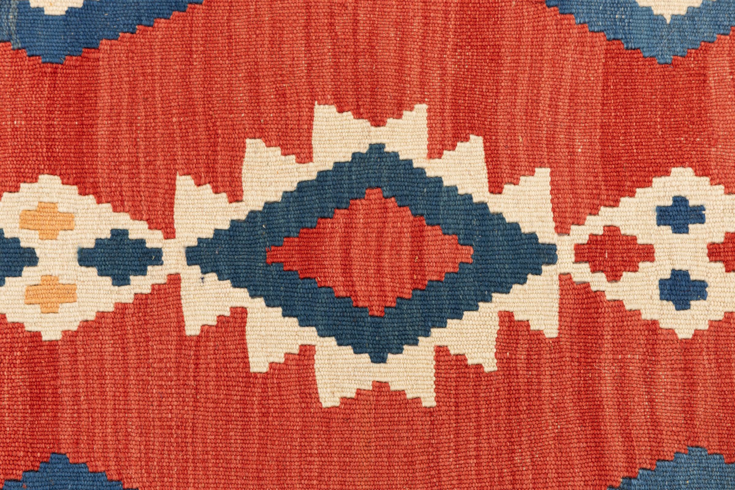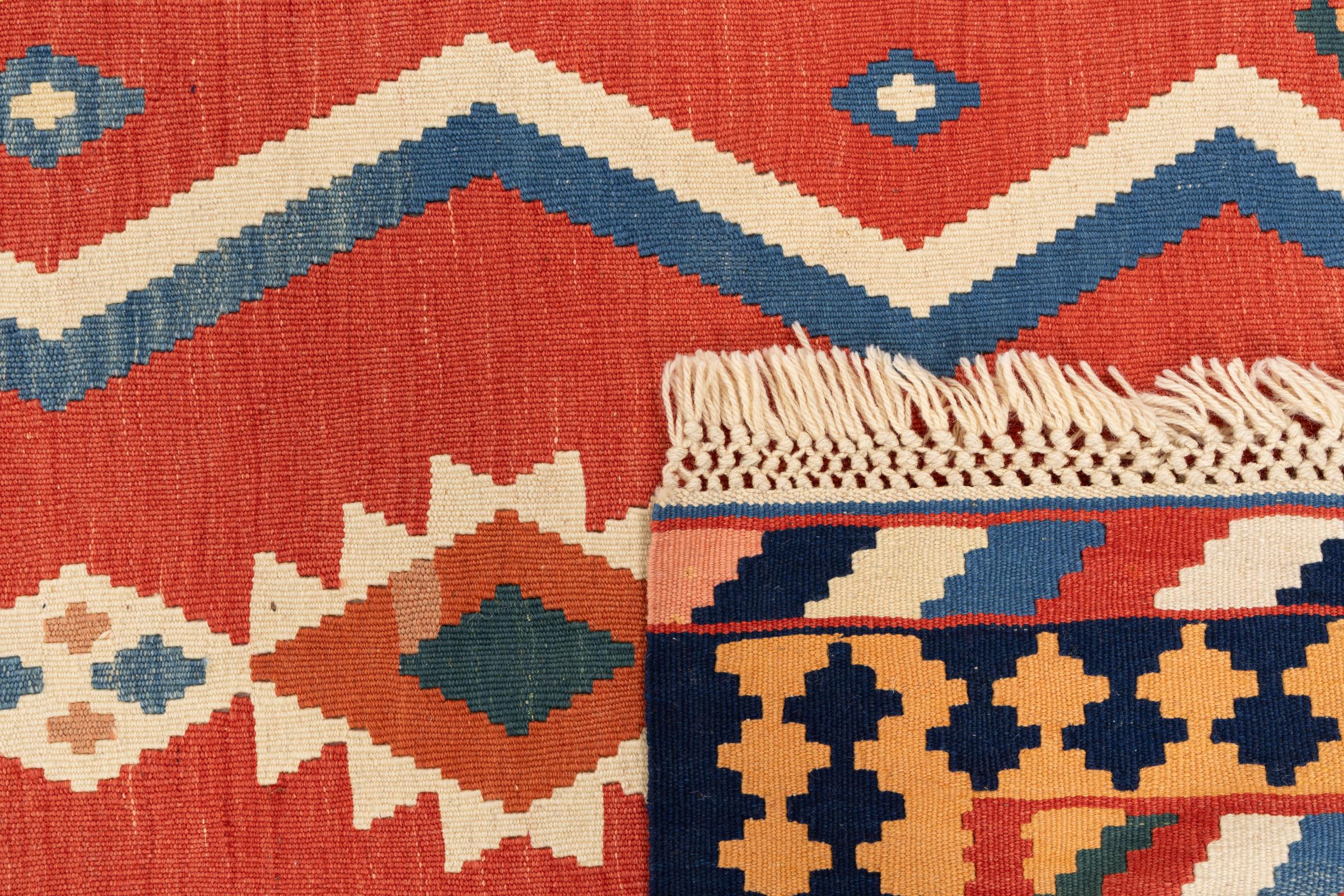 This rug was made as a flat weave by hand on a loom. Flatweave is the term used to describe rugs that have no pile. As the name promises, these rugs are woven and not knotted. This results in a flat rug with a structured surface. Flatweaves are not as soft and usually thinner than knotted rugs. At the same time they are much less complex to manufacture and can usually be laid out from both sides (front and back). Their patterns are usually geometric, which is determined by the fabric.