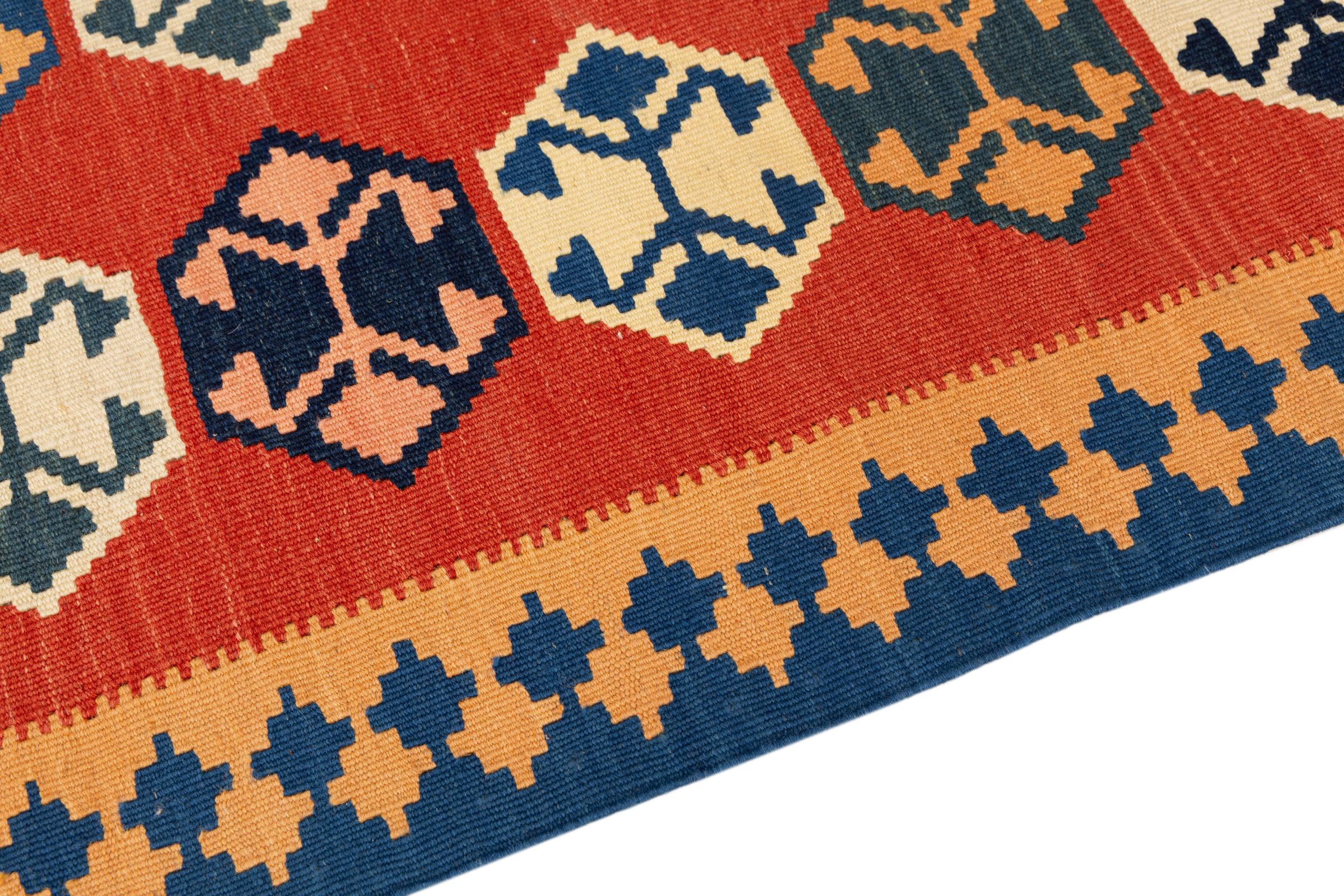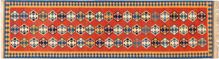 This rug was made as a flat weave by hand on a loom. Flatweave is the term used to describe rugs that have no pile. As the name promises, these rugs are woven and not knotted. This results in a flat rug with a structured surface. Flatweaves are not as soft and usually thinner than knotted rugs. At the same time they are much less complex to manufacture and can usually be laid out from both sides (front and back). Their patterns are usually geometric, which is determined by the fabric.