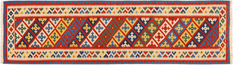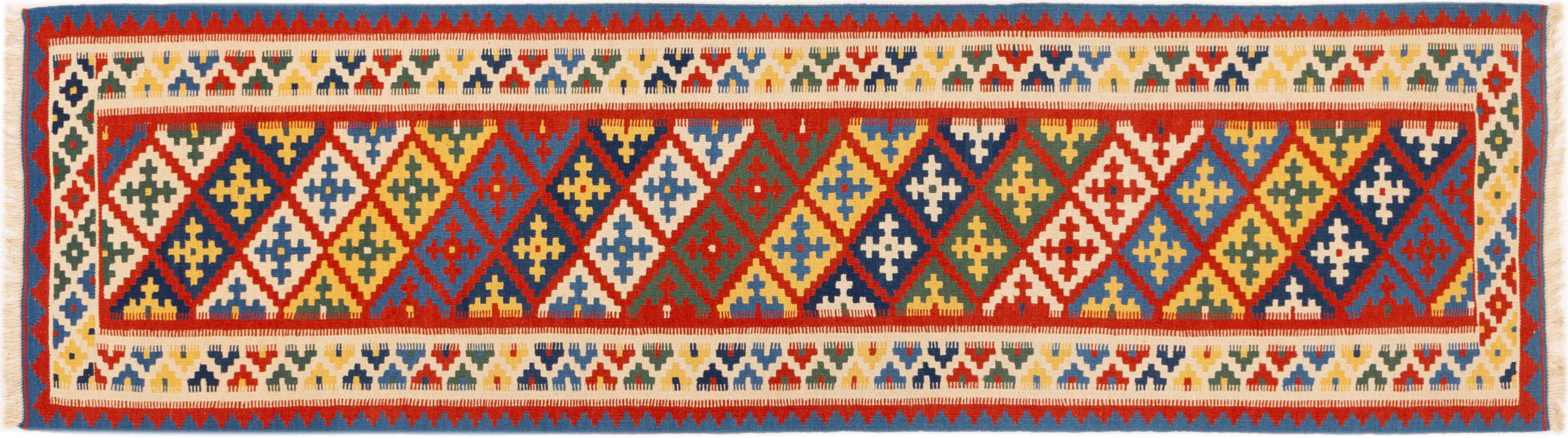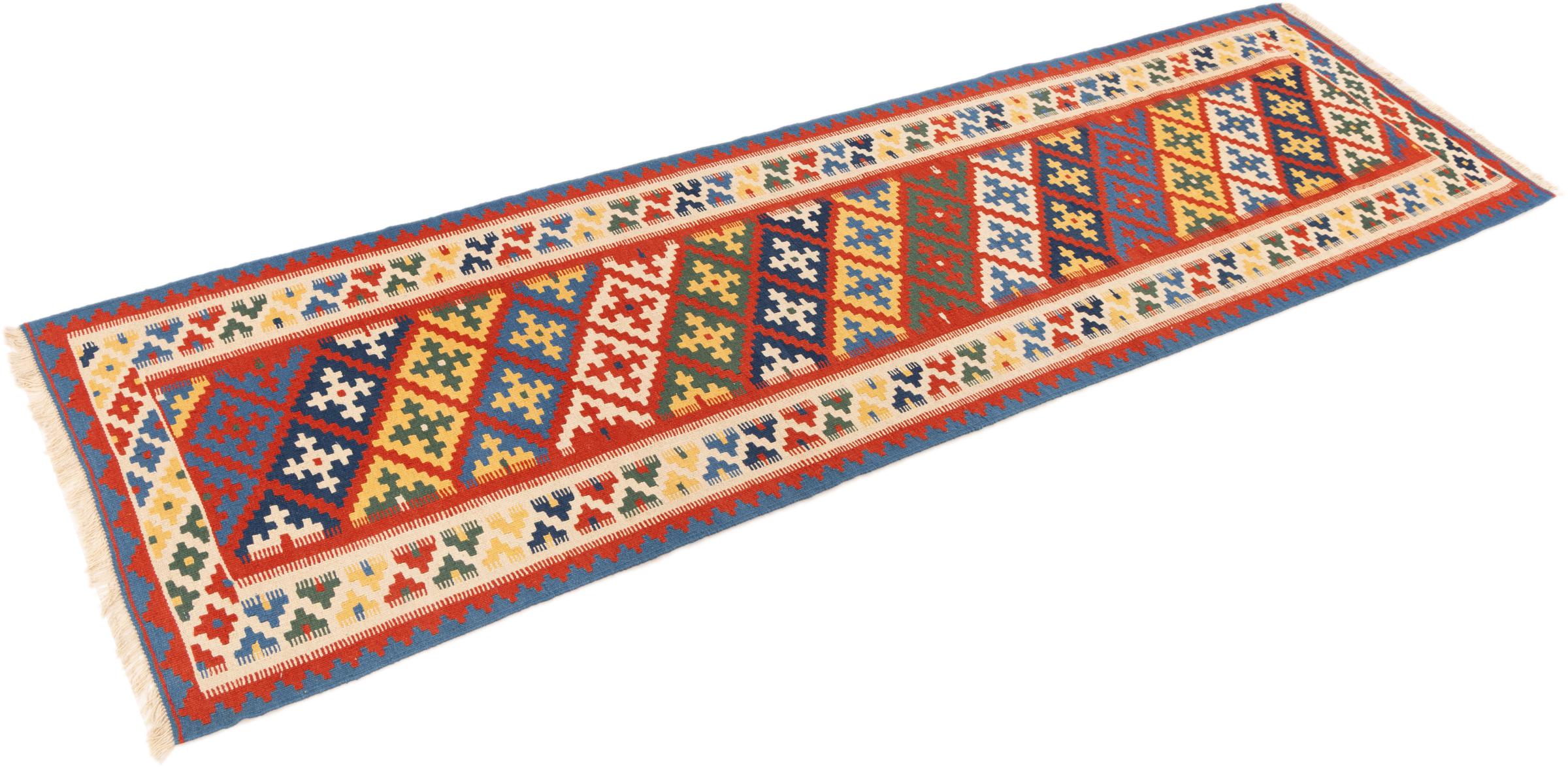 This rug was made as a flat weave by hand on a loom. Flatweave is the term used to describe rugs that have no pile. As the name promises, these rugs are woven and not knotted. This results in a flat rug with a structured surface. Flatweaves are not as soft and usually thinner than knotted rugs. At the same time they are much less complex to manufacture and can usually be laid out from both sides (front and back). Their patterns are usually geometric, which is determined by the fabric.