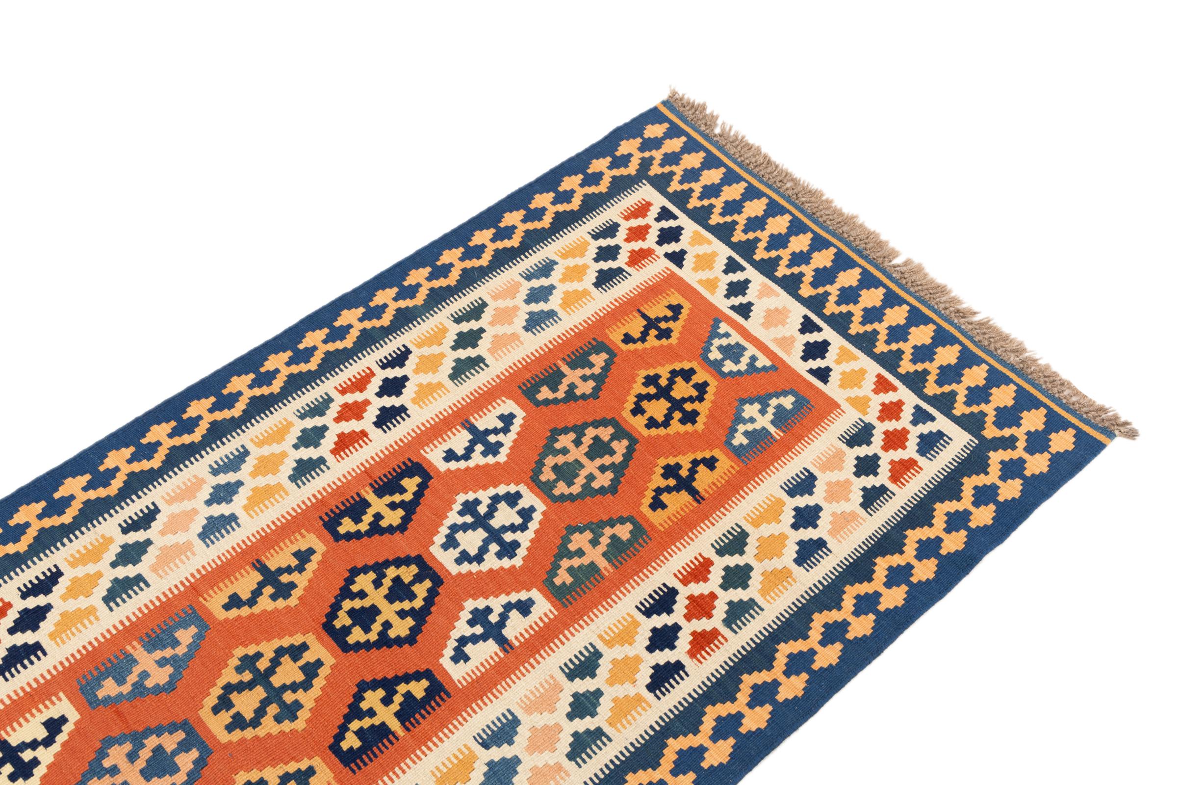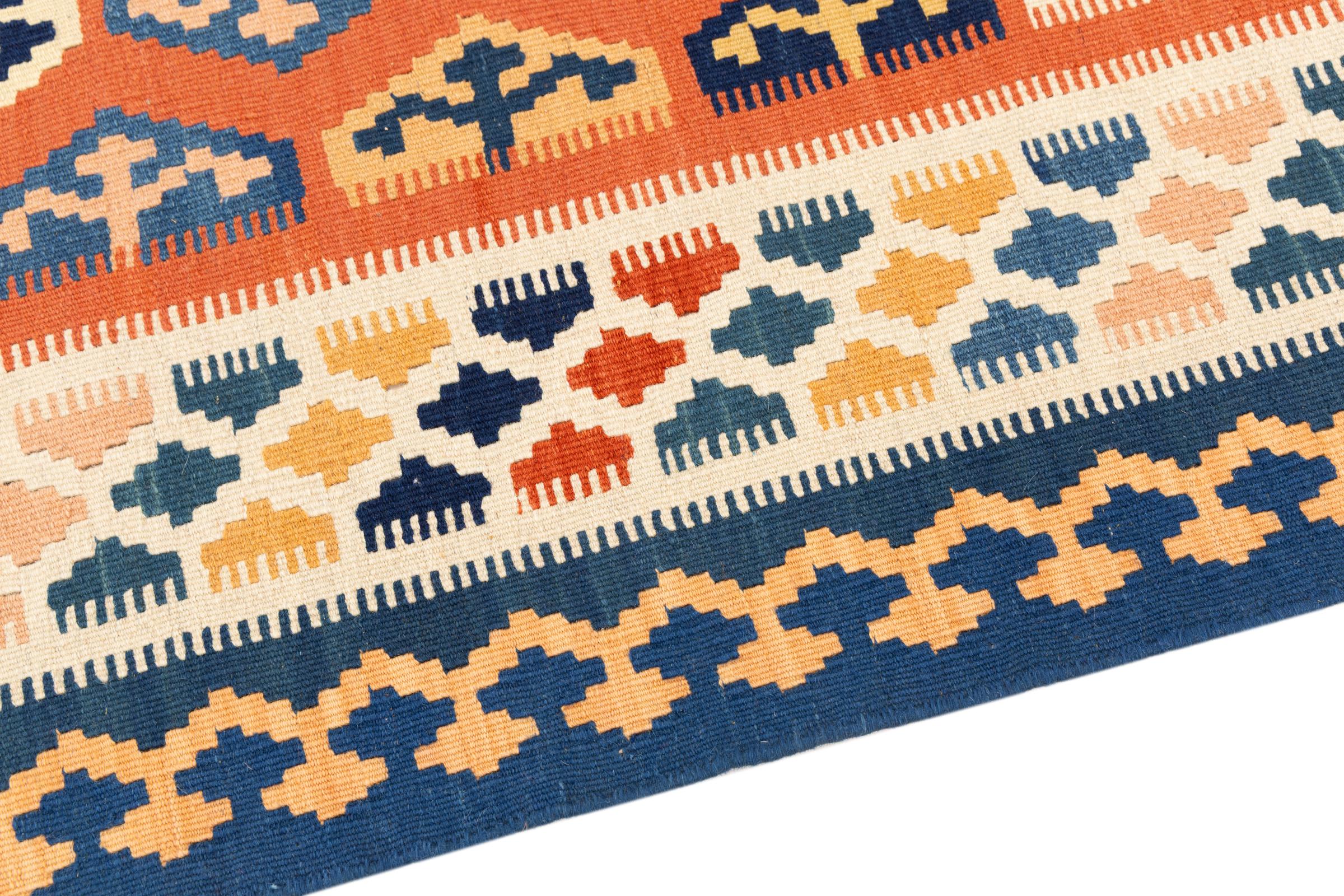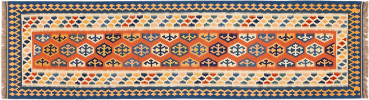 This rug was made as a flat weave by hand on a loom. Flatweave is the term used to describe rugs that have no pile. As the name promises, these rugs are woven and not knotted. This results in a flat rug with a structured surface. Flatweaves are not as soft and usually thinner than knotted rugs. At the same time they are much less complex to manufacture and can usually be laid out from both sides (front and back). Their patterns are usually geometric, which is determined by the fabric.