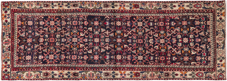 Carpet ID: 295911005135 Size: 303x102 cm Thickness: ap. 12 mm Knot density: 200 000 - 250 000 / m² Manufacturing: Knotted by hand Pile: Handspun wool Warp: Cotton Origin: Persia Age: New Weight: ap. 11 kg Also know as Huseinabad In stock: Unique - Only 1 in stock