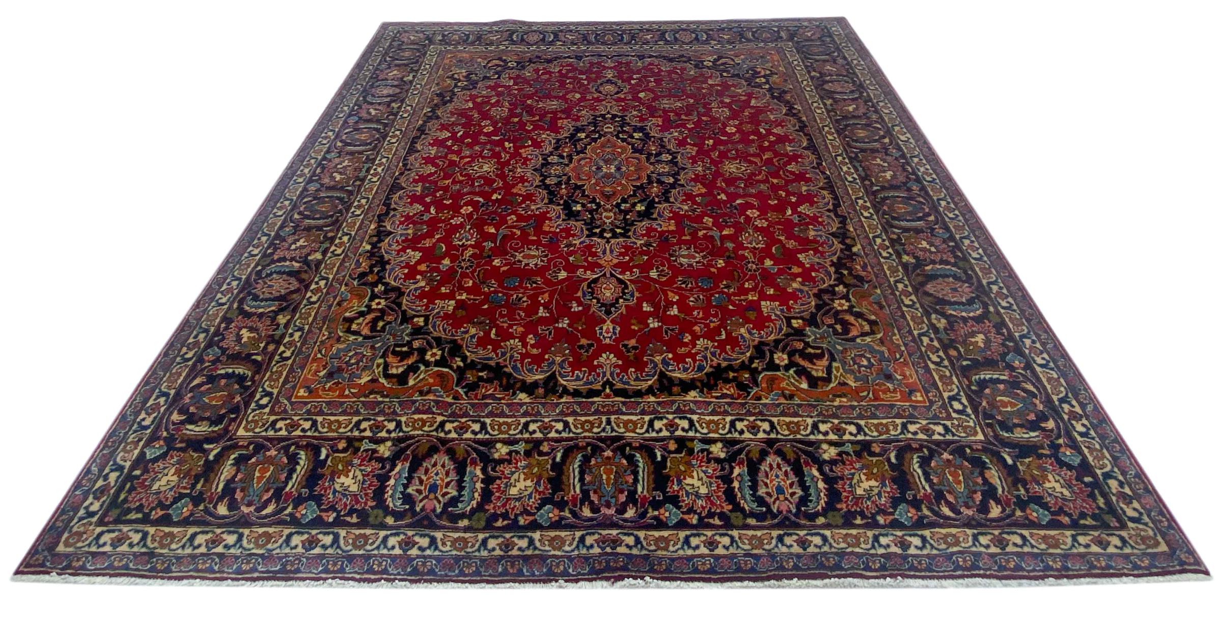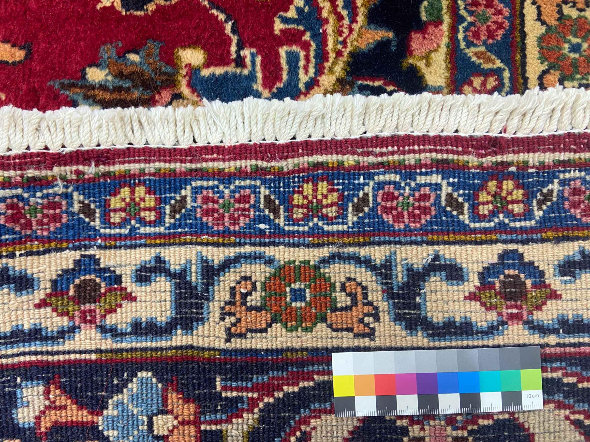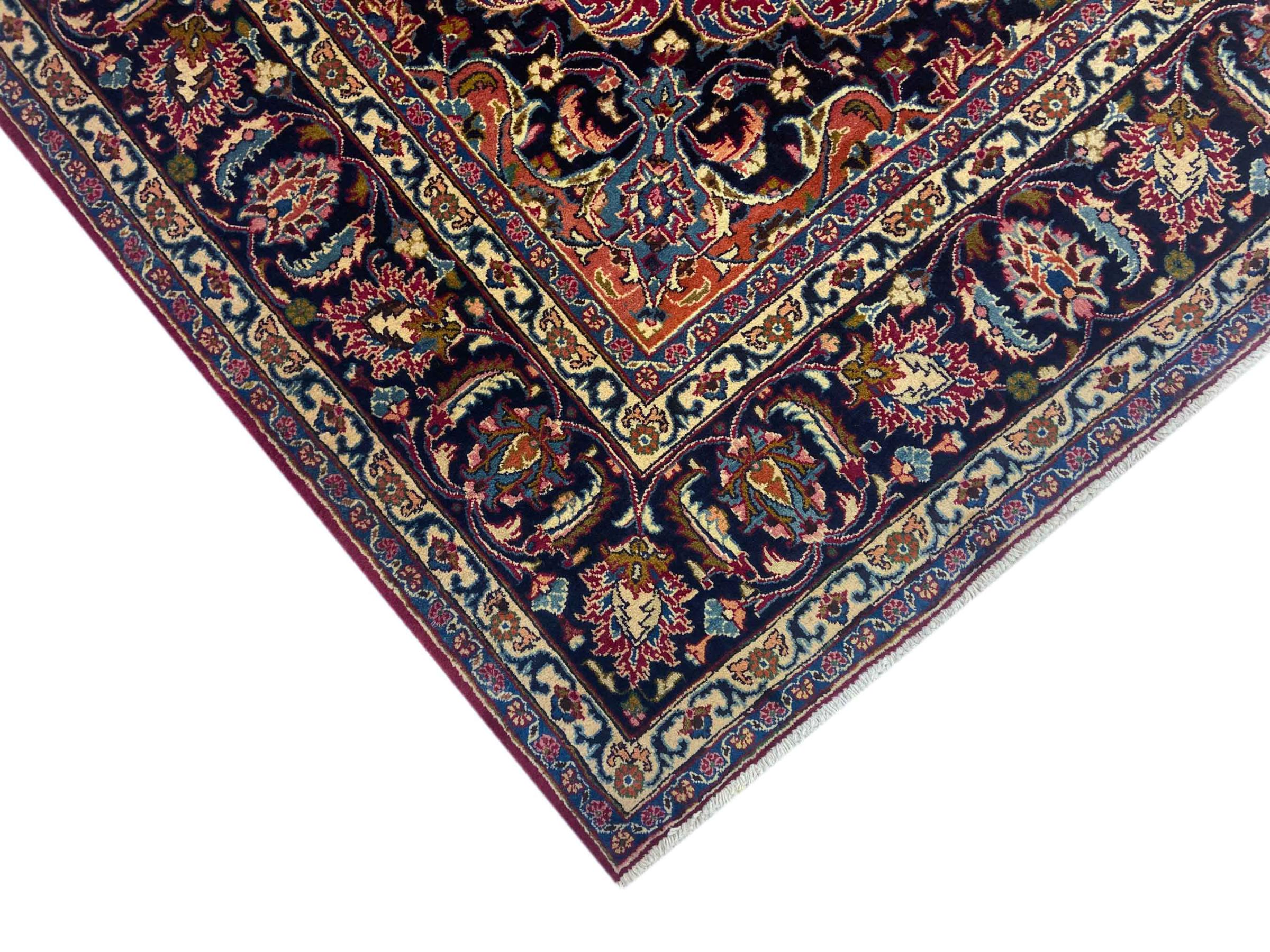 This carpet originates from Mashhad, one of the biggest cities of Iran and Persia. Mashhad carpets are known to be robust and enduring. Mostly they come in extraordinary large scales. A large genuine Persian carpet like this one requires a lot of skill and experience. Generally, it takes several months to craft such a carpet by hand in traditional handicraft.