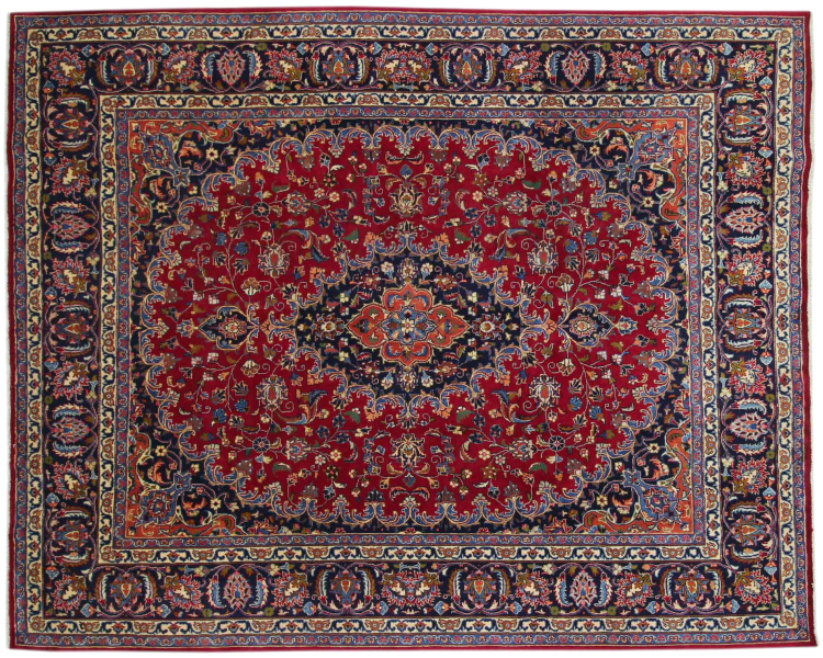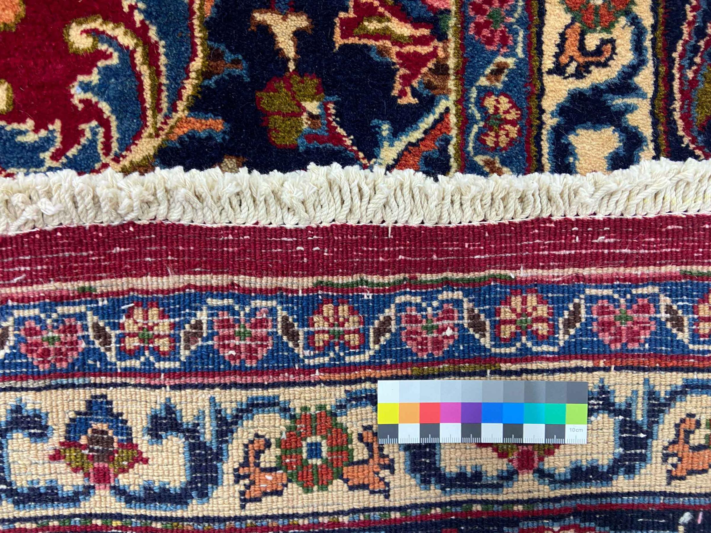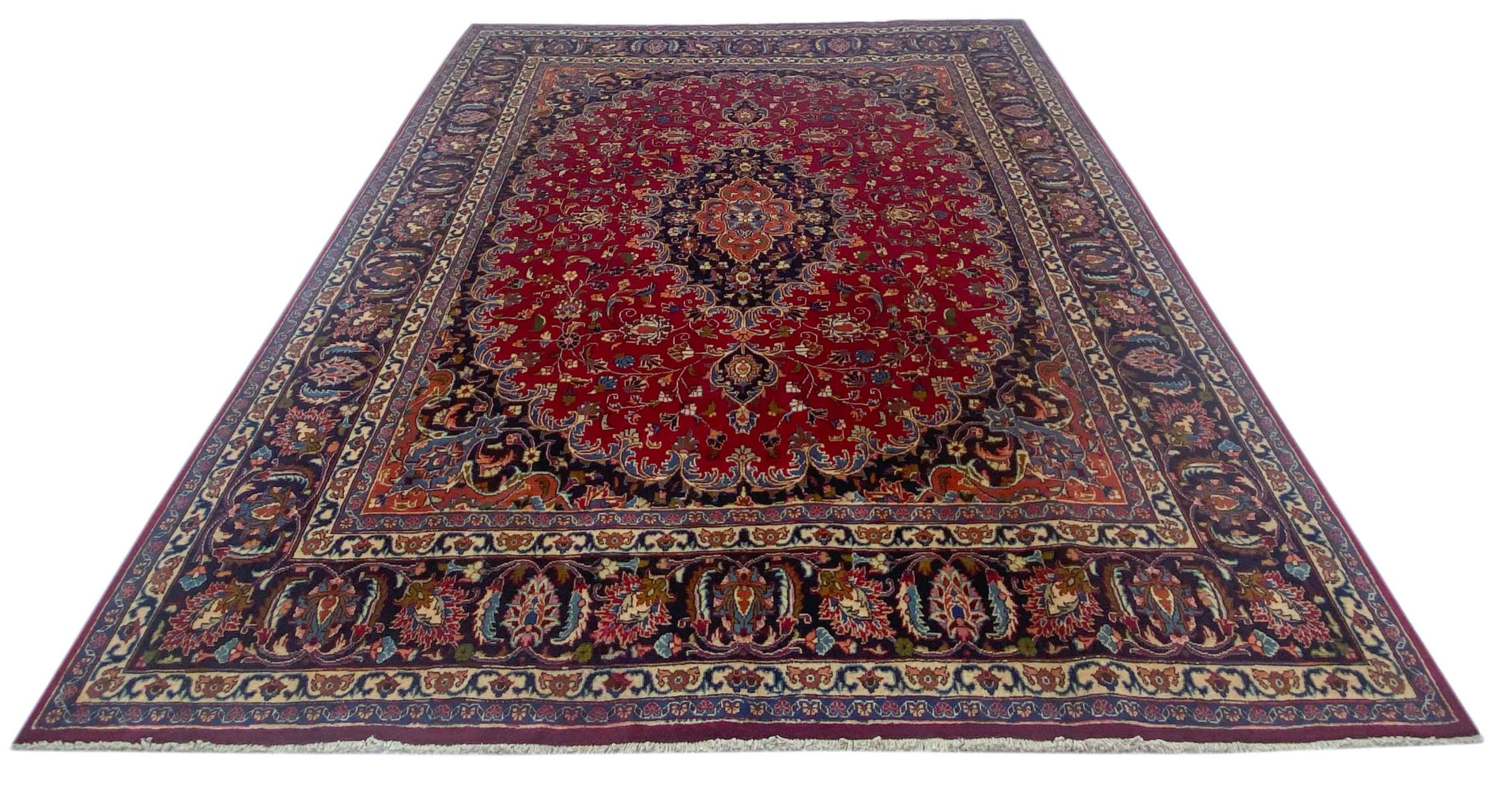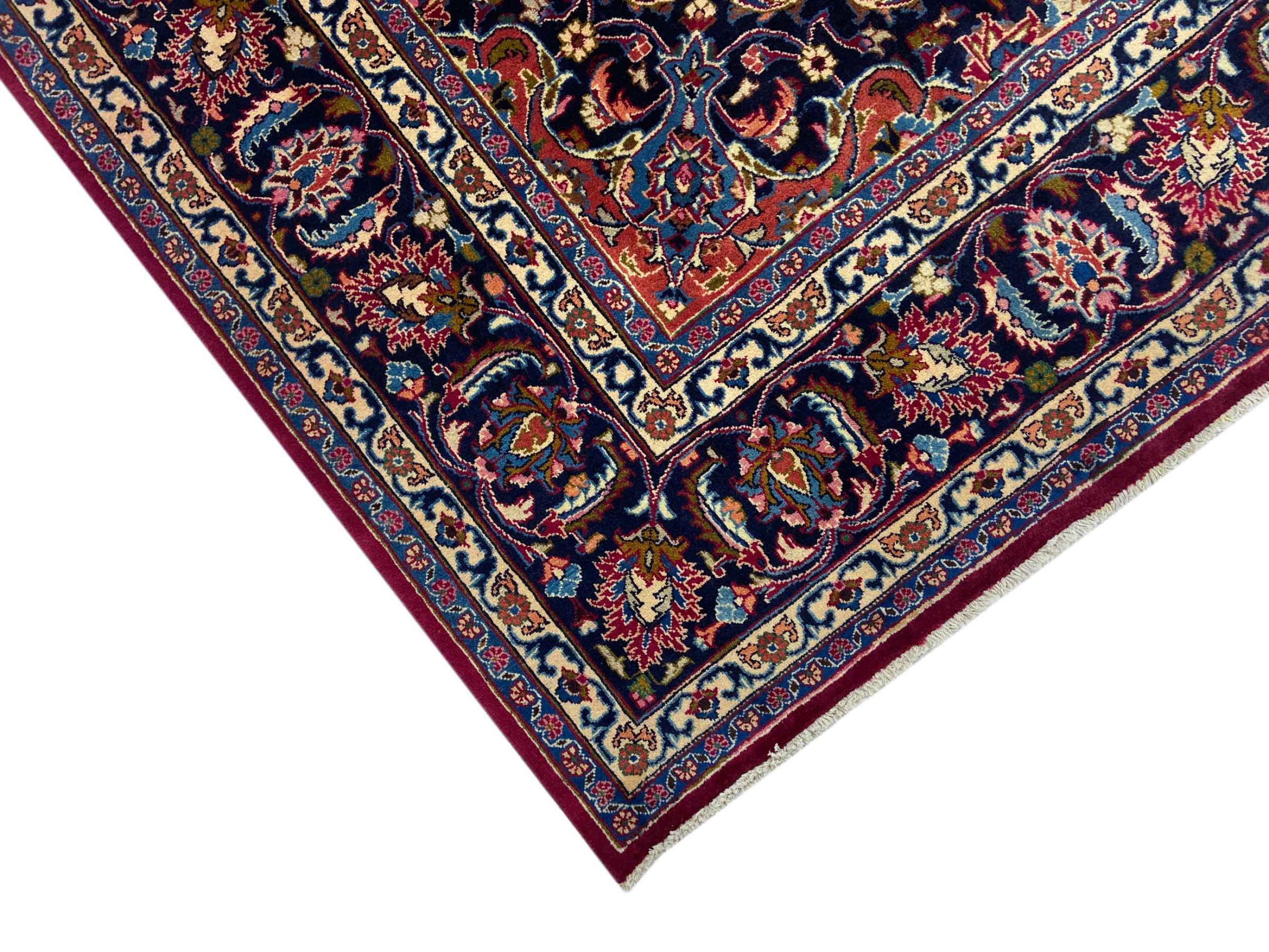 This carpet originates from Mashhad, one of the biggest cities of Iran and Persia. Mashhad carpets are known to be robust and enduring. Mostly they come in extraordinary large scales. A large genuine Persian carpet like this one requires a lot of skill and experience. Generally, it takes several months to craft such a carpet by hand in traditional handicraft.