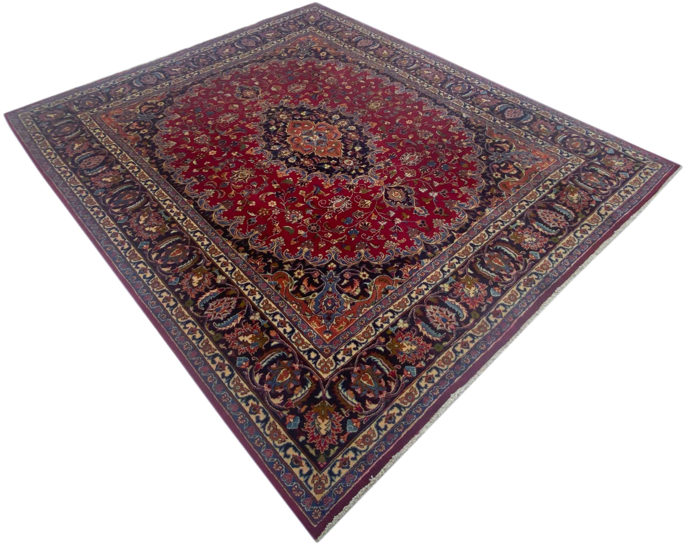 Carpet ID: 318119008629211 Size: 301x252 cm Thickness: ap. 12 mm Knot density: 200 000 - 250 000 / m² Manufacturing: Knotted by hand Pile: Handspun wool Warp: Cotton Origin: Persia Age: New Weight: ap. 27 kg Also know as Maschad, Meshed In stock: Unique - Only 1 in stock