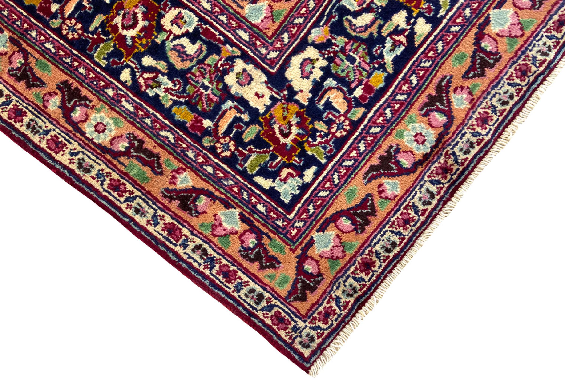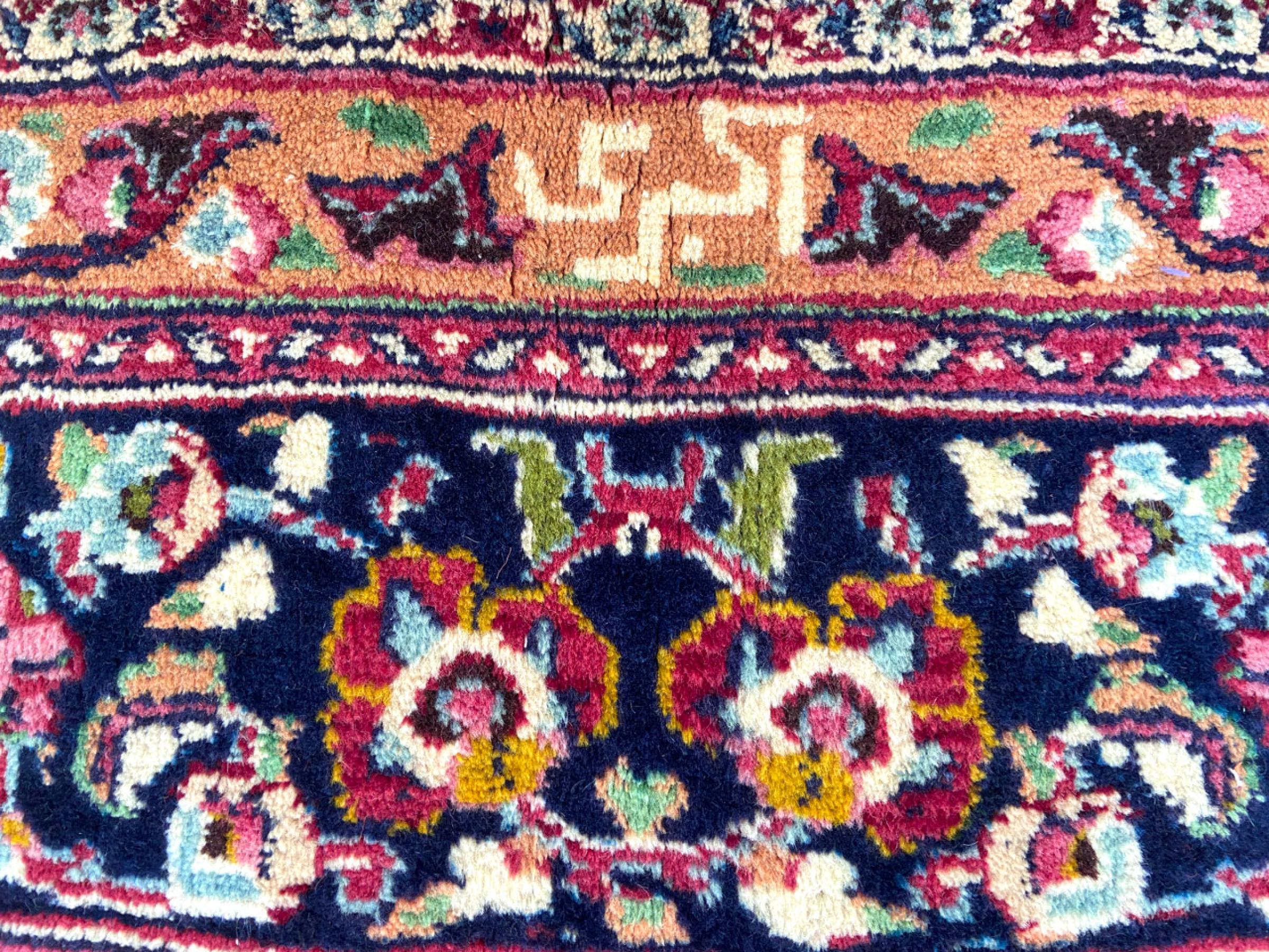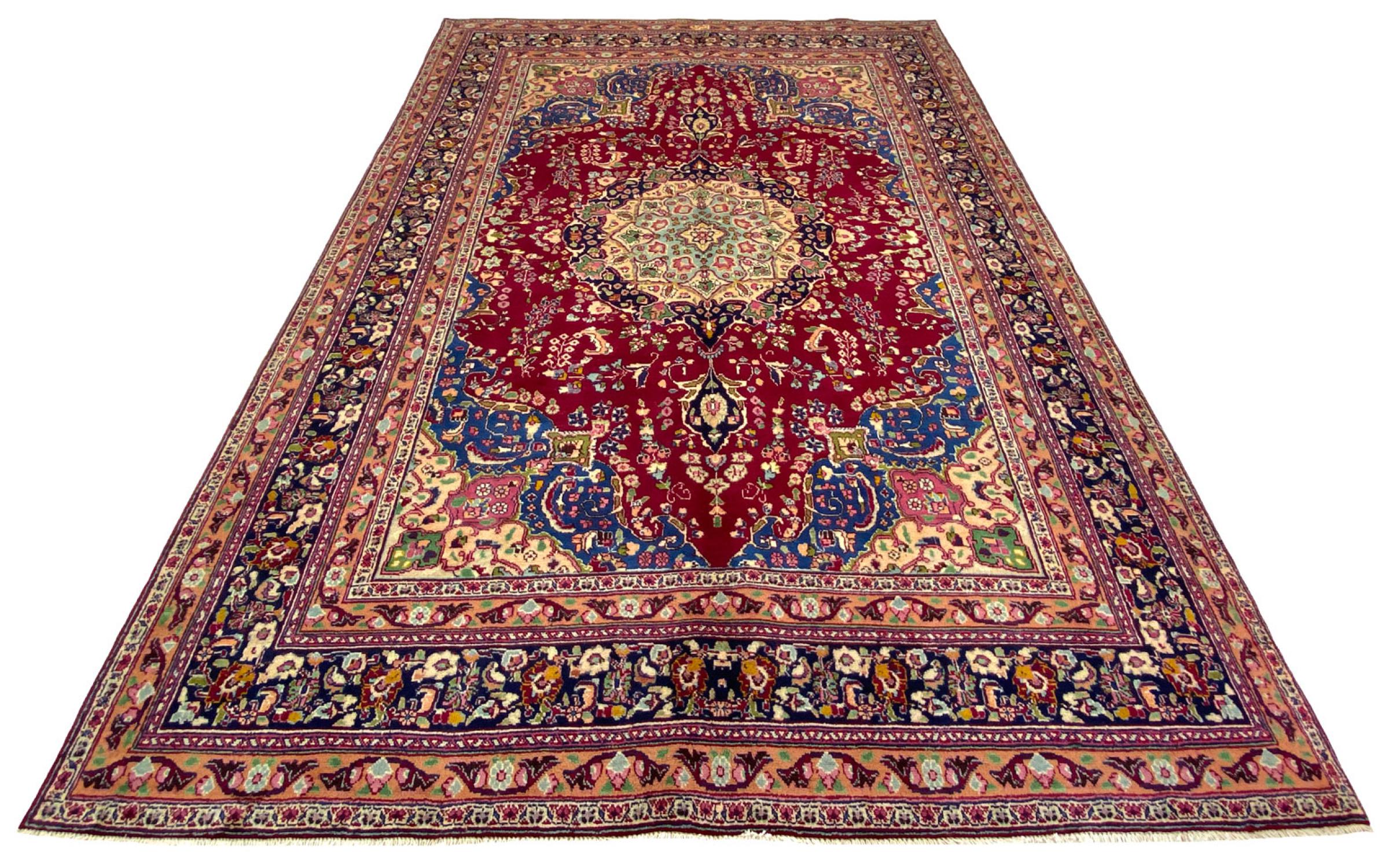 This carpet originates from Mashhad, one of the biggest cities of Iran and Persia. Mashhad carpets are known to be robust and enduring. Mostly they come in extraordinary large scales. A large genuine Persian carpet like this one requires a lot of skill and experience. Generally, it takes several months to craft such a carpet by hand in traditional handicraft.