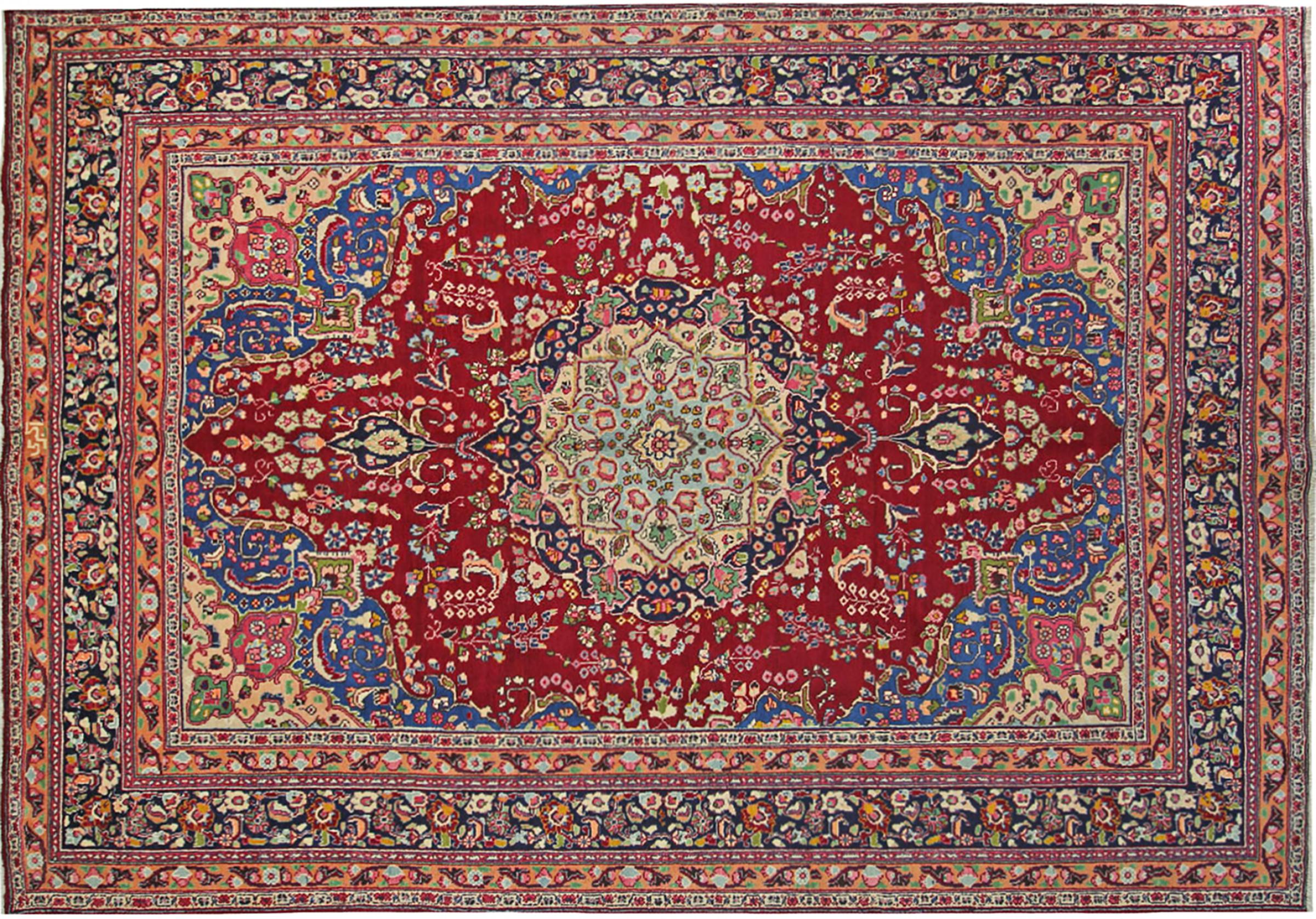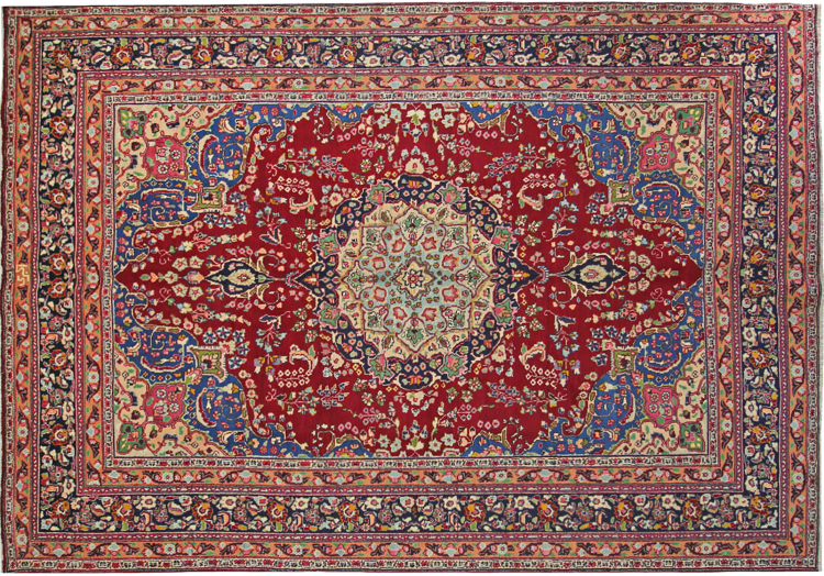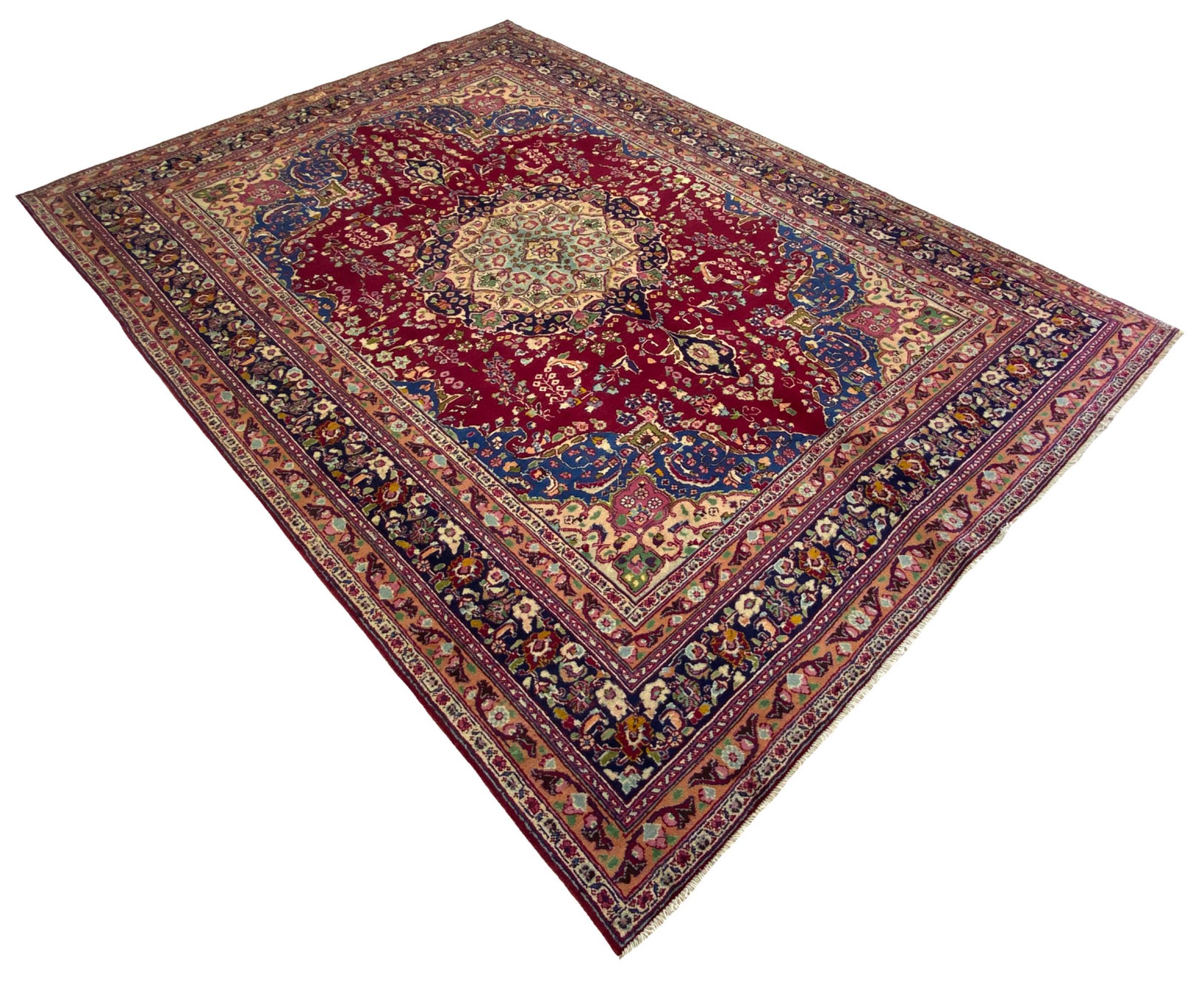 This carpet originates from Mashhad, one of the biggest cities of Iran and Persia. Mashhad carpets are known to be robust and enduring. Mostly they come in extraordinary large scales. A large genuine Persian carpet like this one requires a lot of skill and experience. Generally, it takes several months to craft such a carpet by hand in traditional handicraft.