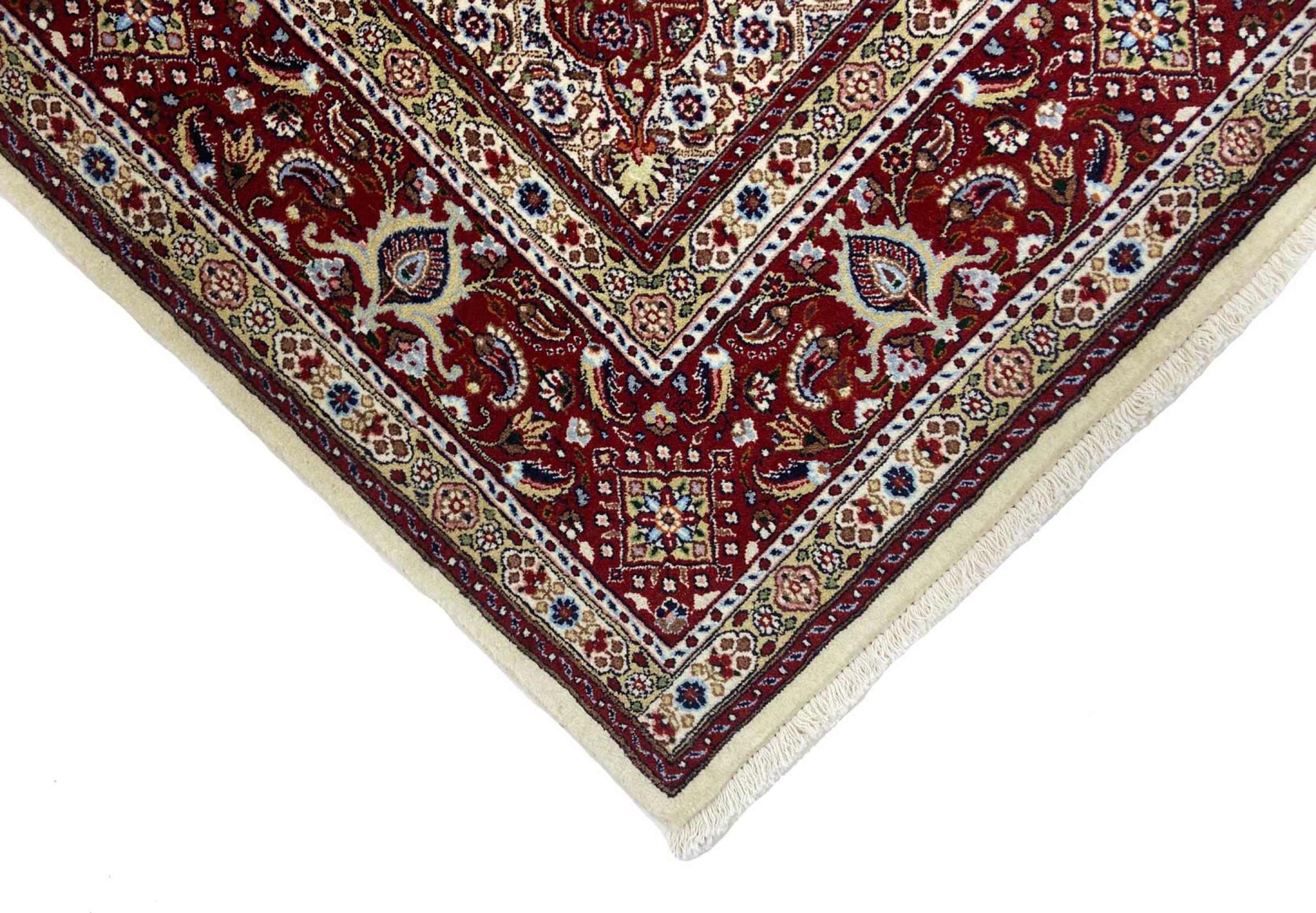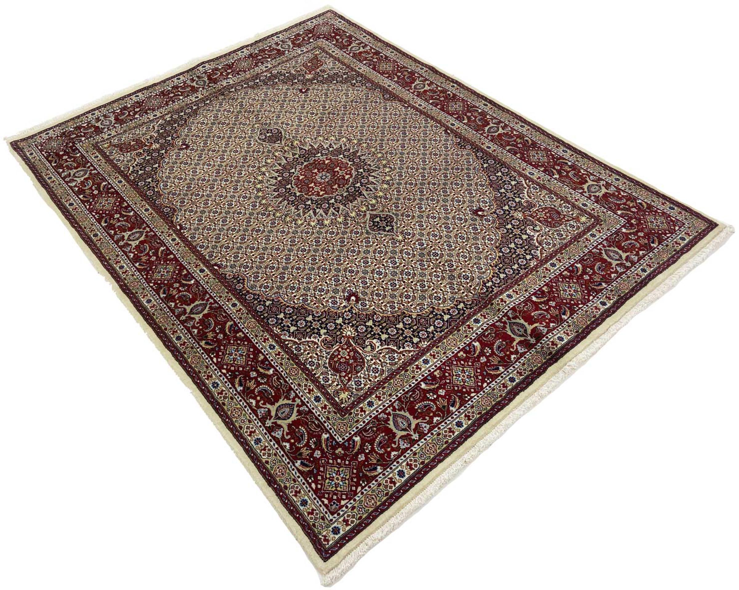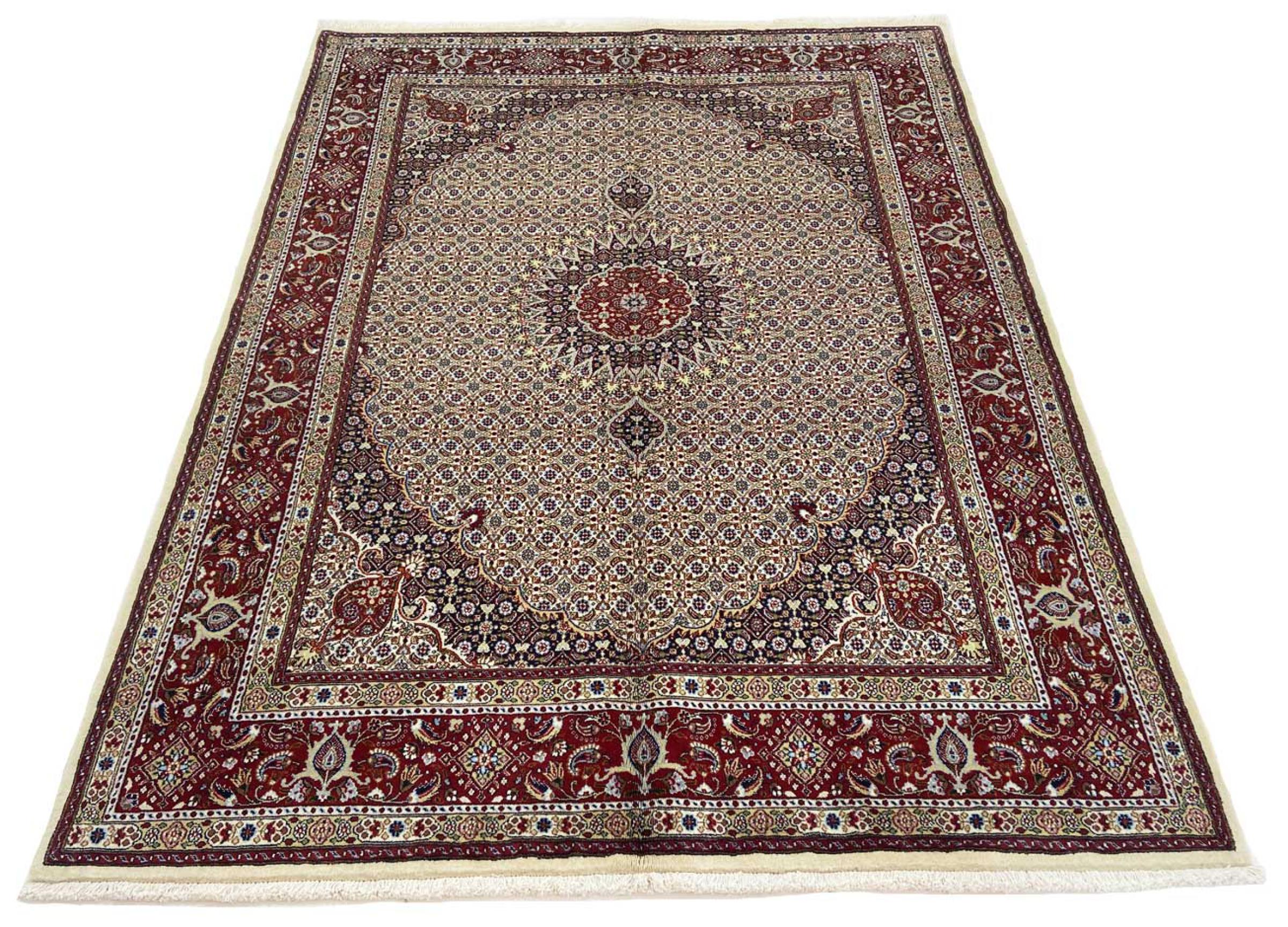 This carpet from Moud, a city 300 kilometres south of Mashhad, impresses at first glance. The typical Herati pattern or garden design is appreciated by connoisseurs and lovers of genuine Persian rugs. If you are looking for a handmade rug of fine quality with a very unique and distinctive design, this type of rug is the perfect choice.