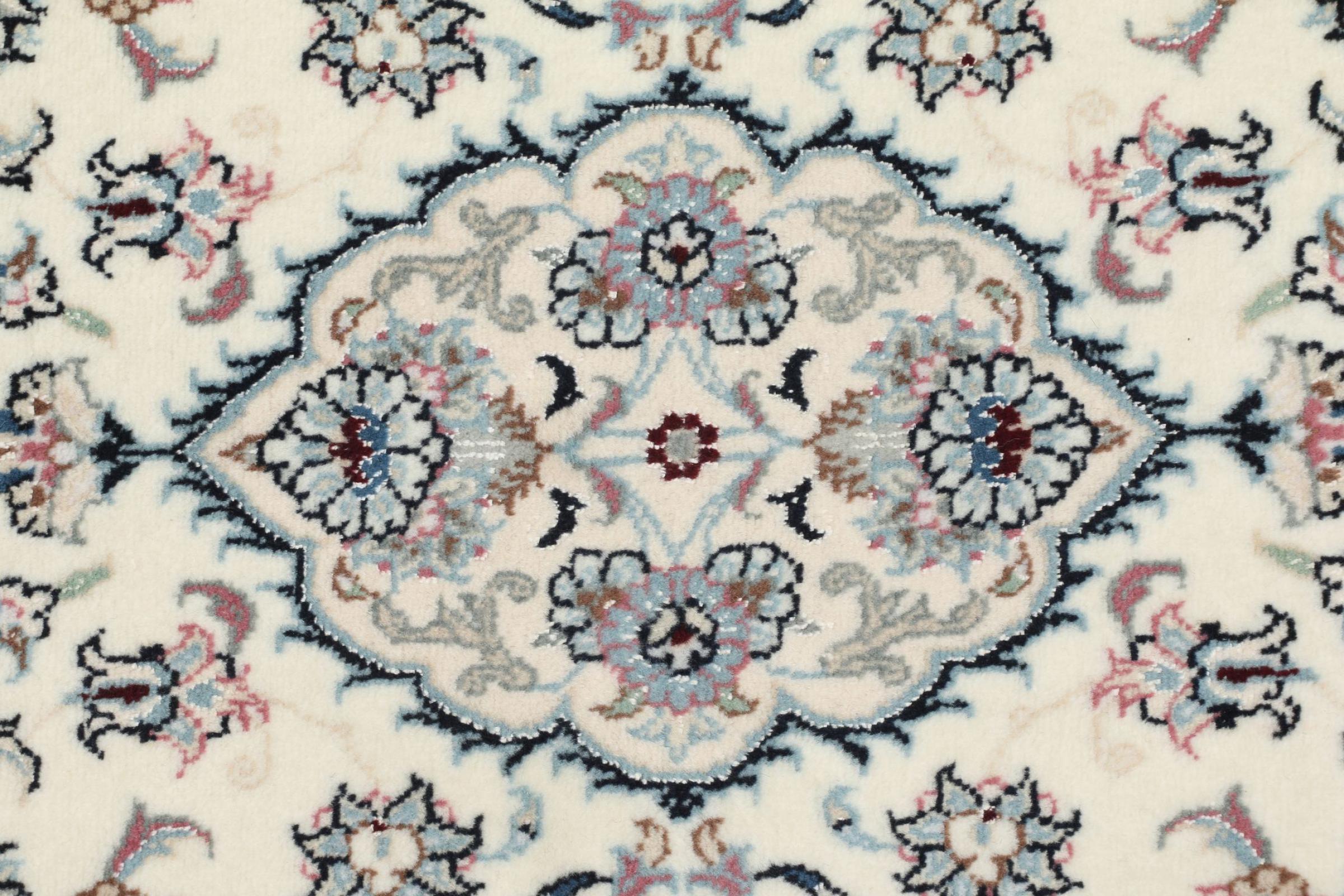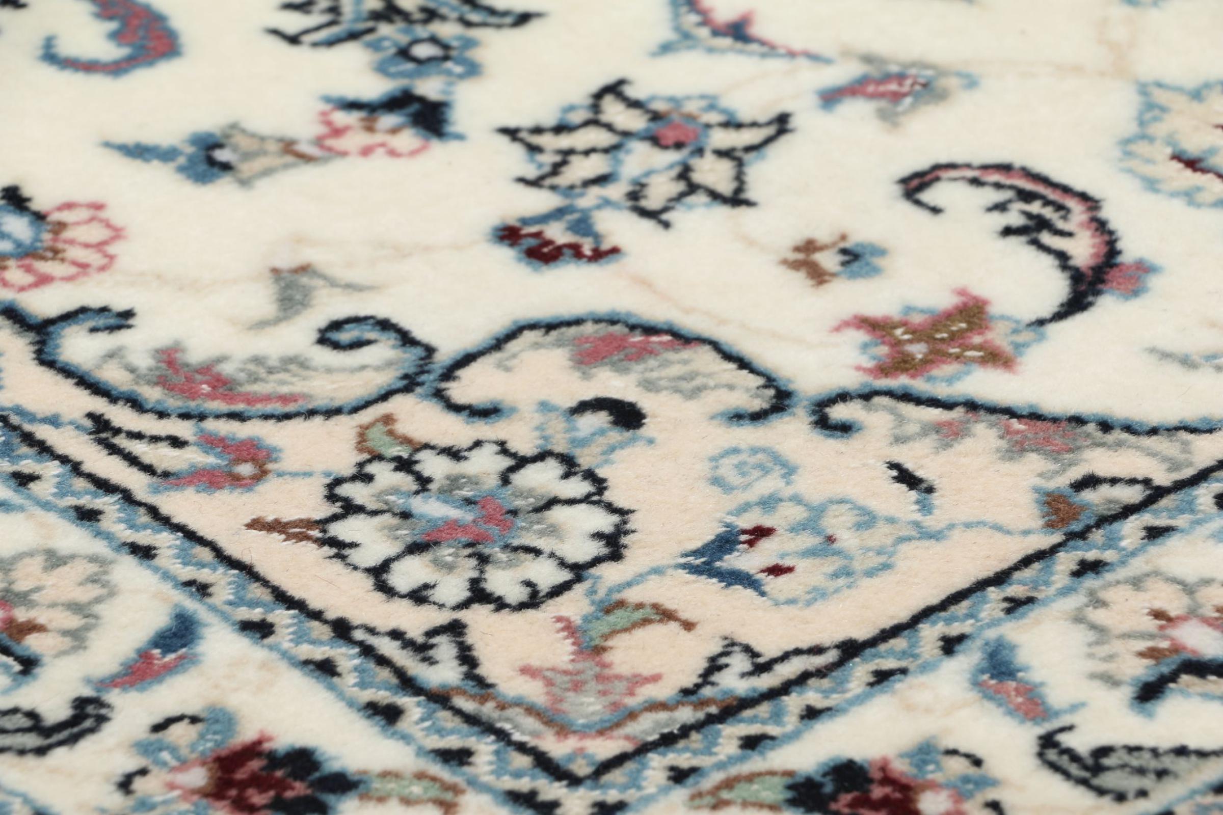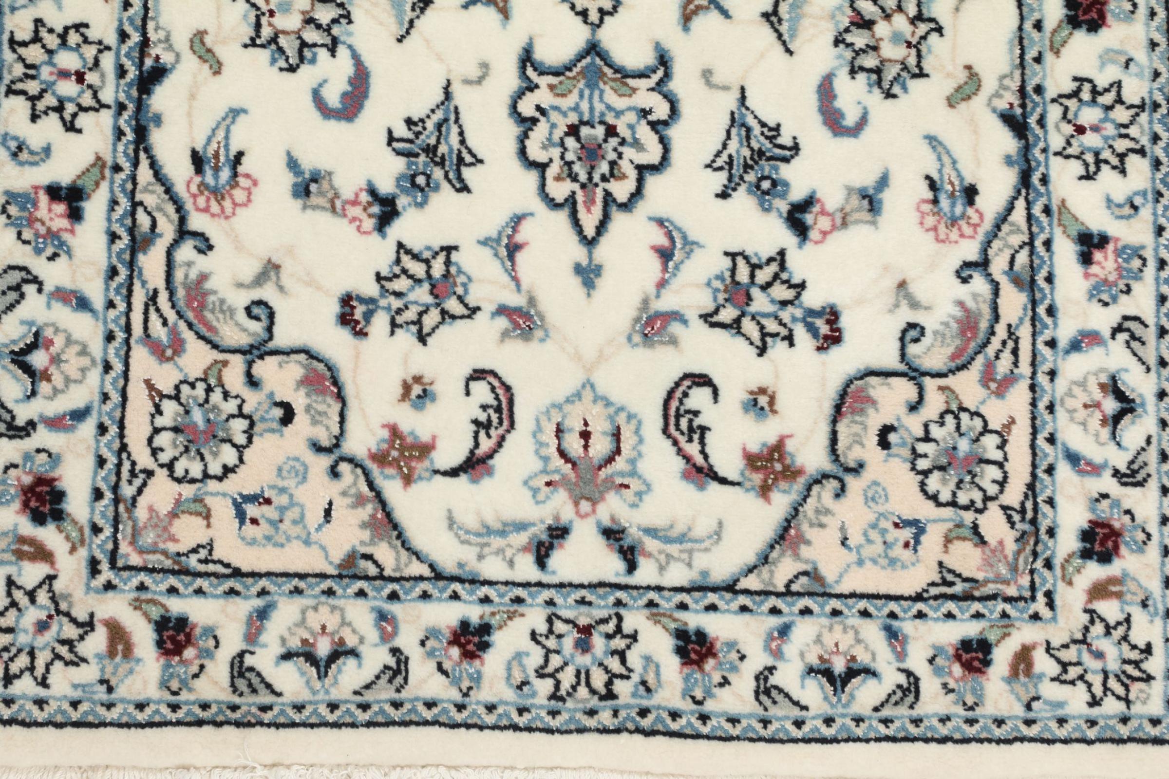 This Nain rug is classified as 9La. The excellent quality, the beautiful oriental design with its curvilinear patterns will delight every buyer. This Persian rug was hand-knotted in the city of Nain, which lies on the western edge of the Dasht-e-Kavir desert, from high-quality wool and natural silk. 9La Nain rugs are significantly finer than a 12La and already show beautiful details.