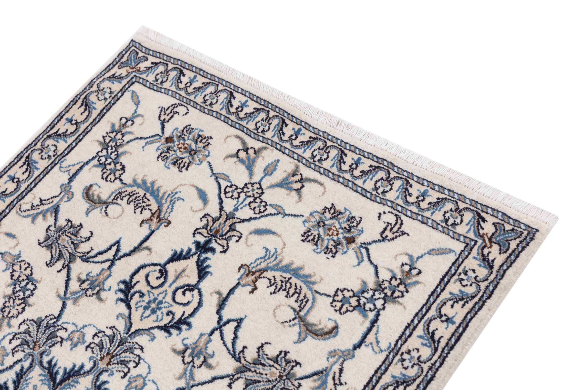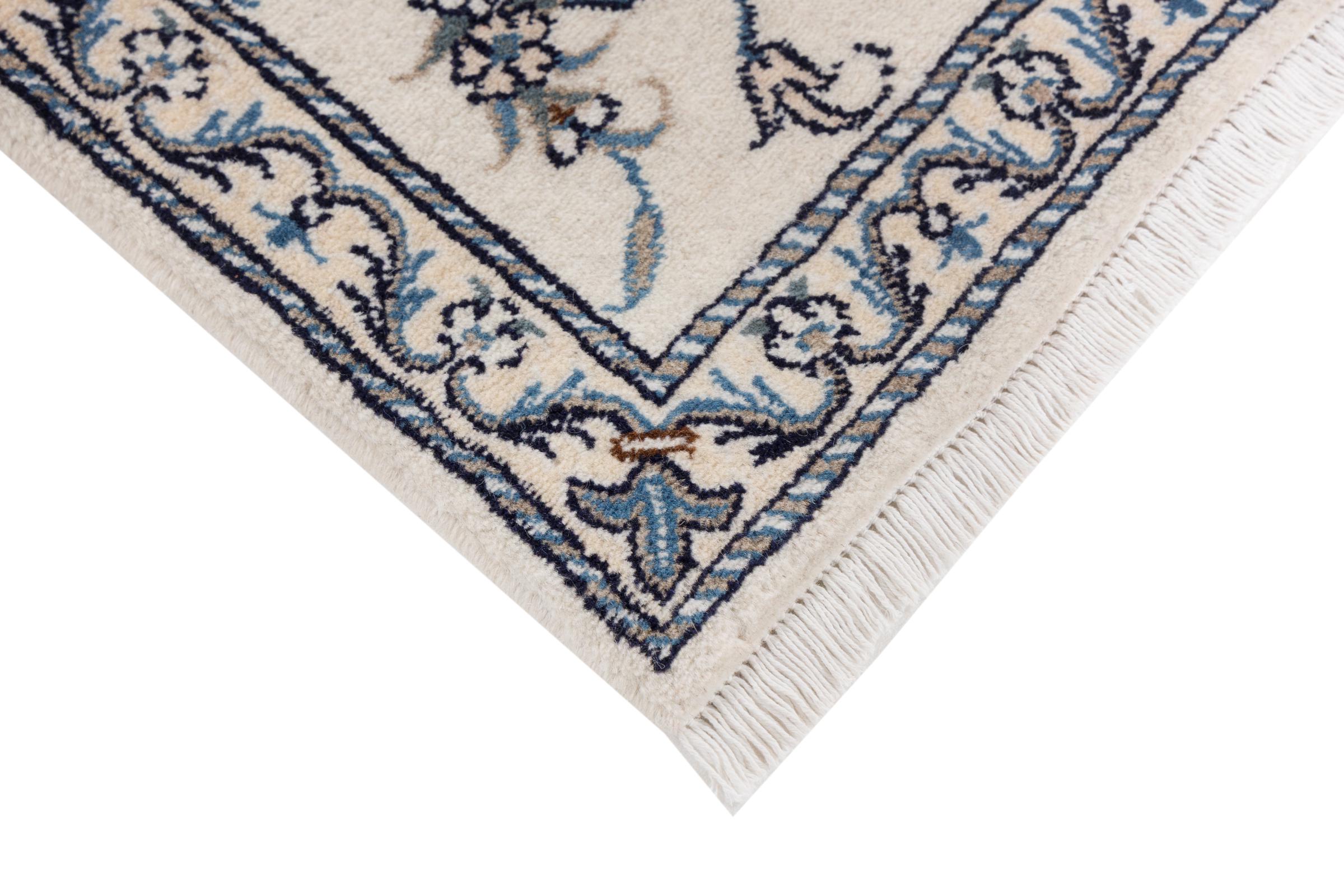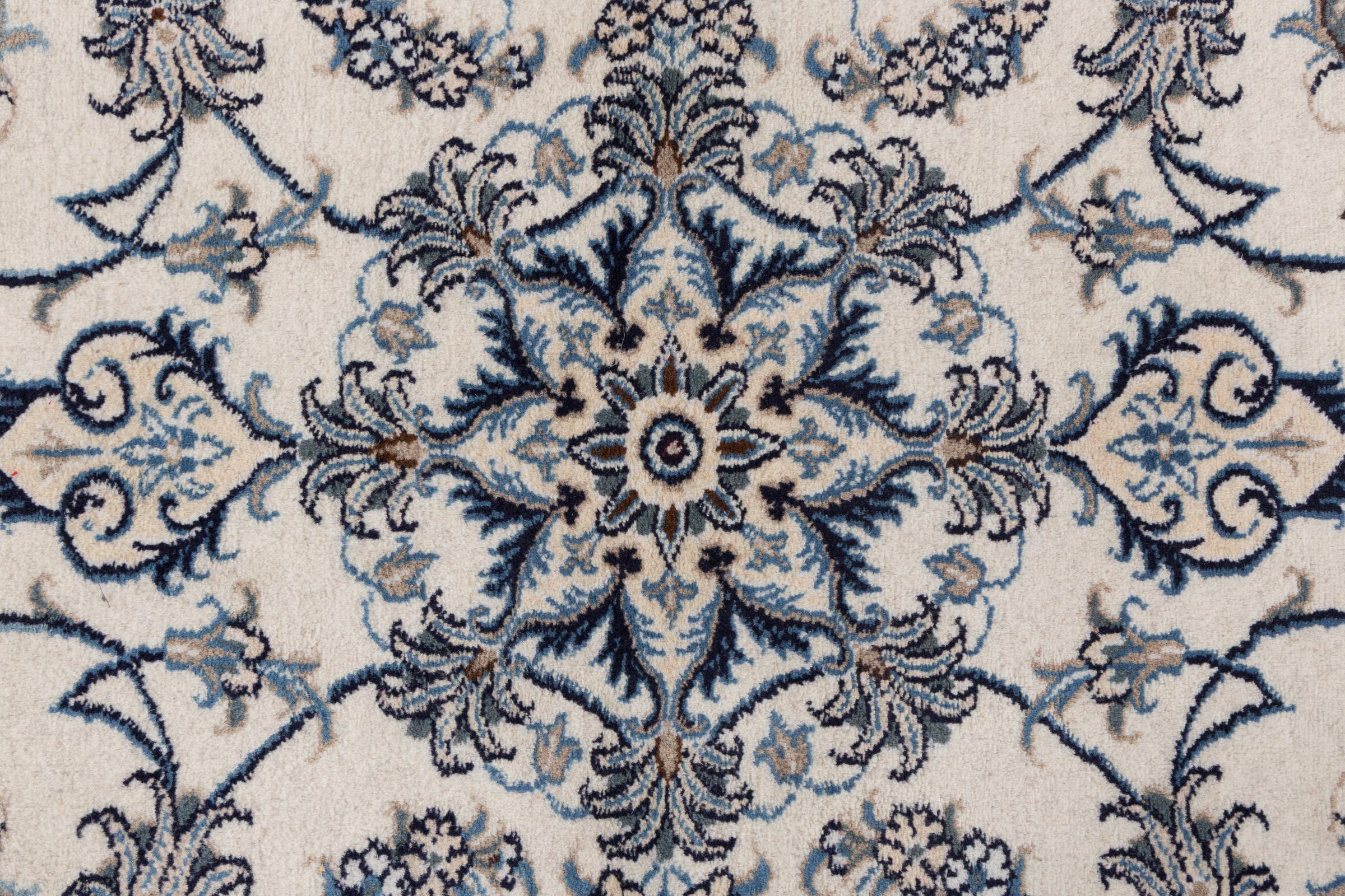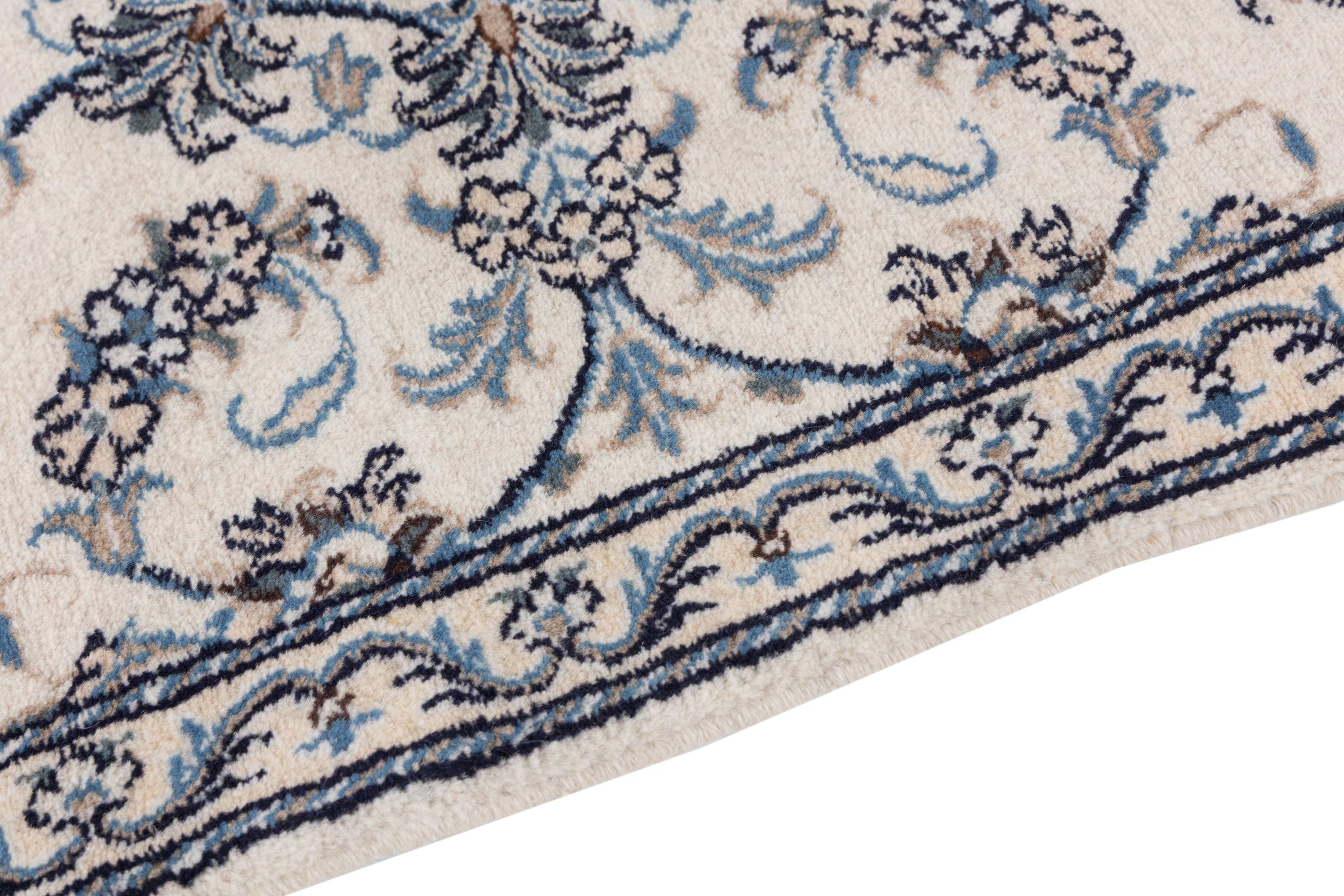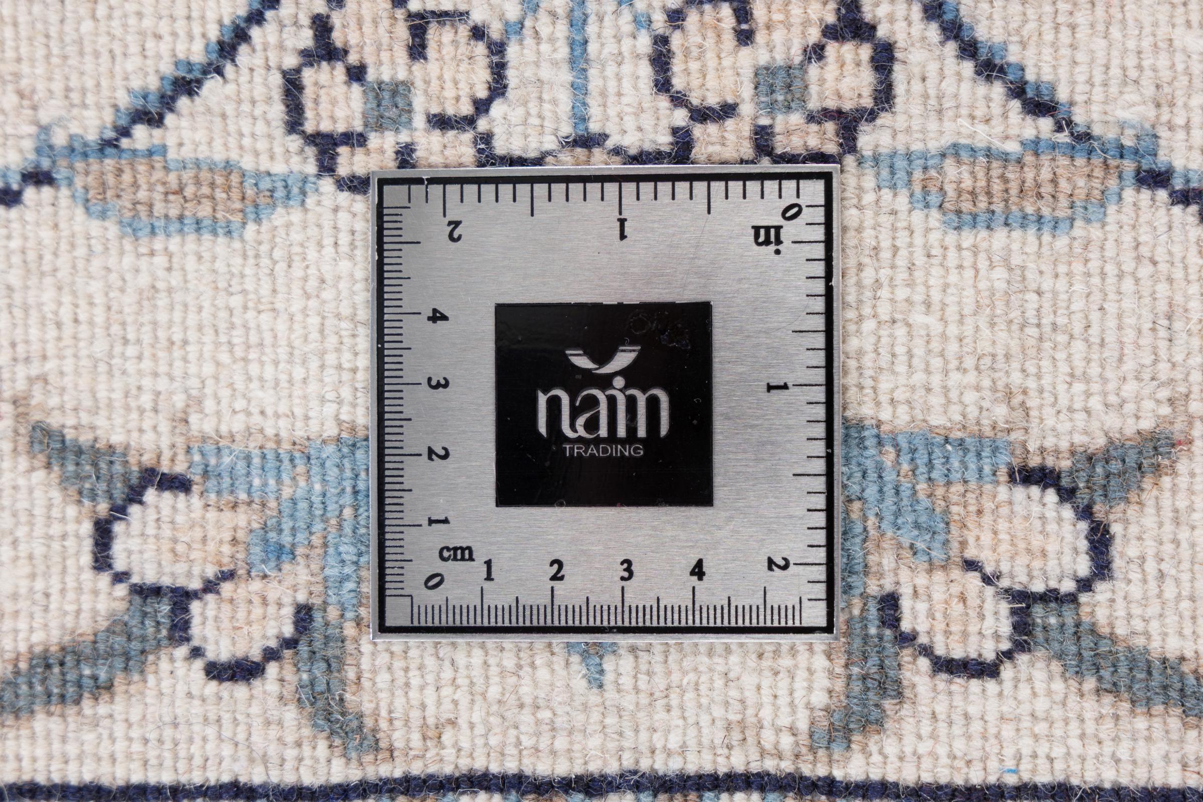 This Nain rug is classified as 12La. Its typical Nain colour scheme gives it an elegant and sophisticated look. This Persian rug was hand-knotted in the city of Nain, which lies on the western edge of the Dasht-e-Kavir desert, using high-quality wool and natural silk. At 12La, it is not as finely detailed with ornamentation as a Nain 9La or 6La.