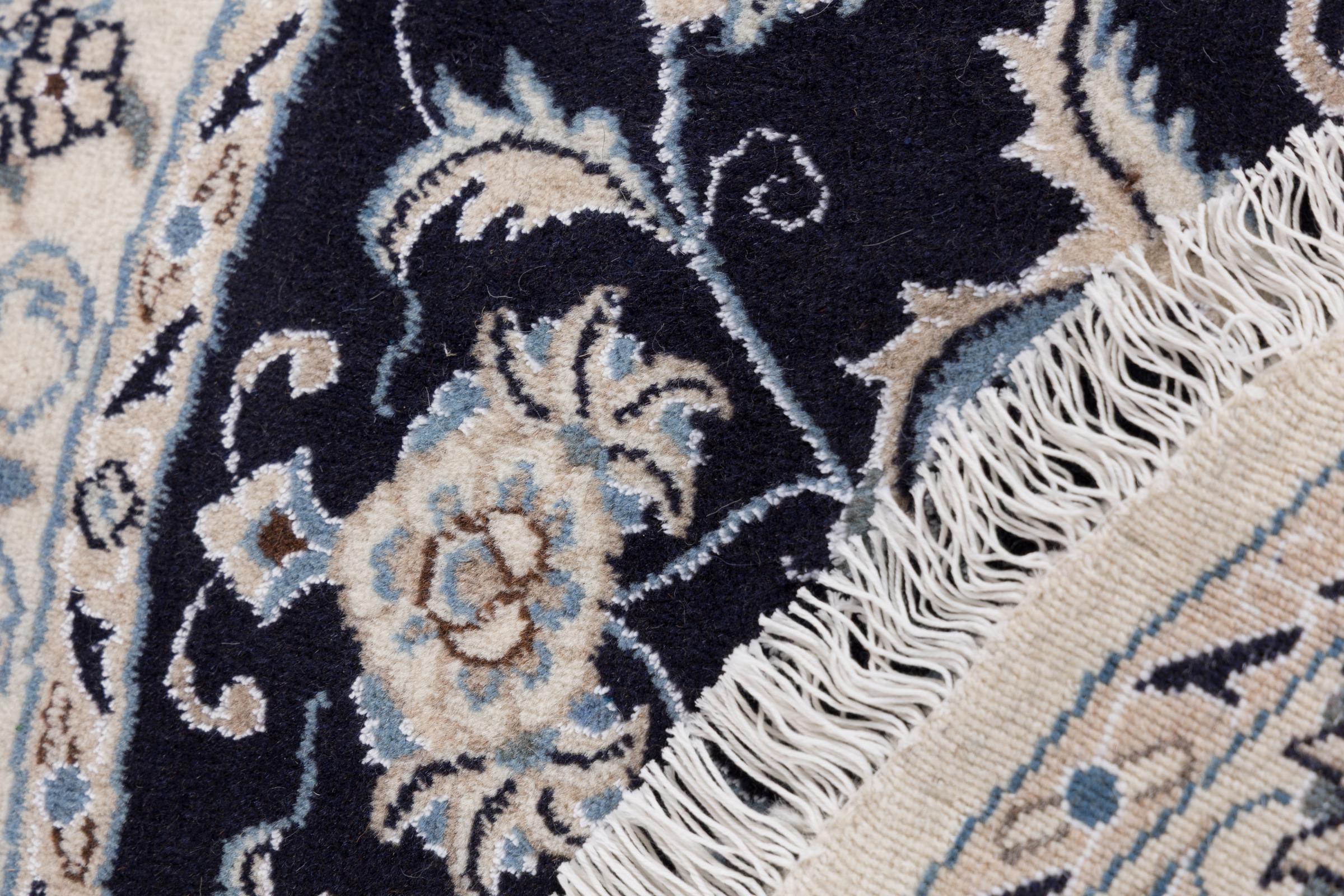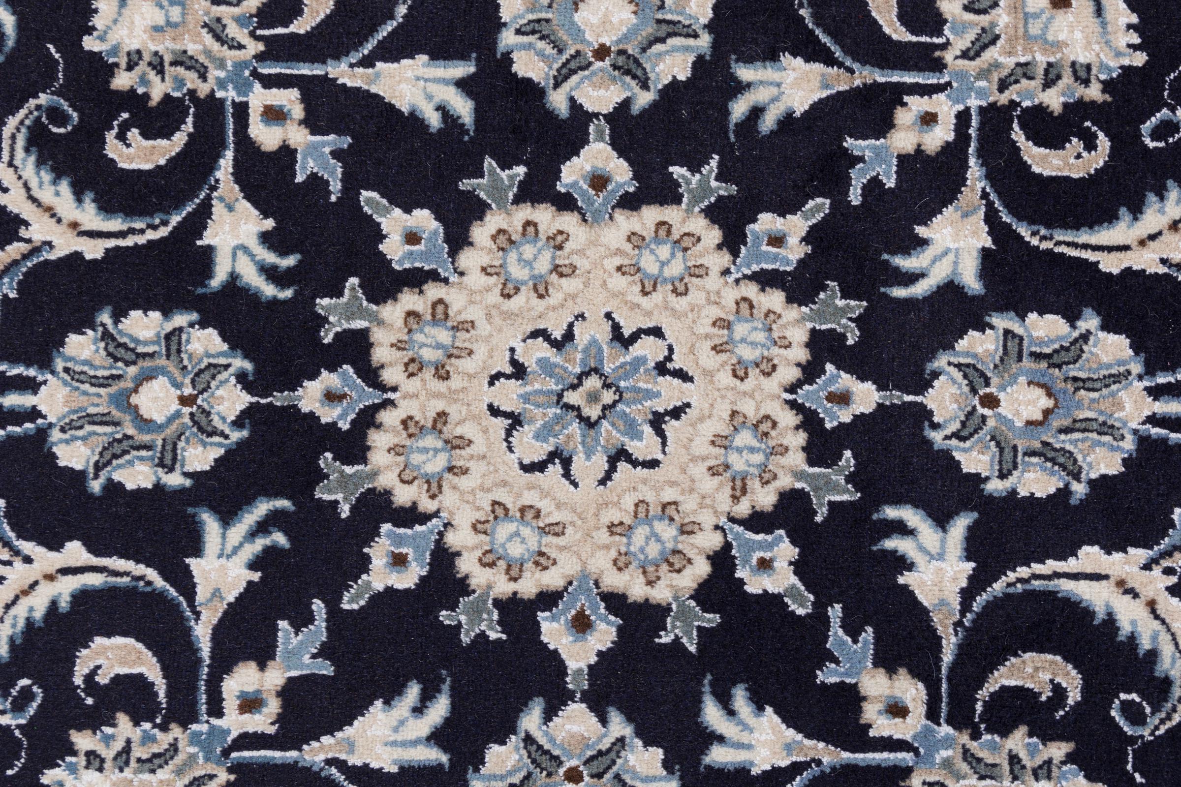 This Nain rug is classified as 12La. Its typical Nain colour scheme gives it an elegant and sophisticated look. This Persian rug was hand-knotted in the city of Nain, which lies on the western edge of the Dasht-e-Kavir desert, using high-quality wool and natural silk. At 12La, it is not as finely detailed with ornamentation as a Nain 9La or 6La.