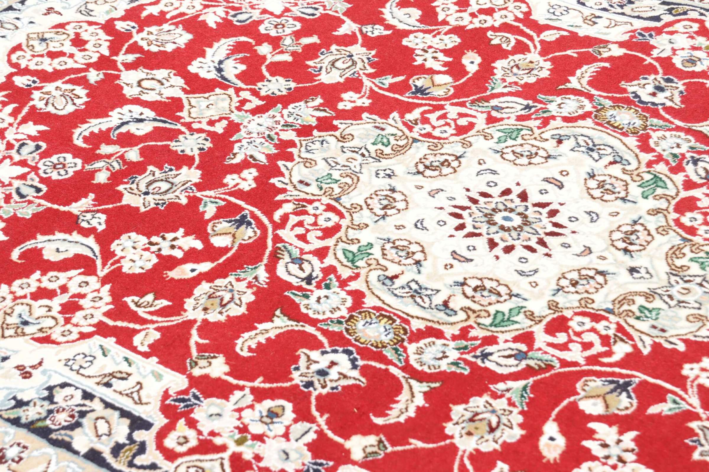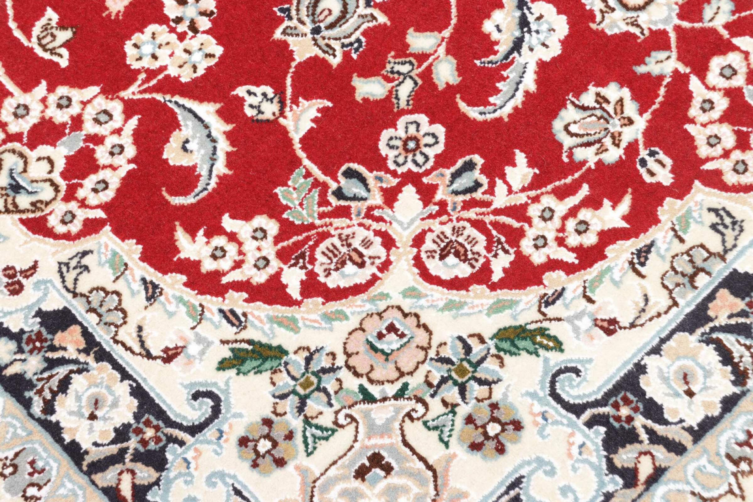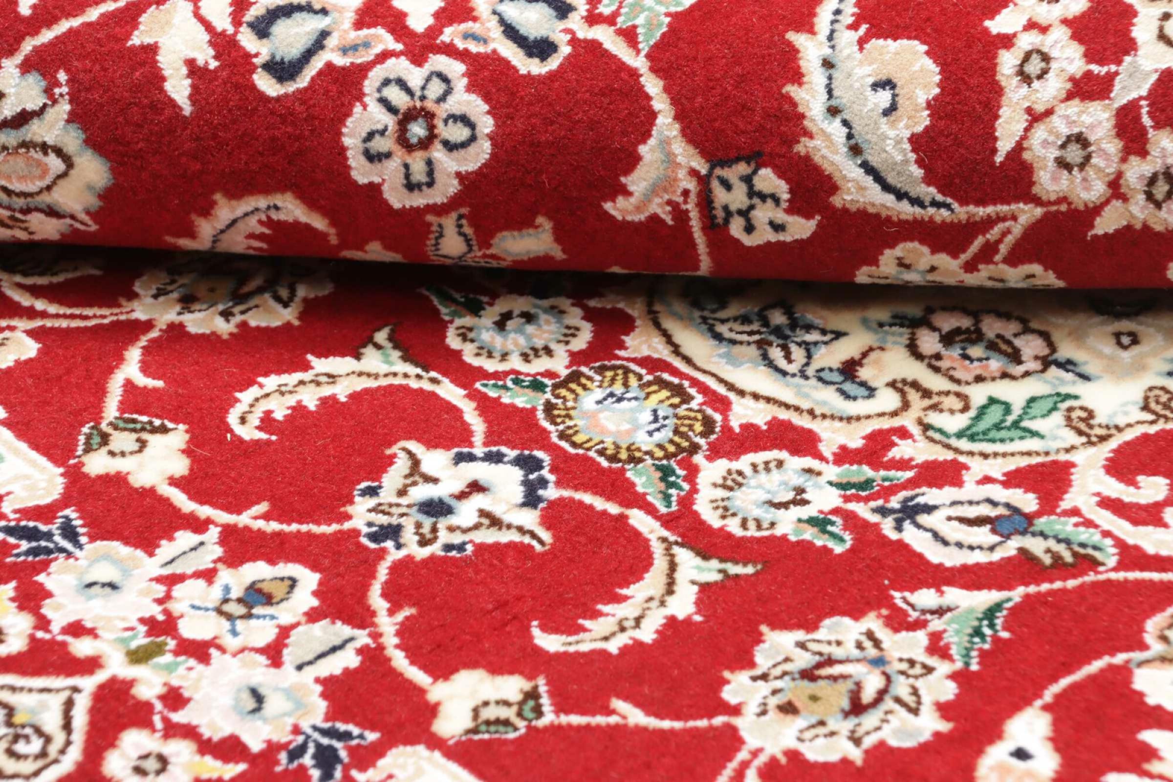 This Nain rug is classified as 9La. The excellent quality, the beautiful oriental design with its curvilinear patterns will delight every buyer. This Persian rug was hand-knotted in the city of Nain, which lies on the western edge of the Dasht-e-Kavir desert, from high-quality wool and natural silk. 9La Nain rugs are significantly finer than a 12La and already show beautiful details.