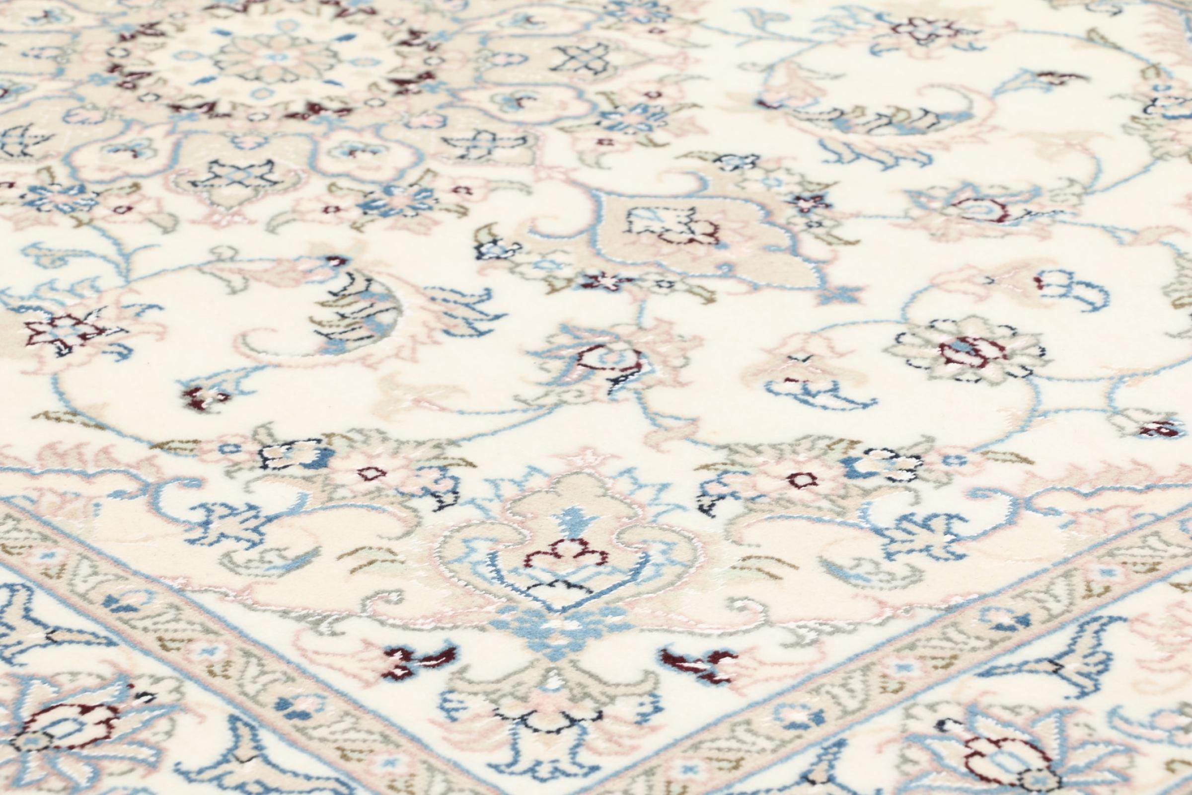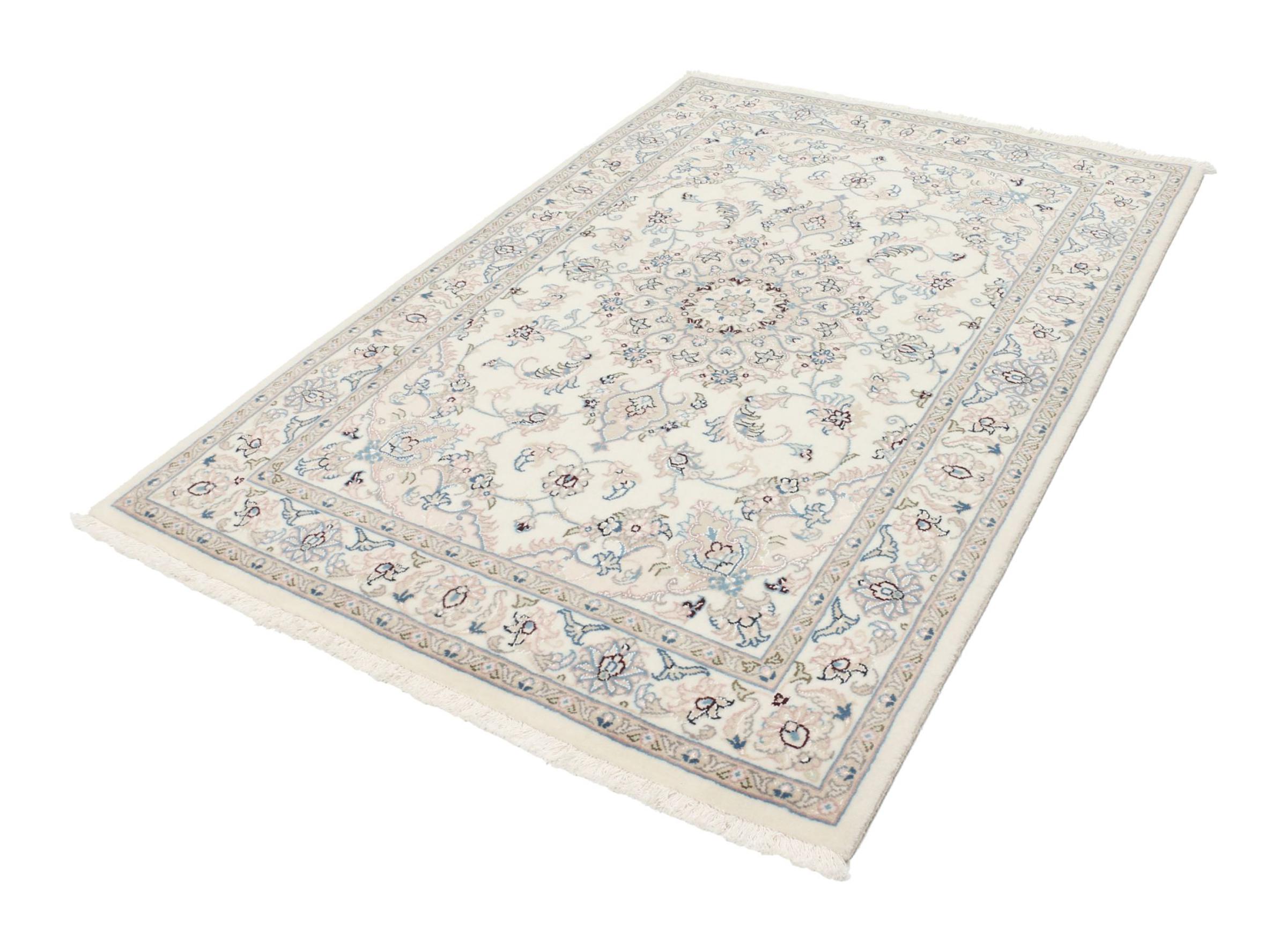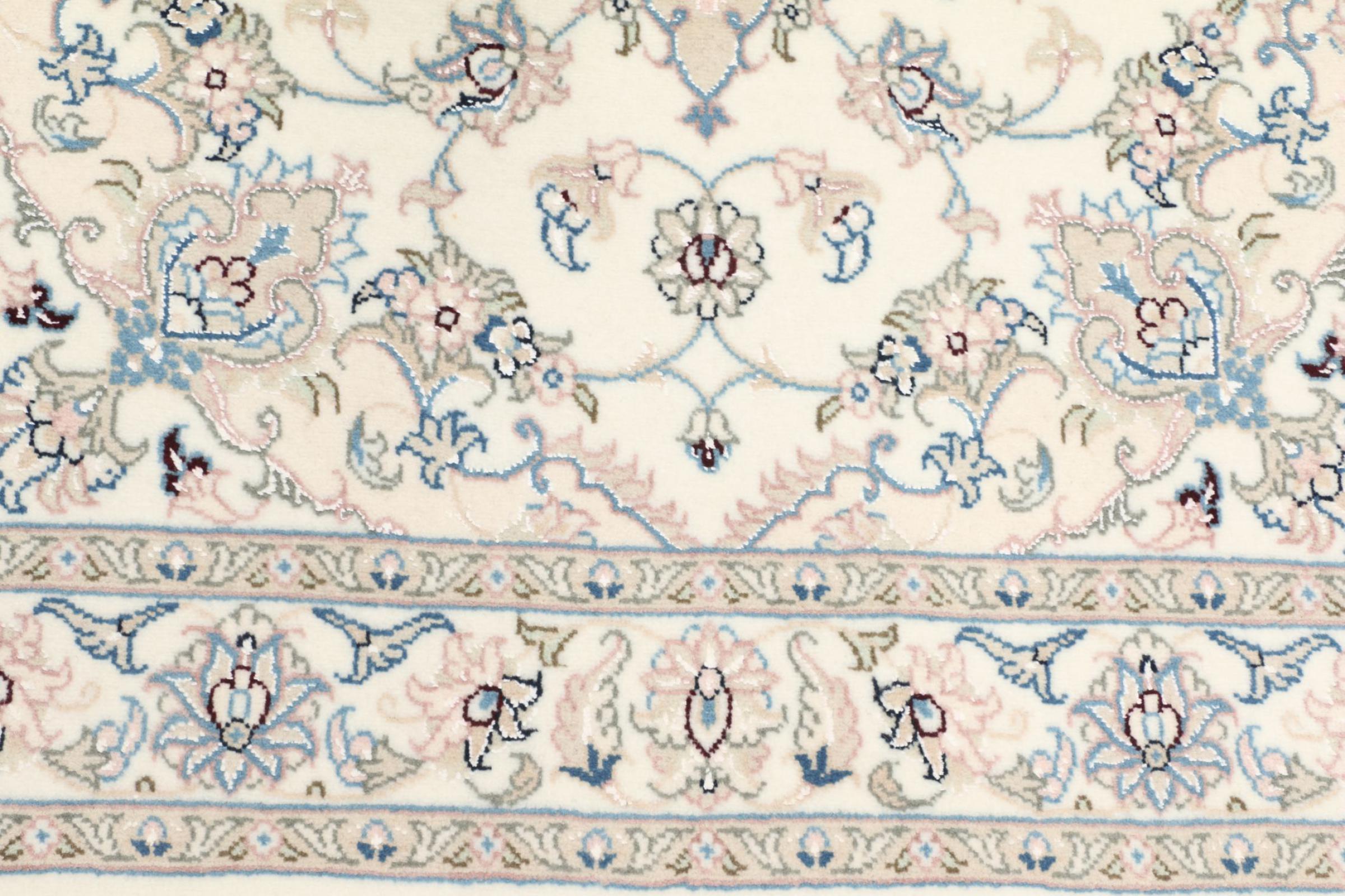 This Nain rug is classified as 9La. The excellent quality, the beautiful oriental design with its curvilinear patterns will delight every buyer. This Persian rug was hand-knotted in the city of Nain, which lies on the western edge of the Dasht-e-Kavir desert, from high-quality wool and natural silk. 9La Nain rugs are significantly finer than a 12La and already show beautiful details.