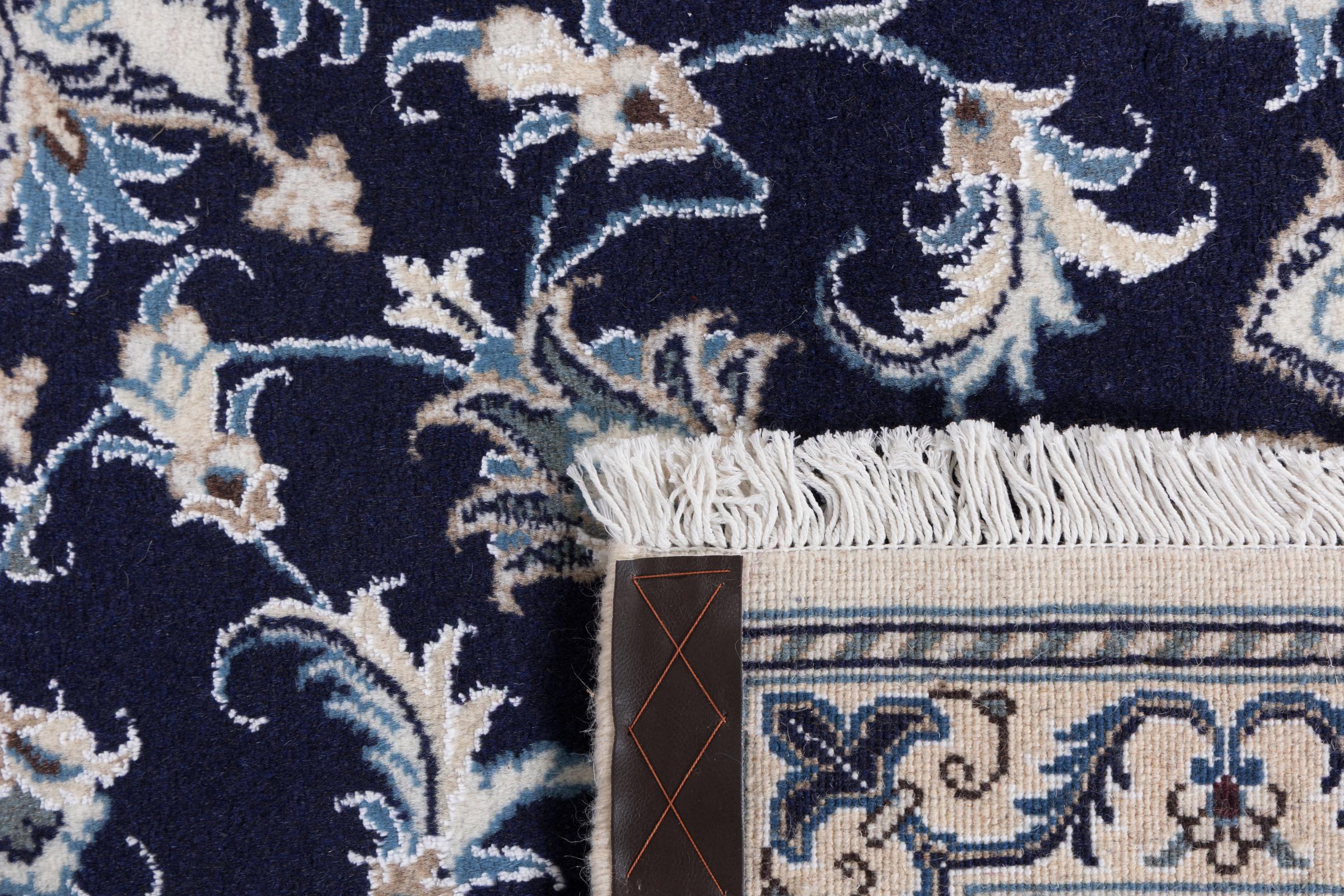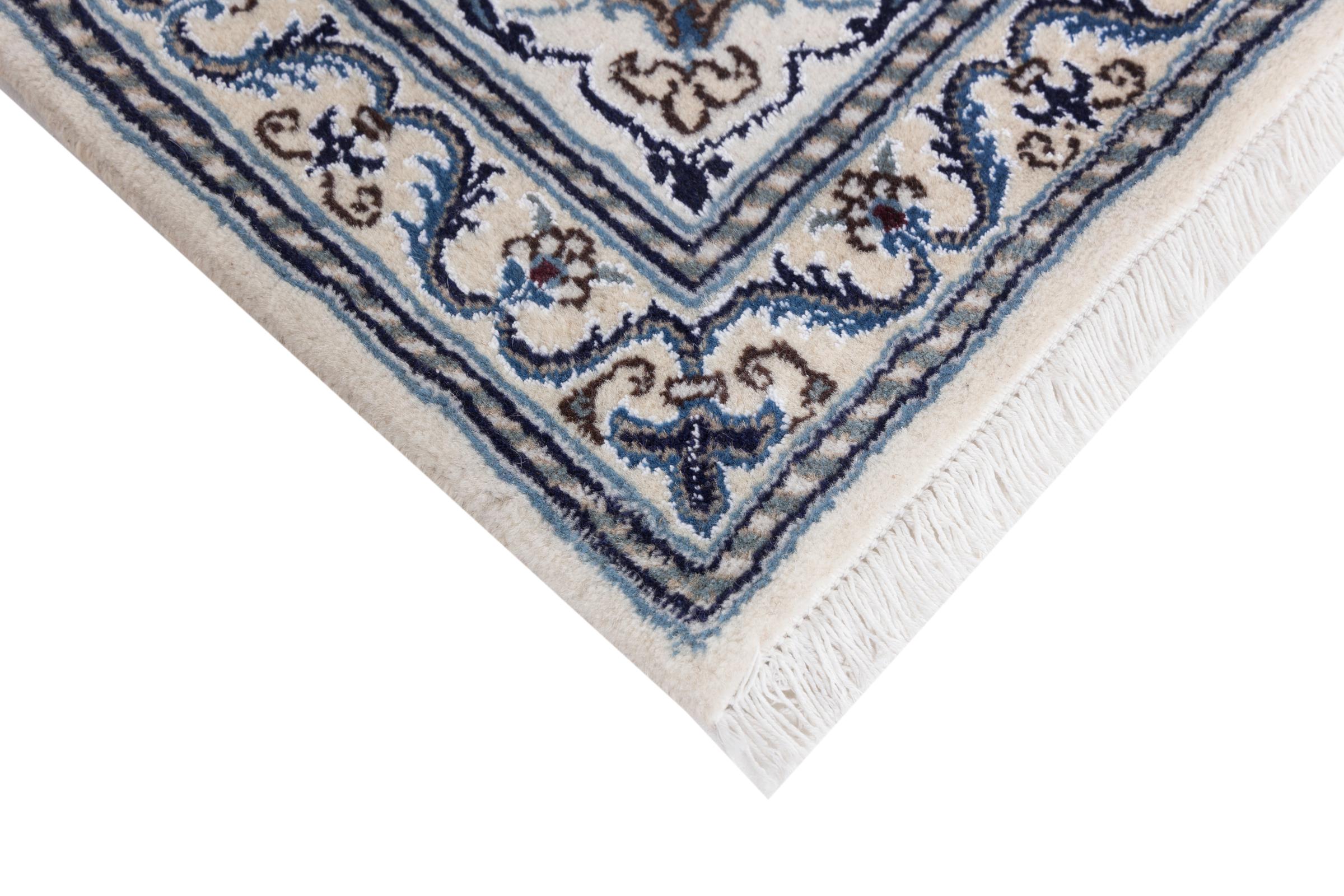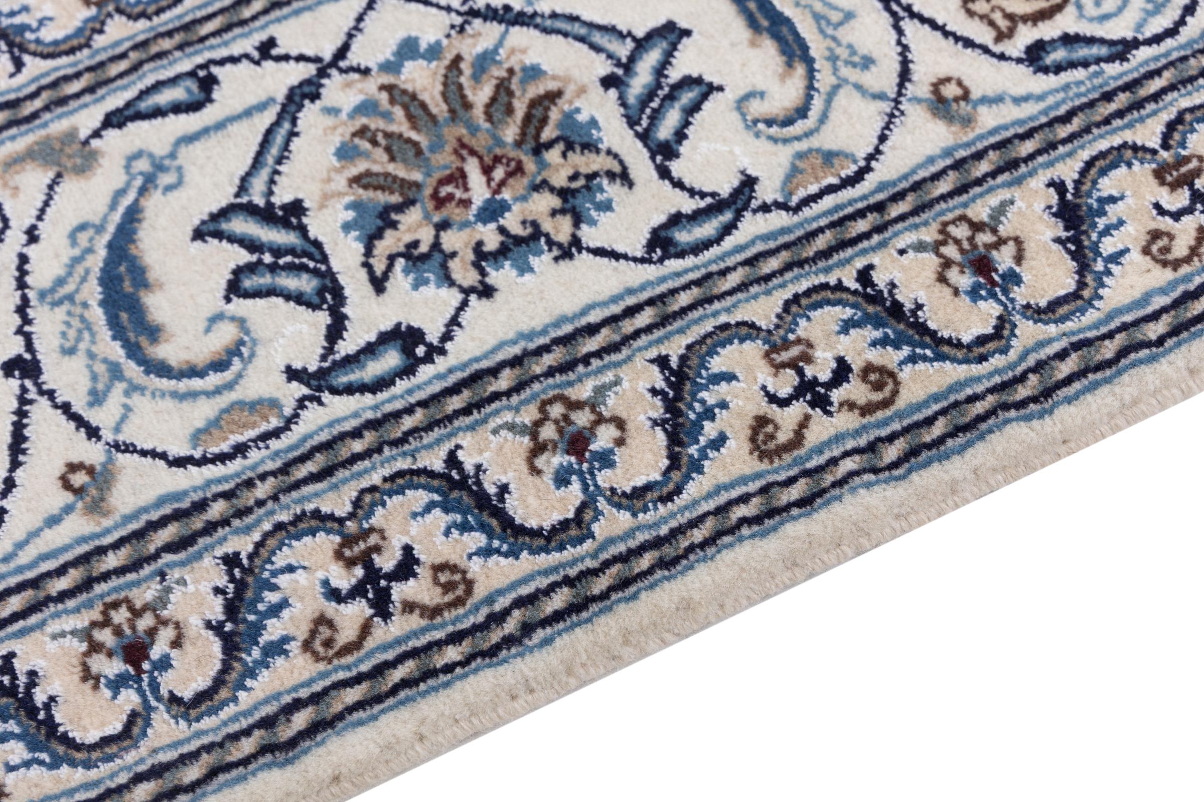 This Nain rug is classified as 12La. Its typical Nain colour scheme gives it an elegant and sophisticated look. This Persian rug was hand-knotted in the city of Nain, which lies on the western edge of the Dasht-e-Kavir desert, using high-quality wool and natural silk. At 12La, it is not as finely detailed with ornamentation as a Nain 9La or 6La.
