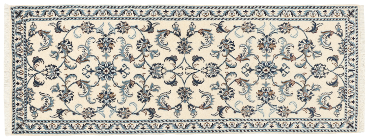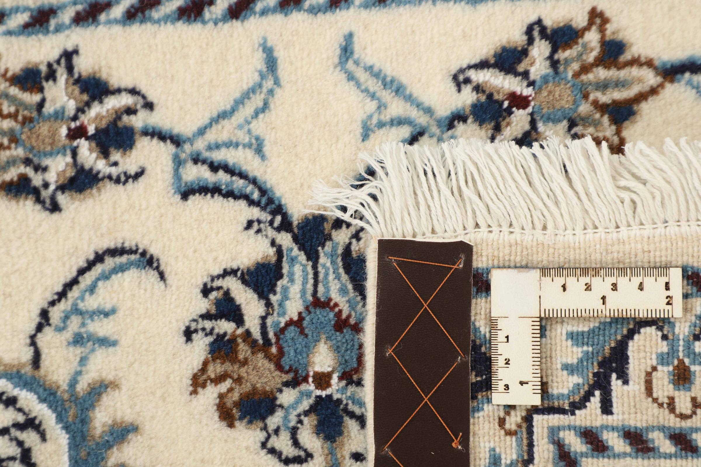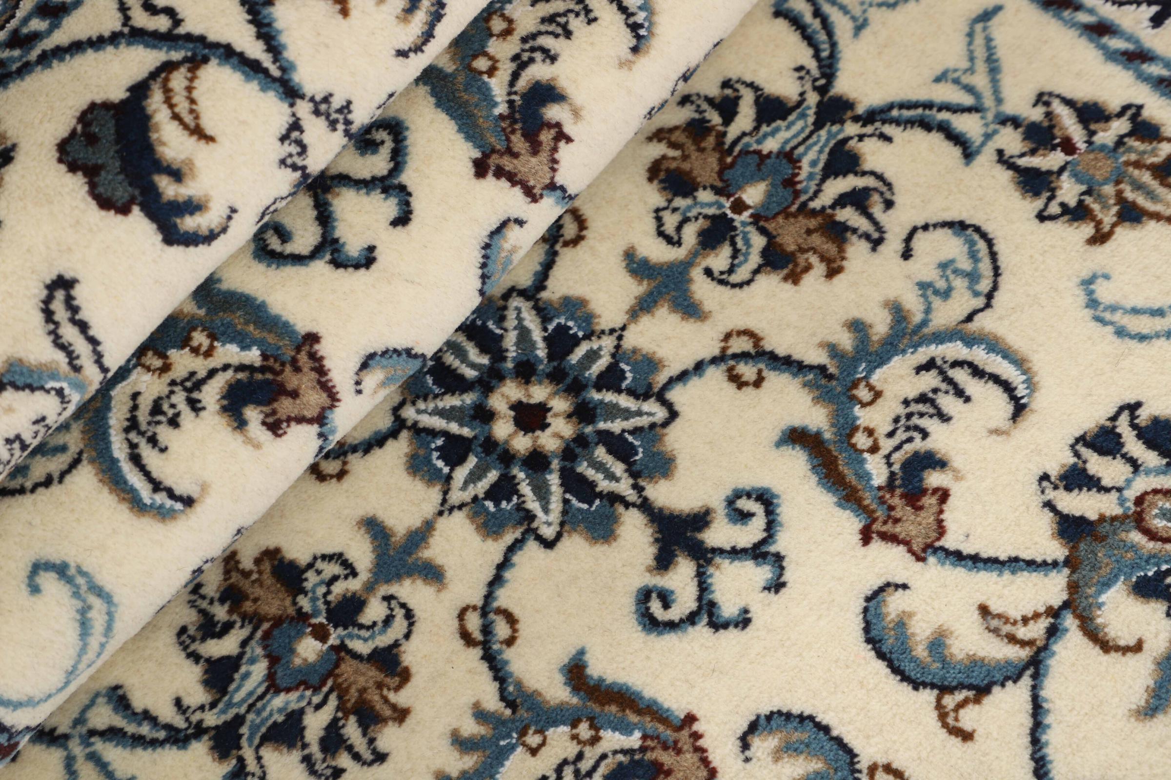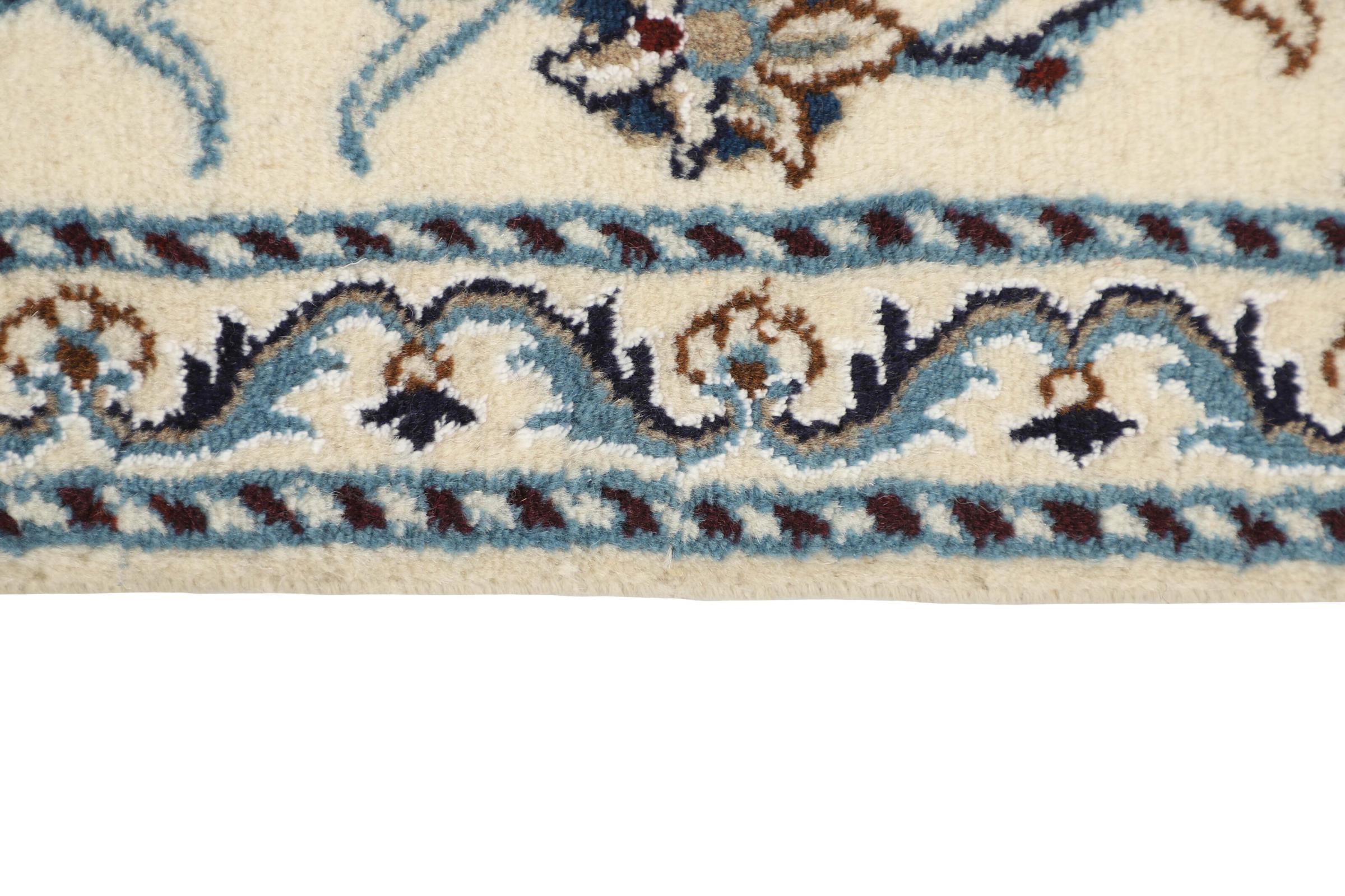 This Nain rug is classified as 12La. Its typical Nain colour scheme gives it an elegant and sophisticated look. This Persian rug was hand-knotted in the city of Nain, which lies on the western edge of the Dasht-e-Kavir desert, using high-quality wool and natural silk. At 12La, it is not as finely detailed with ornamentation as a Nain 9La or 6La.